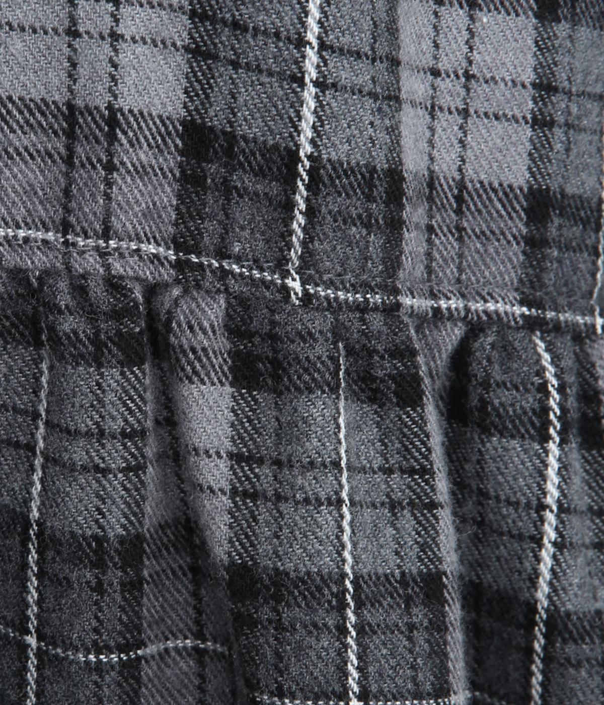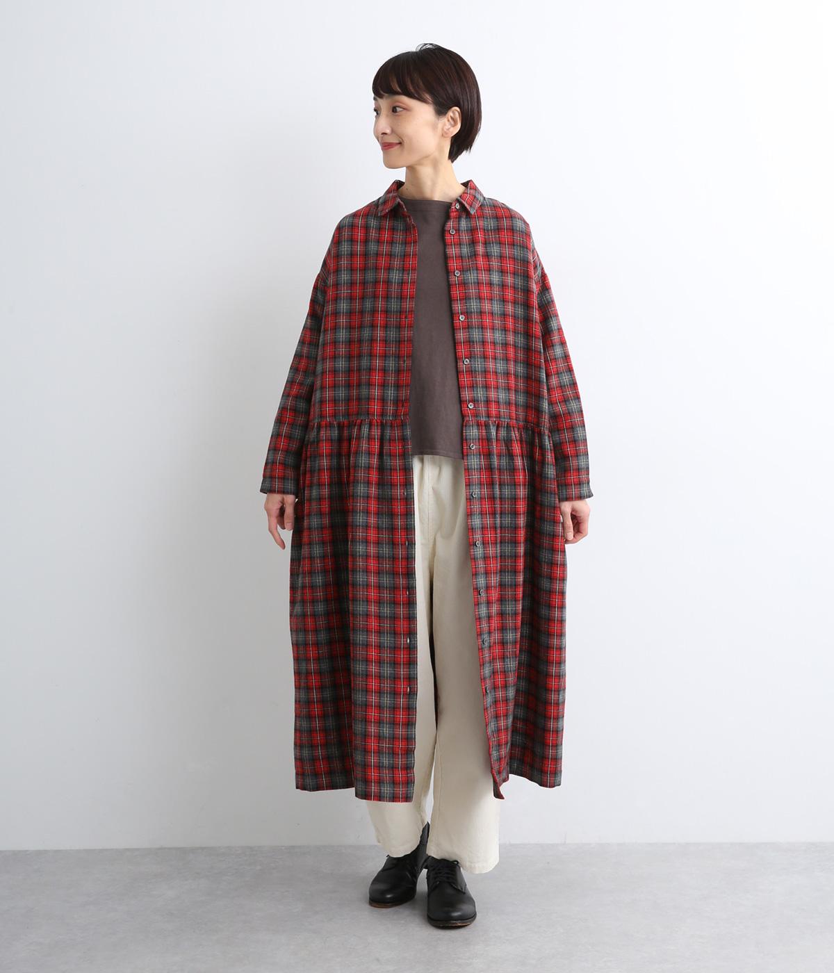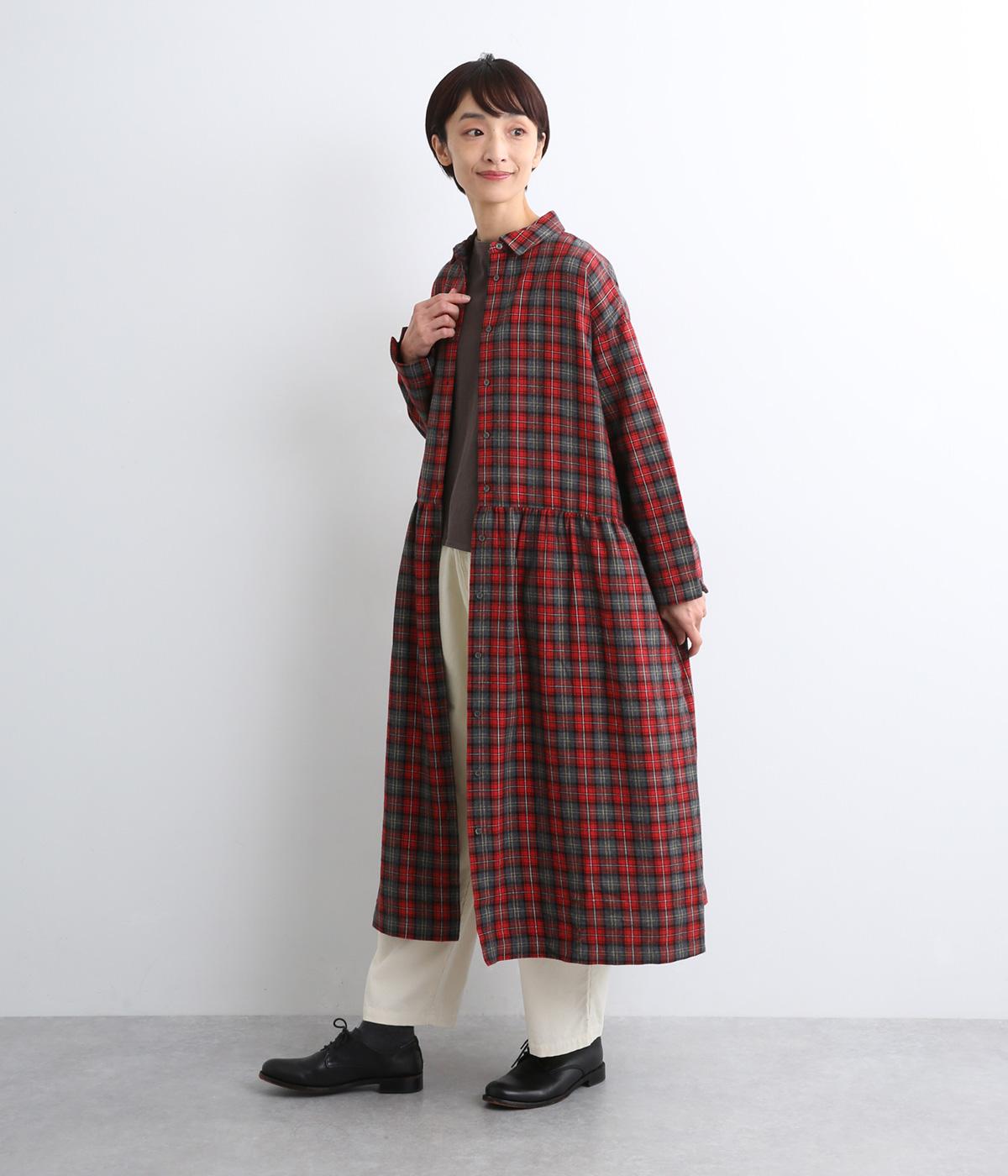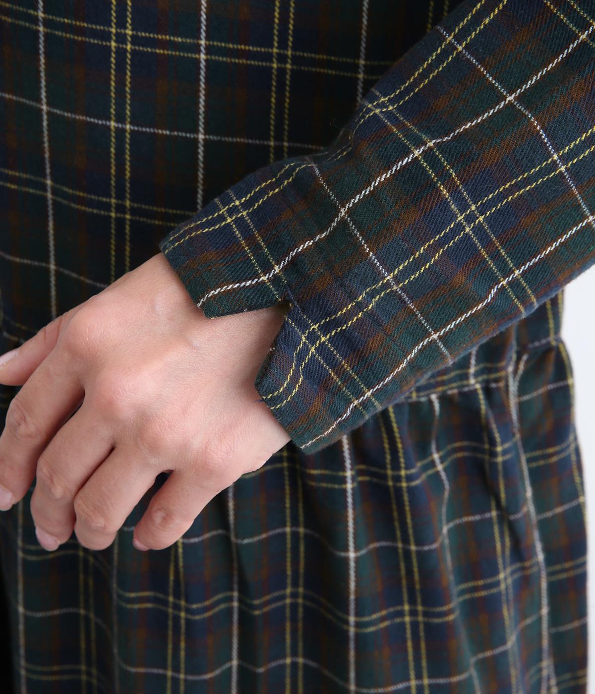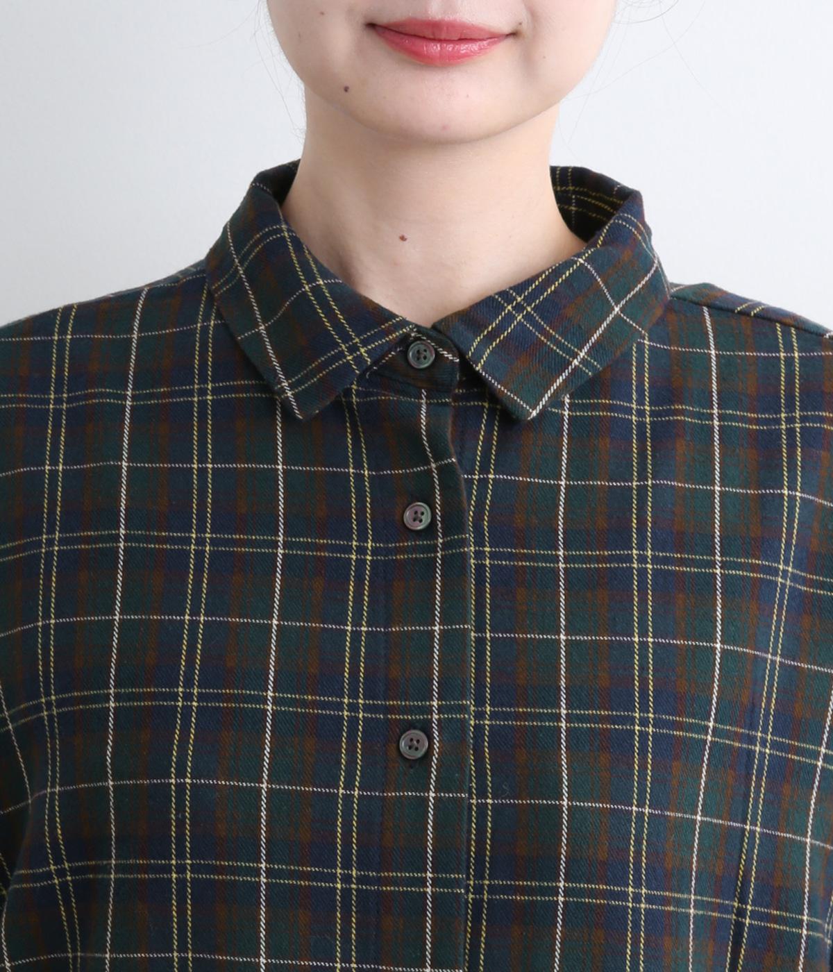 起毛がかった表面とチェック柄があたたかみを感じさせるコットンレーヨン生地。厚みをおさえた軽くてやわらかな風合いで、ストレスフリーに着ていただけます。