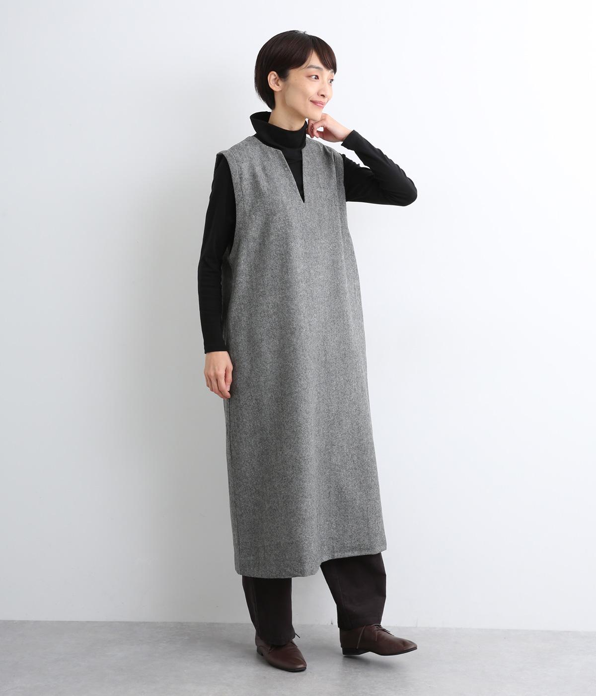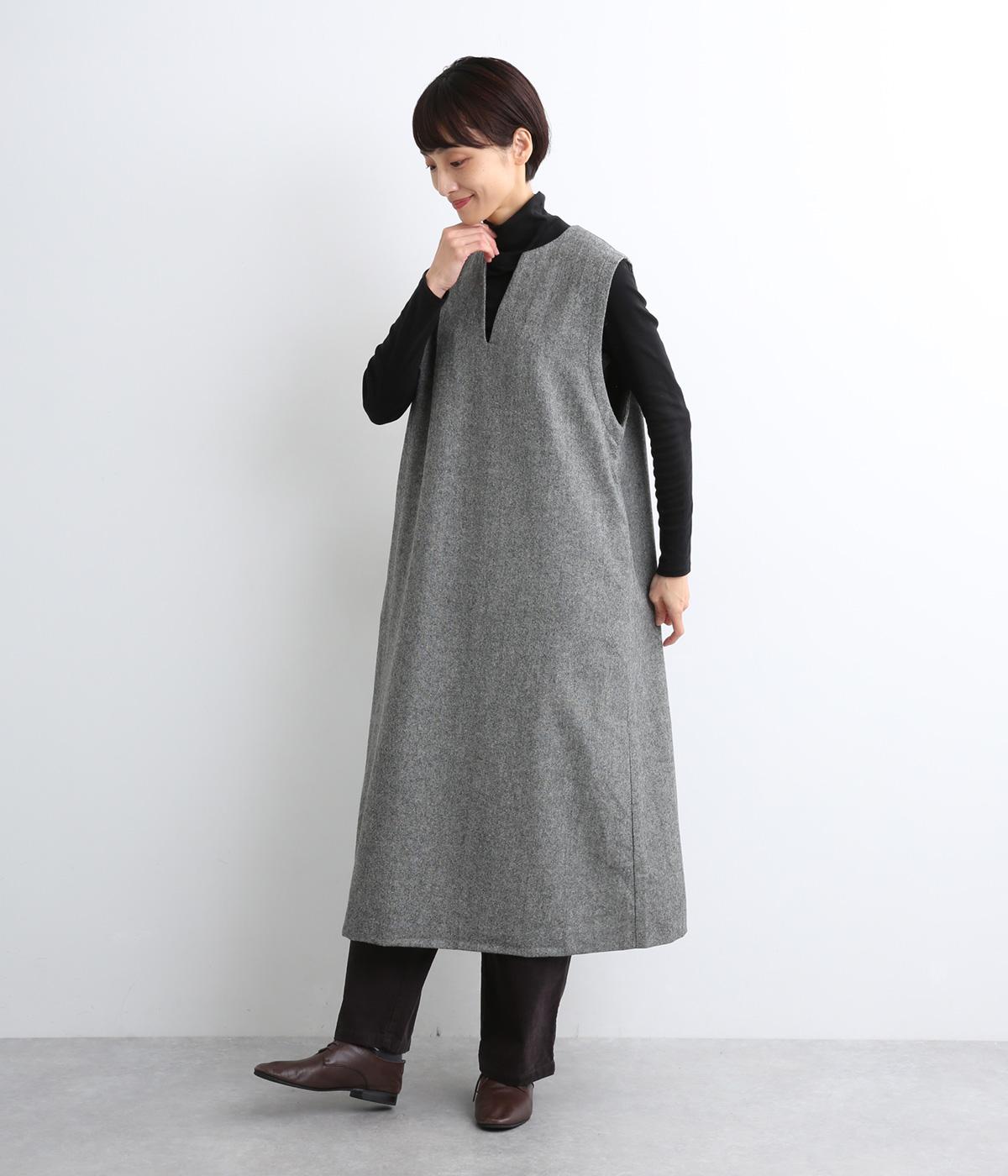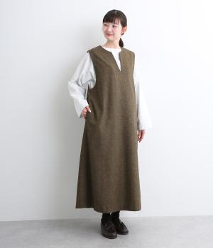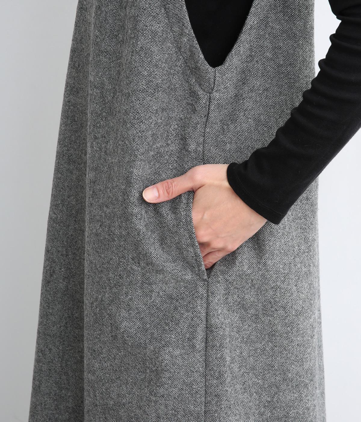 緩やかに広がるAラインのシルエットで大人フェミニンなムードを演出したジャンパースカート。深めのキーネックが首元に抜け感を与え、インナーのデザインを映えさせます。コーディネート次第で異なる表情をたのしめるシンプルさが◎。便利なサイドポケットつきです。