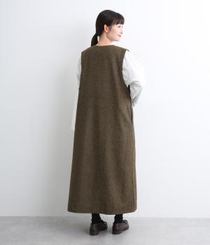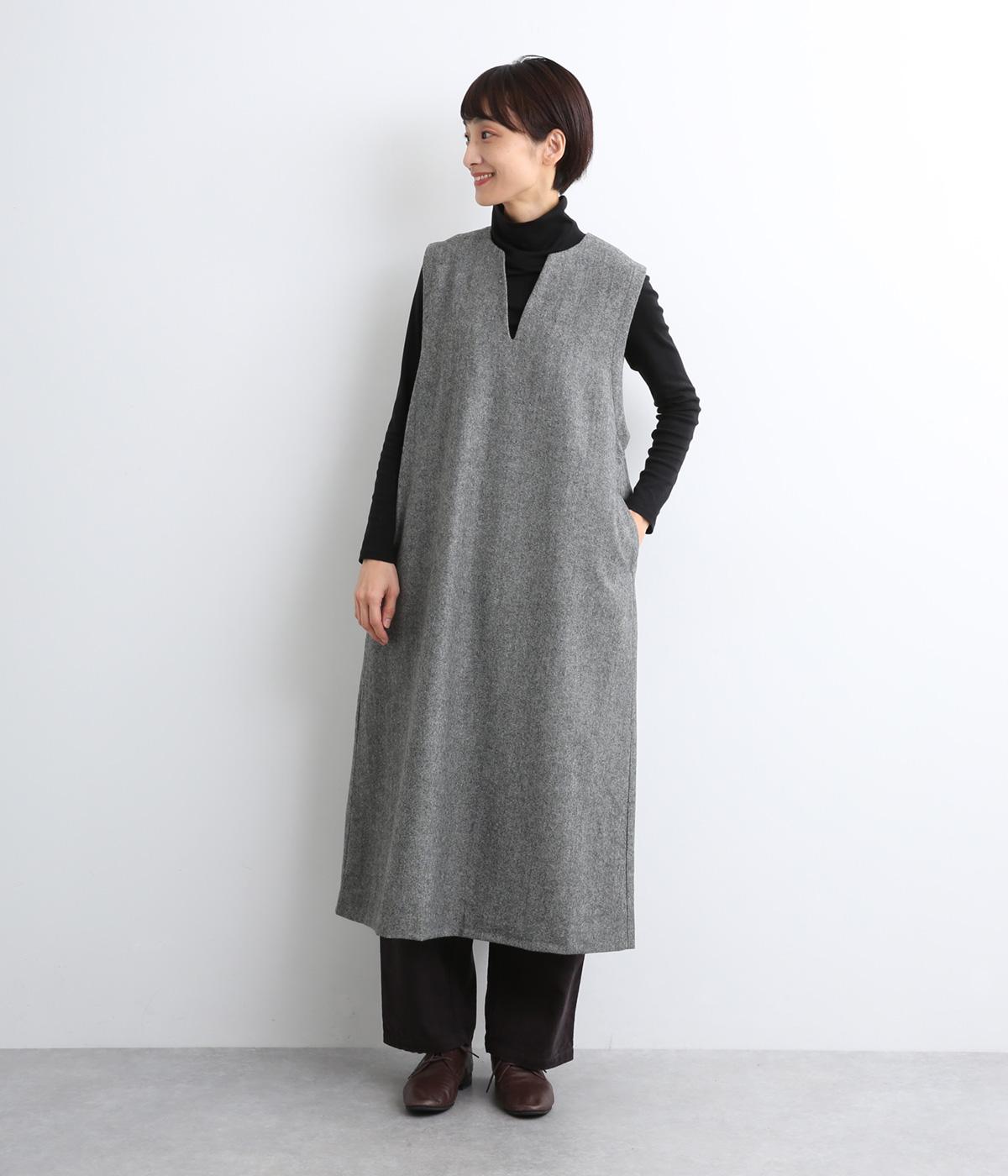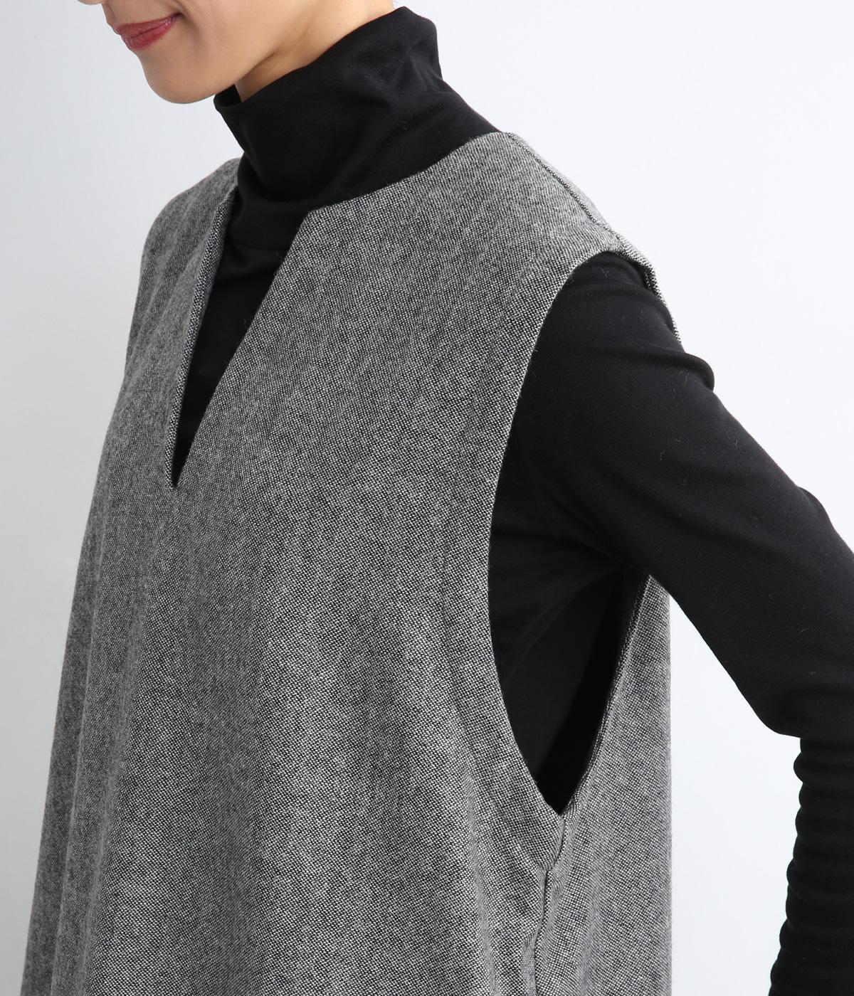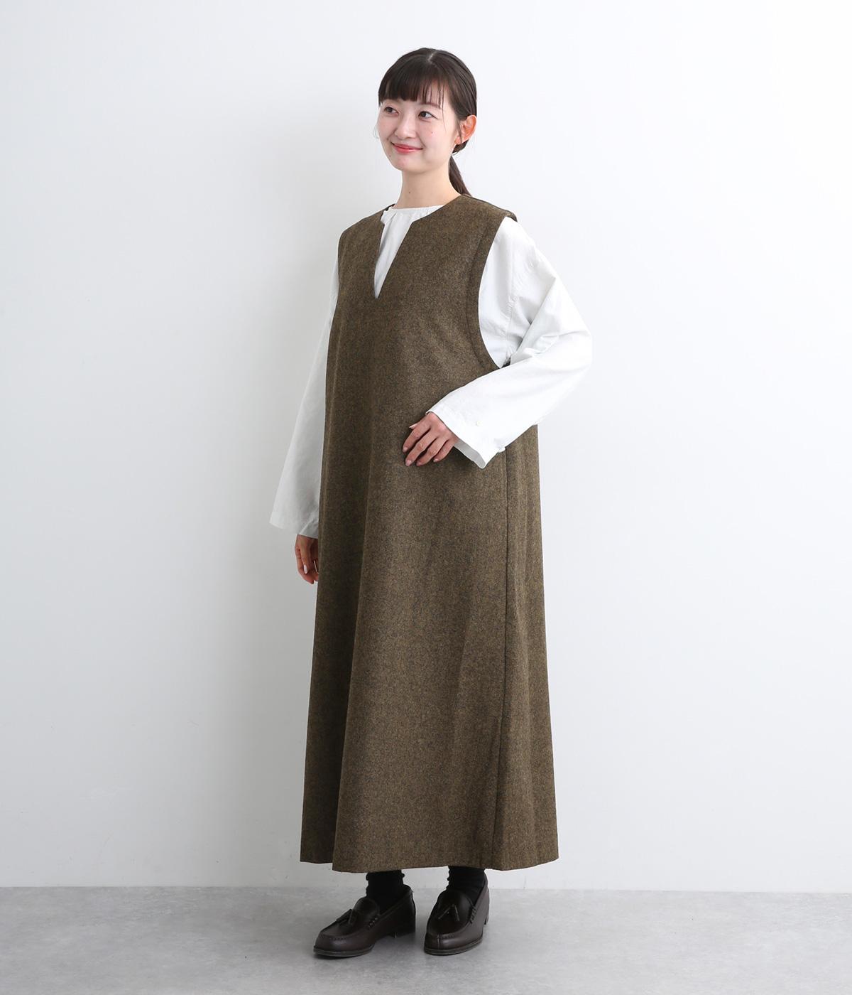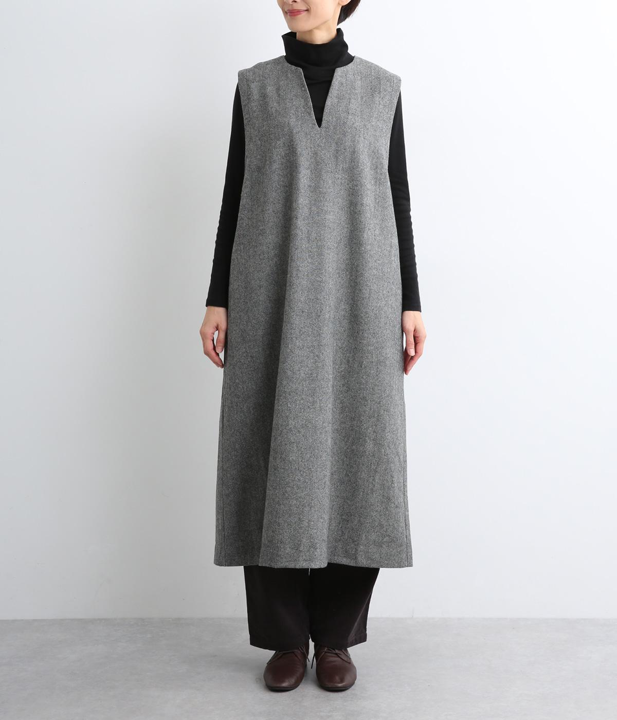 緩やかに広がるAラインのシルエットで大人フェミニンなムードを演出したジャンパースカート。深めのキーネックが首元に抜け感を与え、インナーのデザインを映えさせます。コーディネート次第で異なる表情をたのしめるシンプルさが◎。便利なサイドポケットつきです。