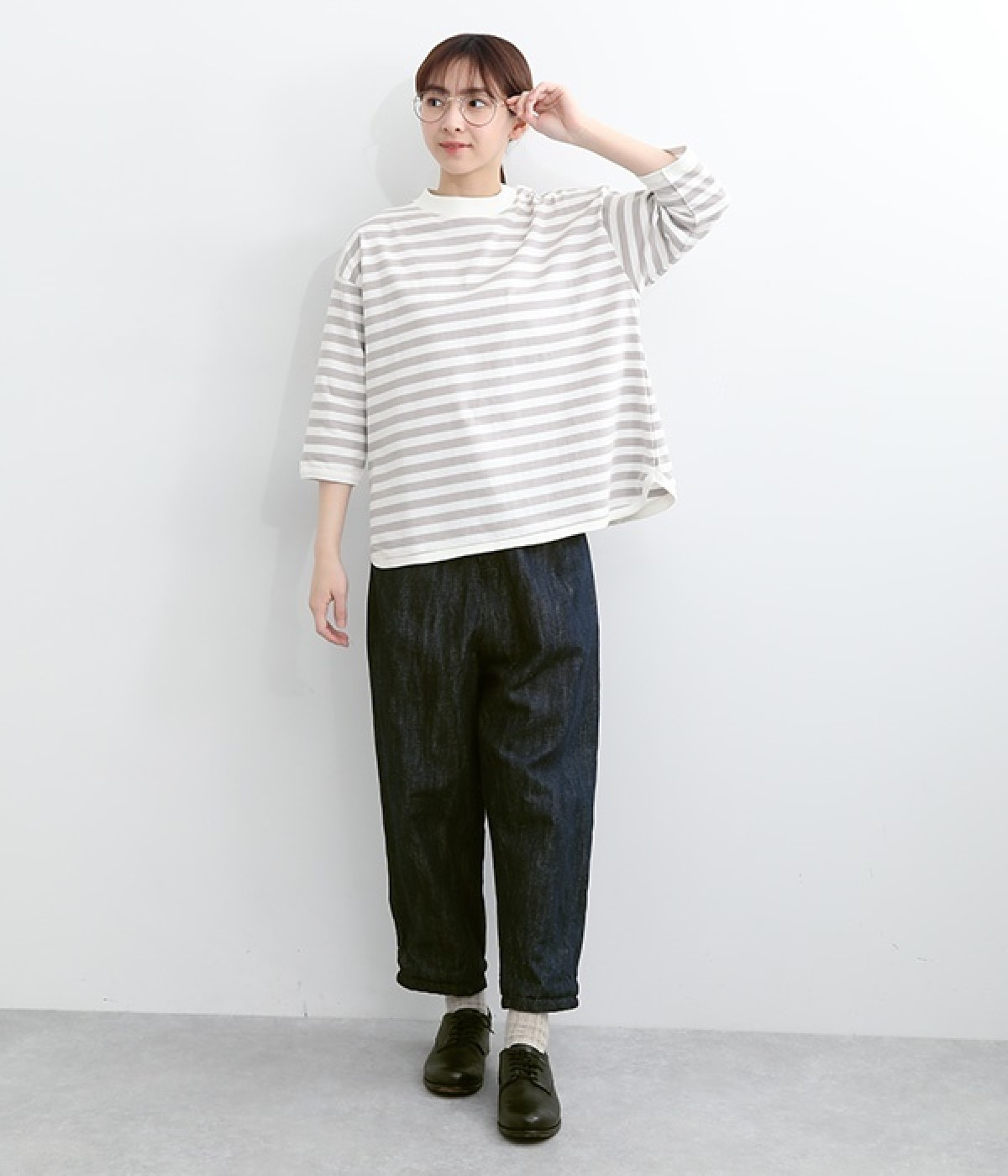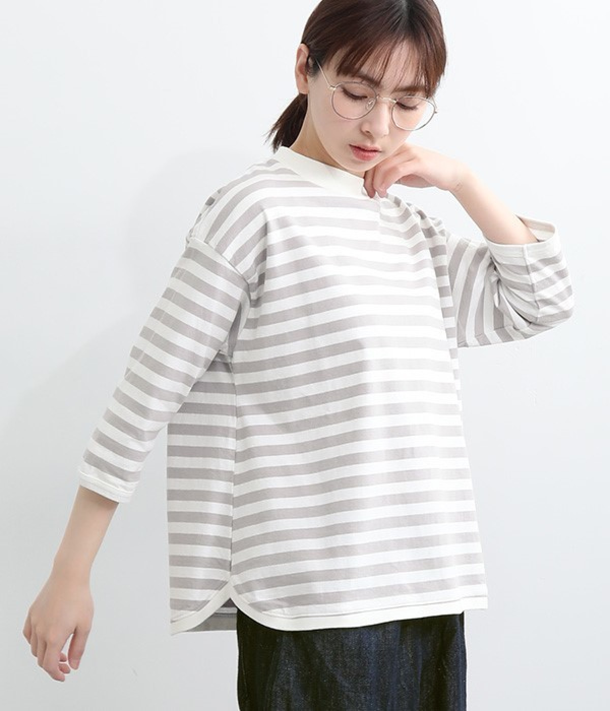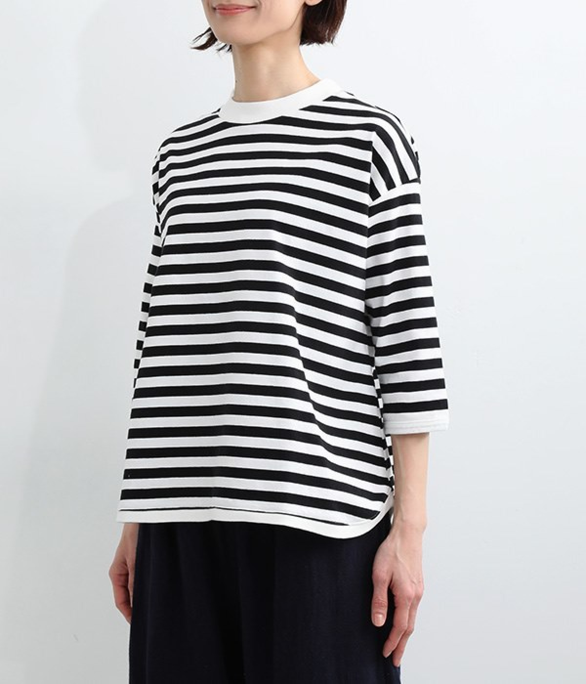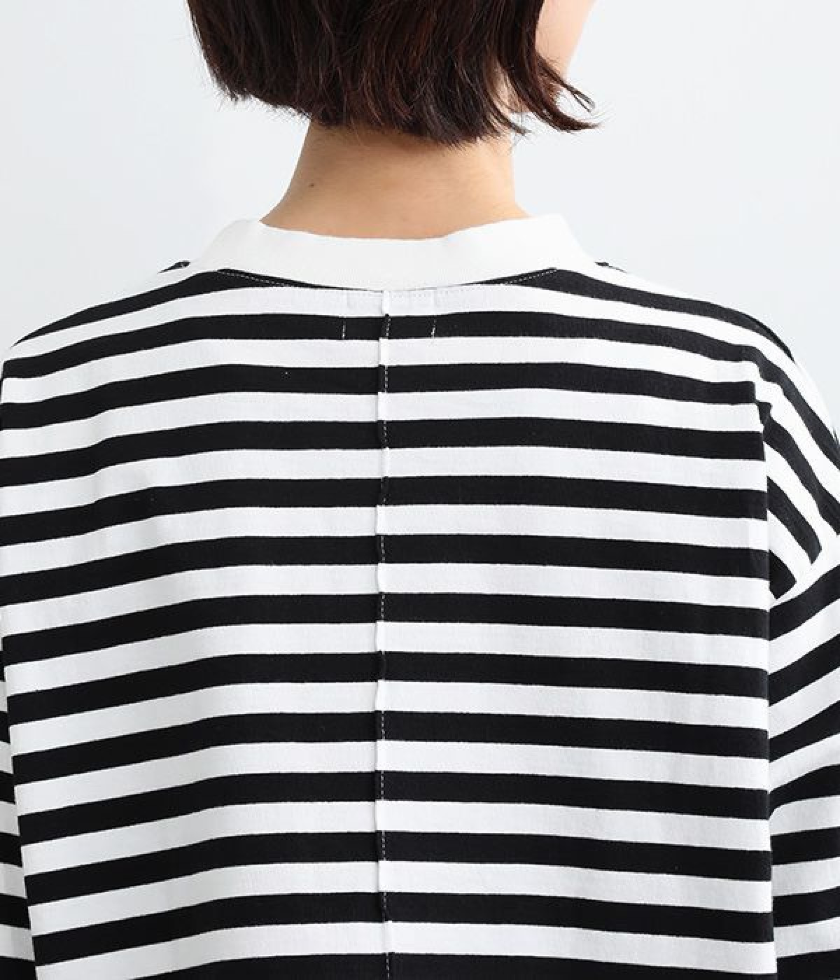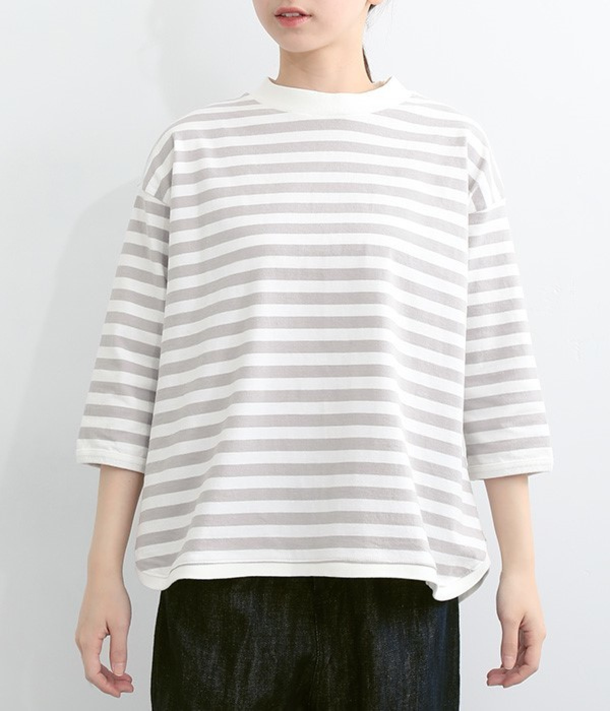 フレンチシックを思わせる等間隔のボーダーがアイキャッチになるTシャツ。ほどよい厚みのあるタフな生地感が、カジュアルな雰囲気を後押しします。着心地はとても軽く、肌離れのよいドライなタッチが特徴。やや詰まり気味のモックネックで上品な印象に。襟や袖、裾を無地のリブで切り替え、メリハリのあるデザインに仕上げました。汎用性が高く、一枚でもサマになる優秀トップスとして活躍します。