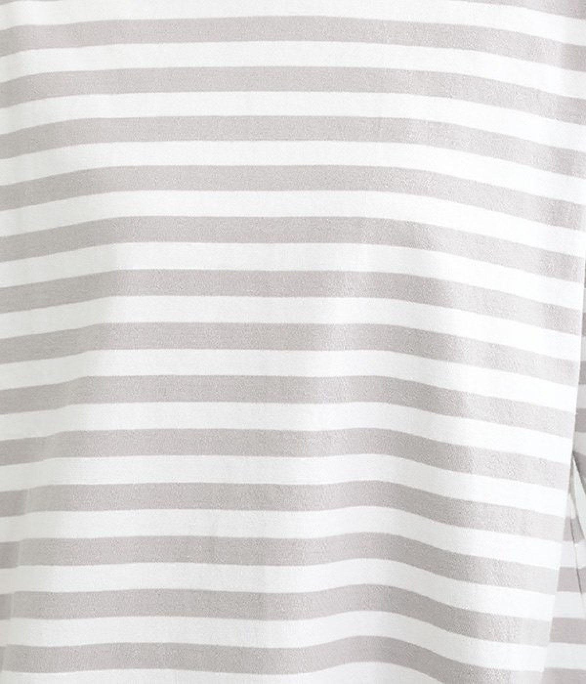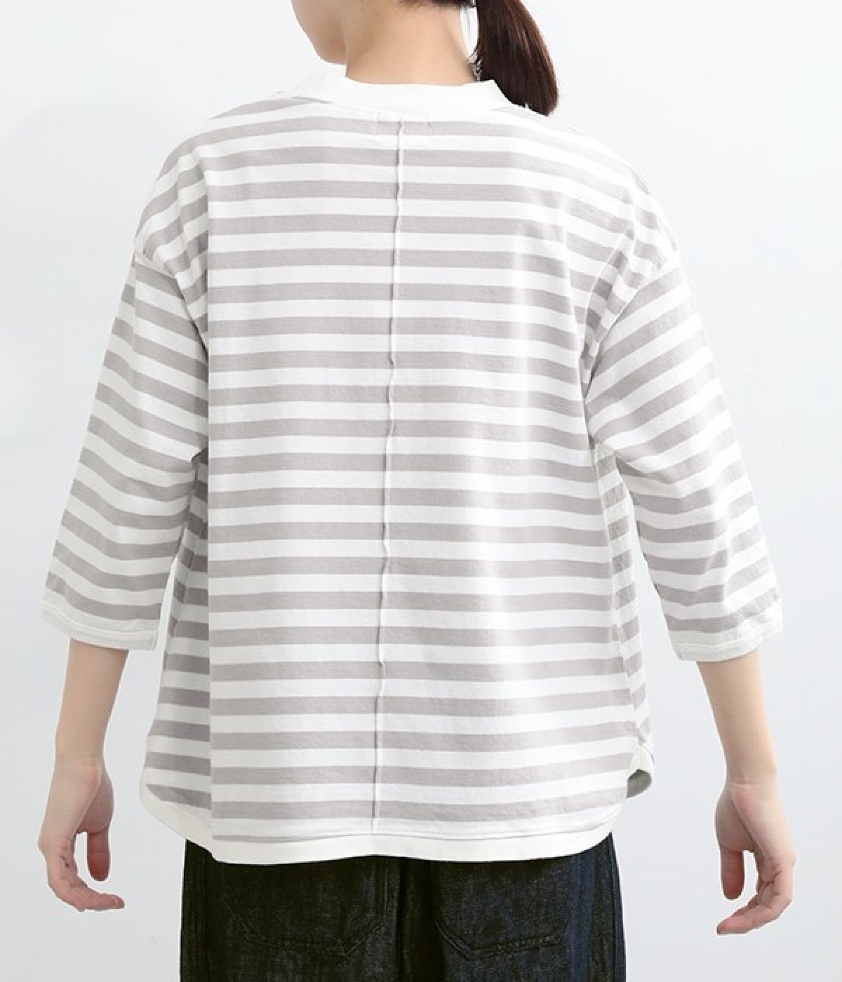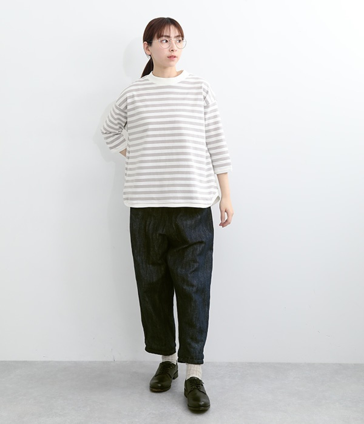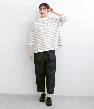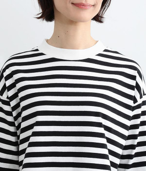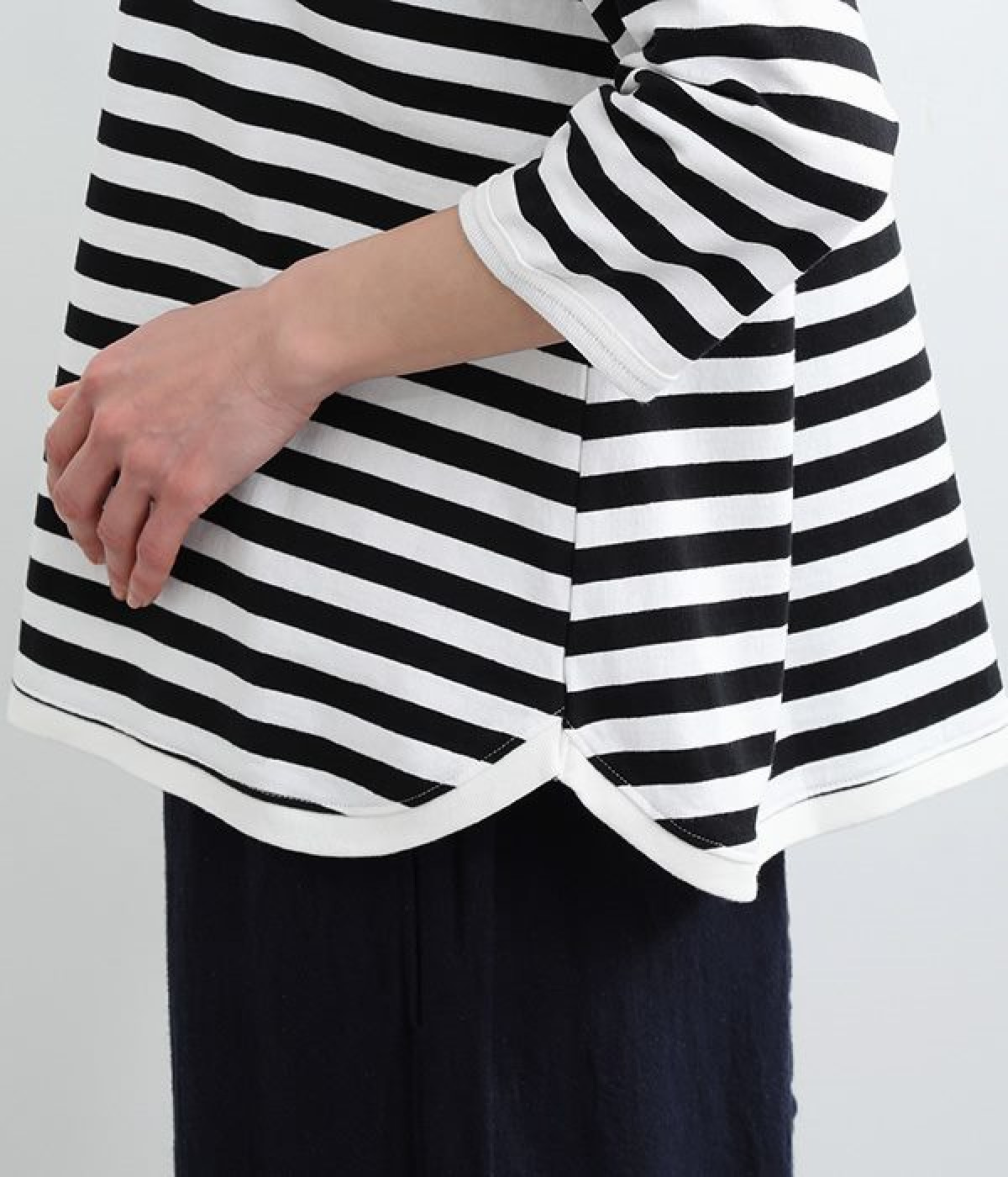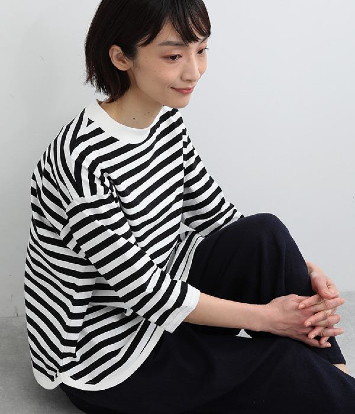 フレンチシックを思わせる等間隔のボーダーがアイキャッチになるTシャツ。ほどよい厚みのあるタフな生地感が、カジュアルな雰囲気を後押しします。着心地はとても軽く、肌離れのよいドライなタッチが特徴。やや詰まり気味のモックネックで上品な印象に。襟や袖、裾を無地のリブで切り替え、メリハリのあるデザインに仕上げました。汎用性が高く、一枚でもサマになる優秀トップスとして活躍します。