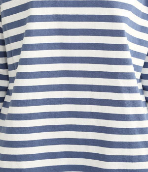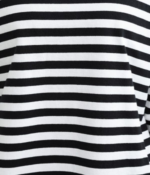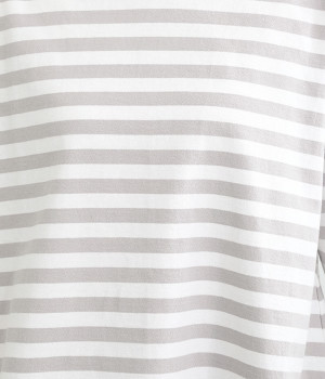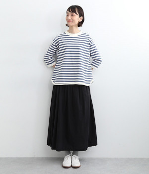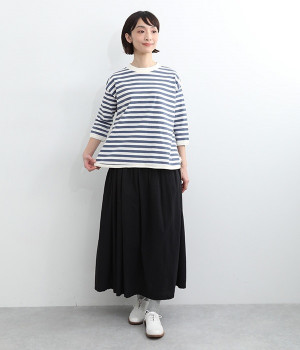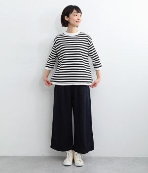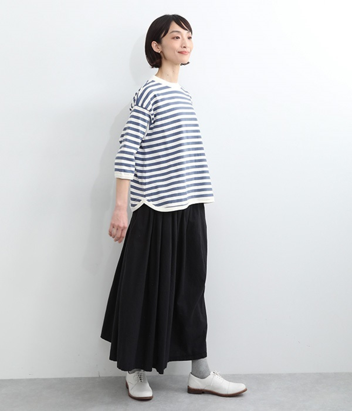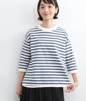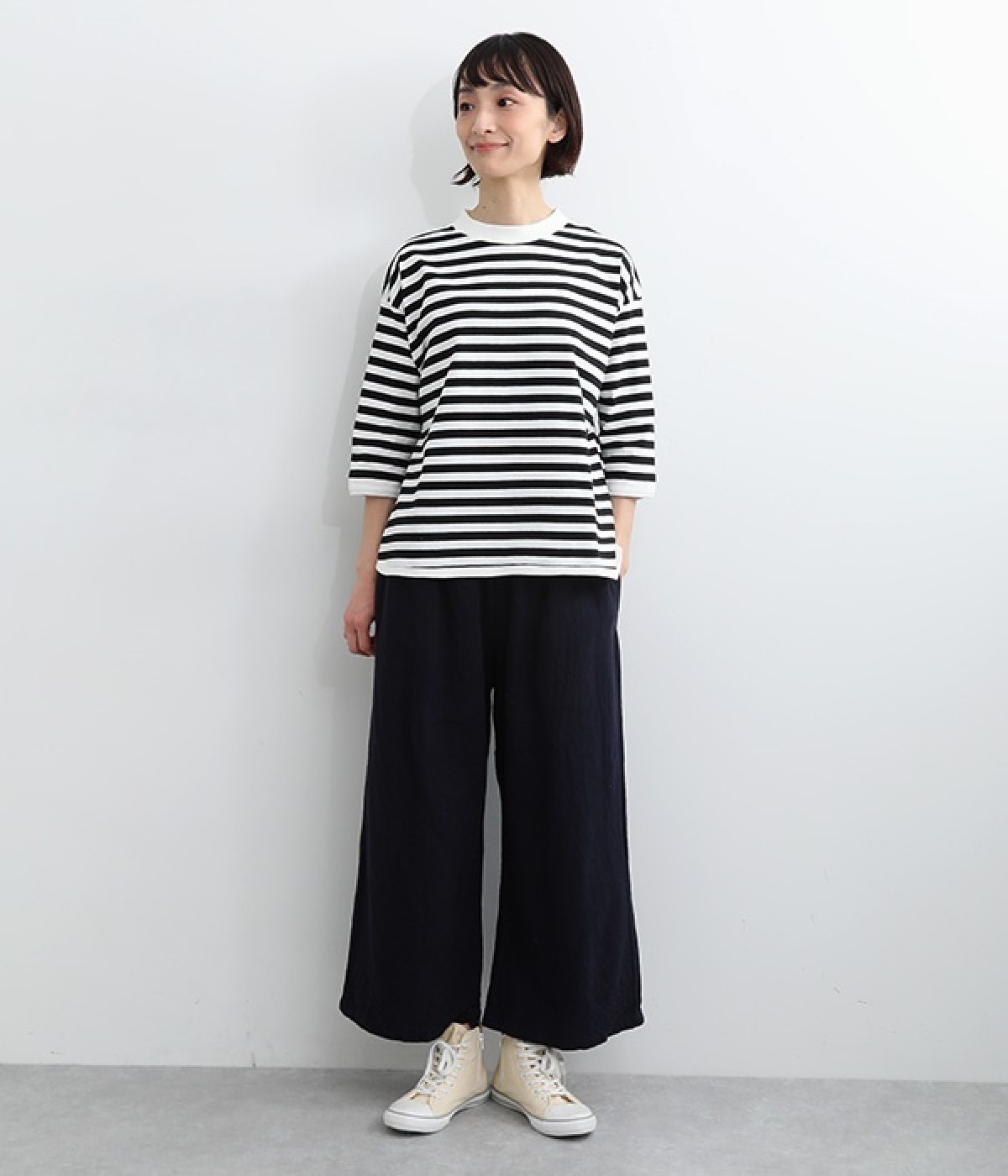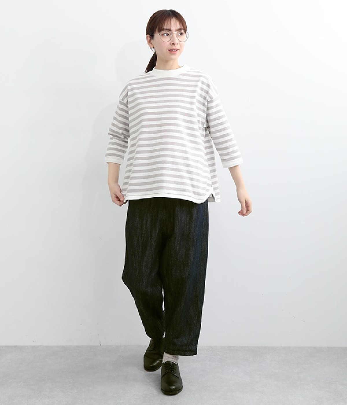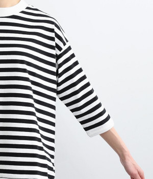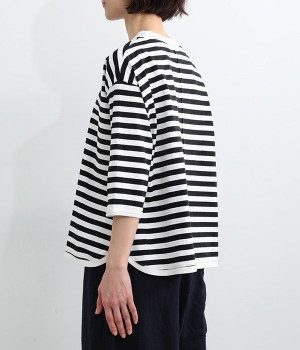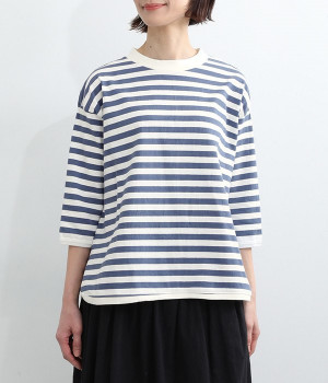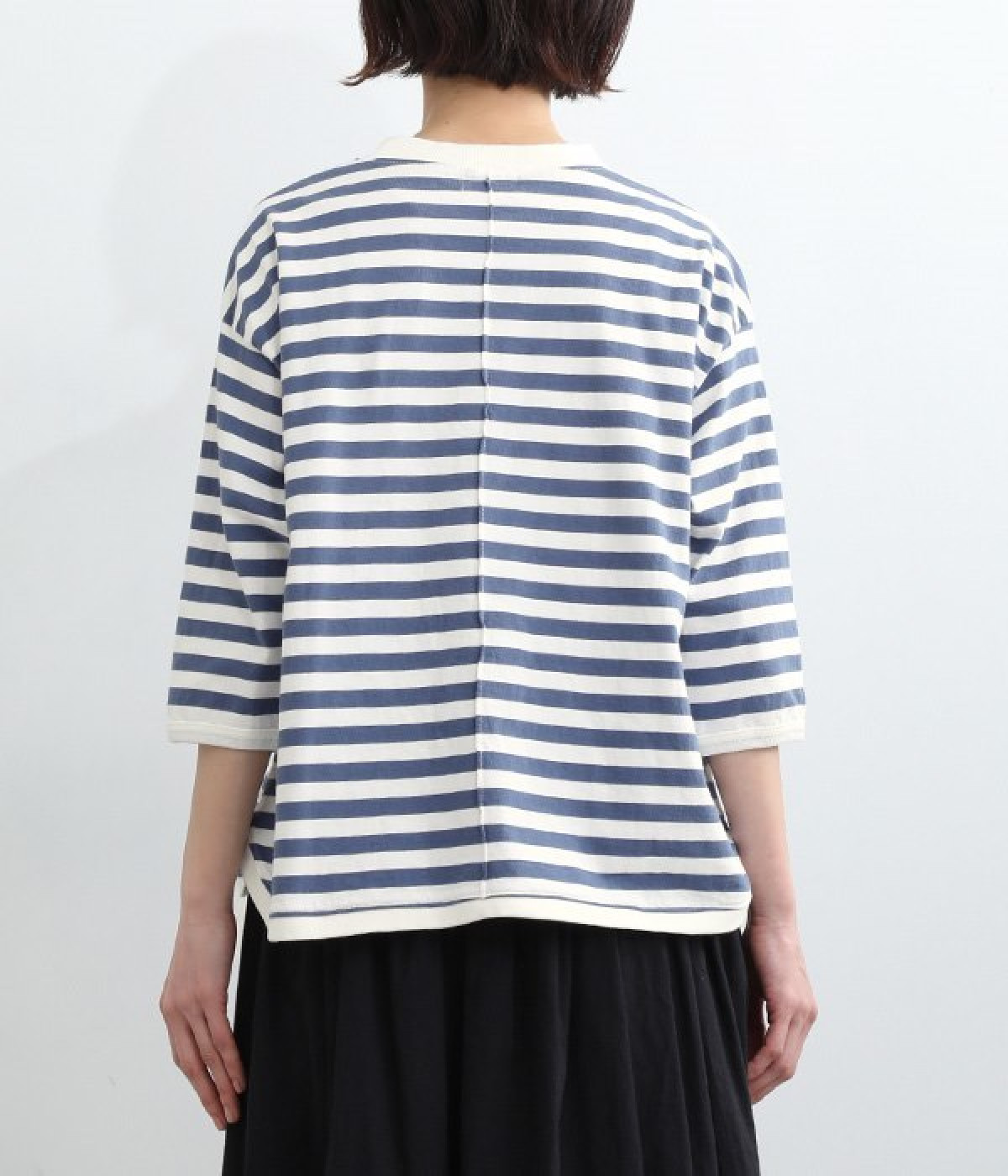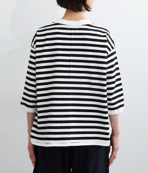 フレンチシックを思わせる等間隔のボーダーがアイキャッチになるTシャツ。ほどよい厚みのあるタフな生地感が、カジュアルな雰囲気を後押しします。着心地はとても軽く、肌離れのよいドライなタッチが特徴。やや詰まり気味のモックネックで上品な印象に。襟や袖、裾を無地のリブで切り替え、メリハリのあるデザインに仕上げました。汎用性が高く、一枚でもサマになる優秀トップスとして活躍します。