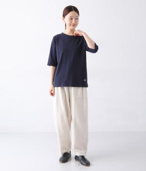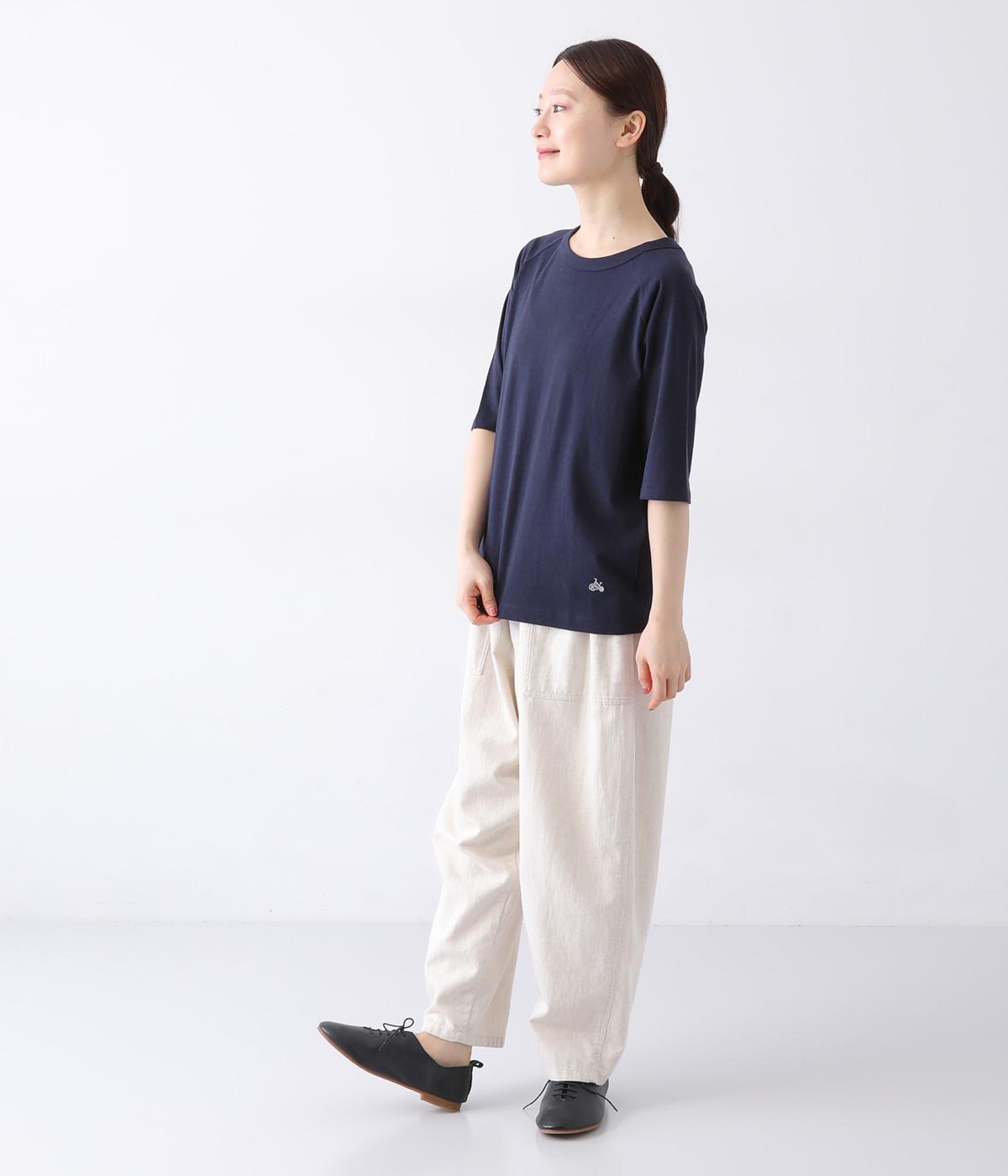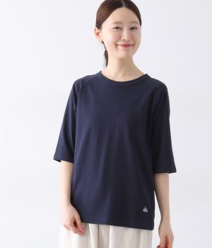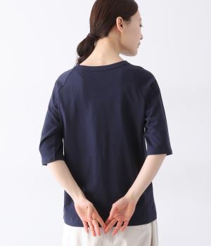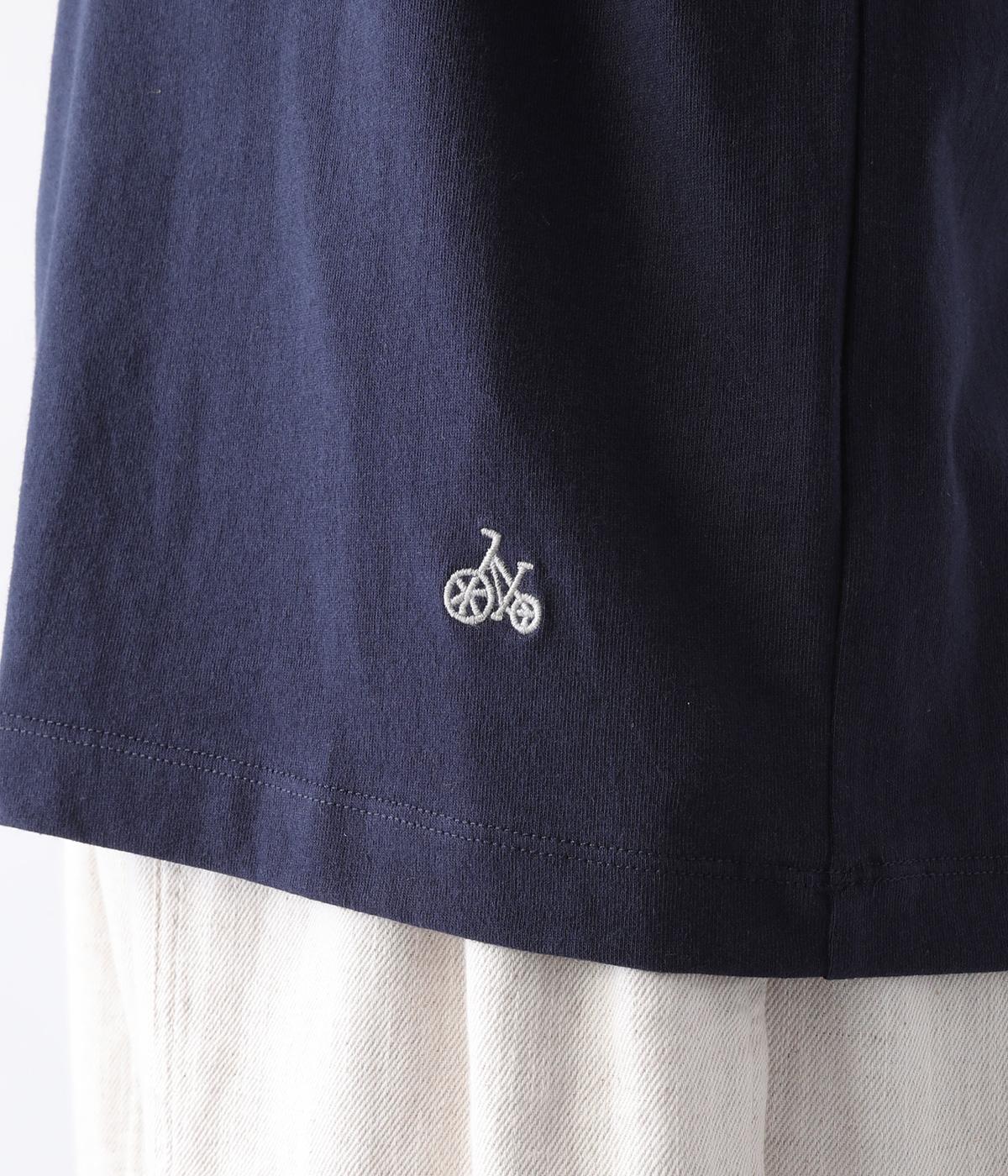 肩幅をすっきりと見せてくれるラグランスリーブのTシャツ。ひじまでかかる五分袖が二の腕をカバーしつつ上品なムードを演出します。左裾にほどこされた自転車の刺しゅうもさりげないポイントです。