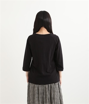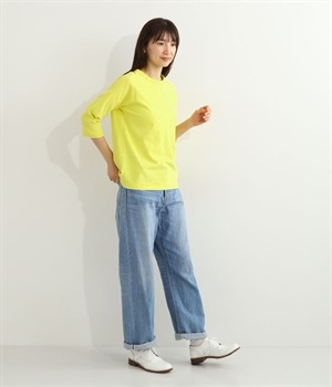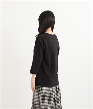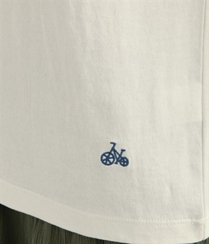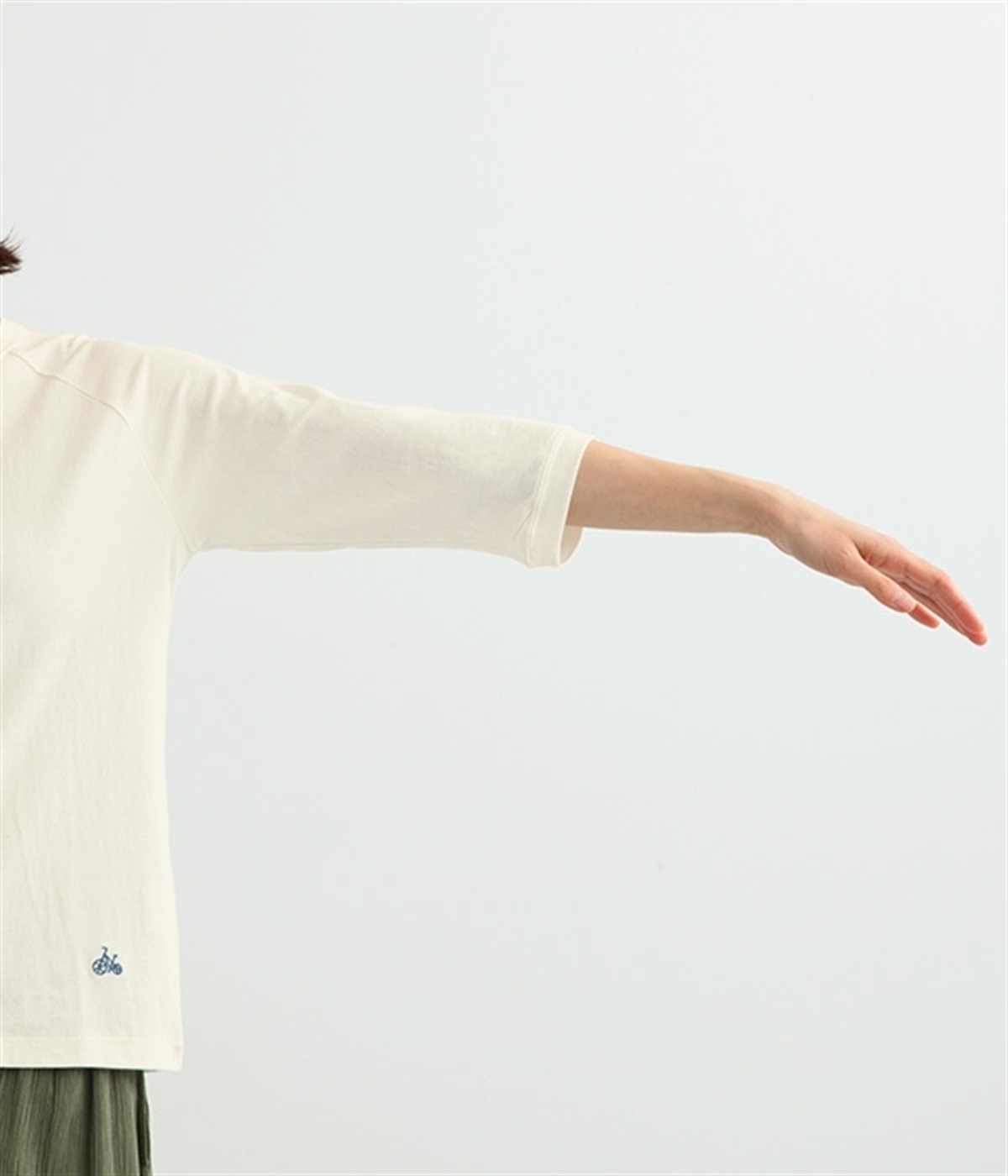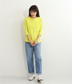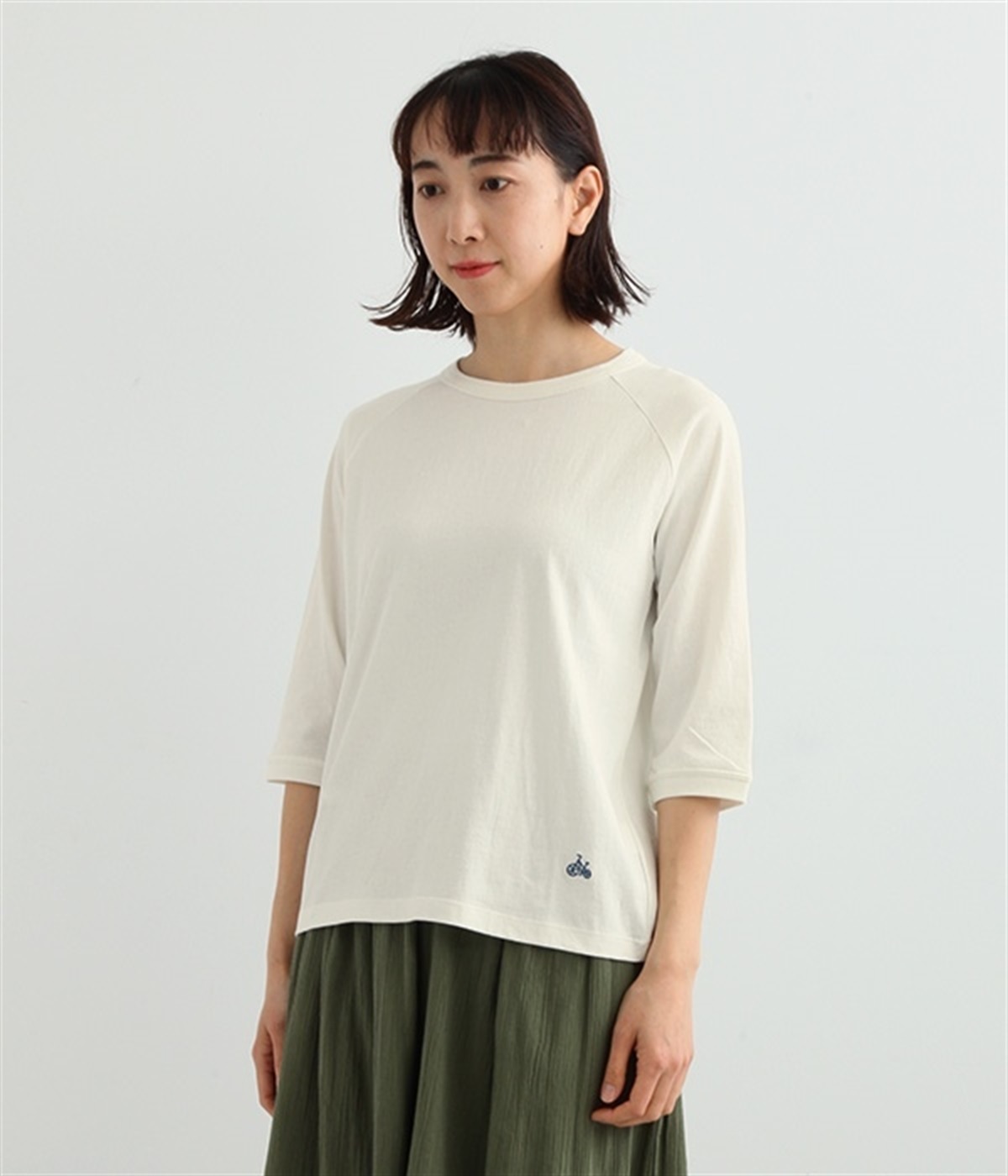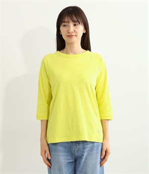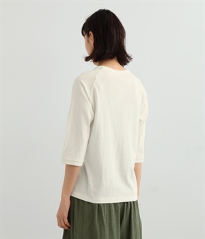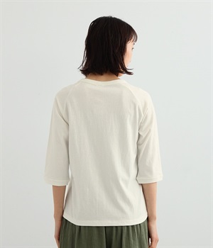 生地の凹凸やネップのある豊かな表情が特徴で、着るほどに風合いが増し肌になじんでいく七分袖のTシャツです。紡績工程で出る落ち綿などを再利用した、リサイクルコットン仕立て。袖部分は肩を動かしやすいラグランスリーブに仕上げています。自転車モチーフのワンポイント刺しゅうがアクセント。大人のカジュアルスタイルに最適な、使いやすいカラー展開も魅力です。