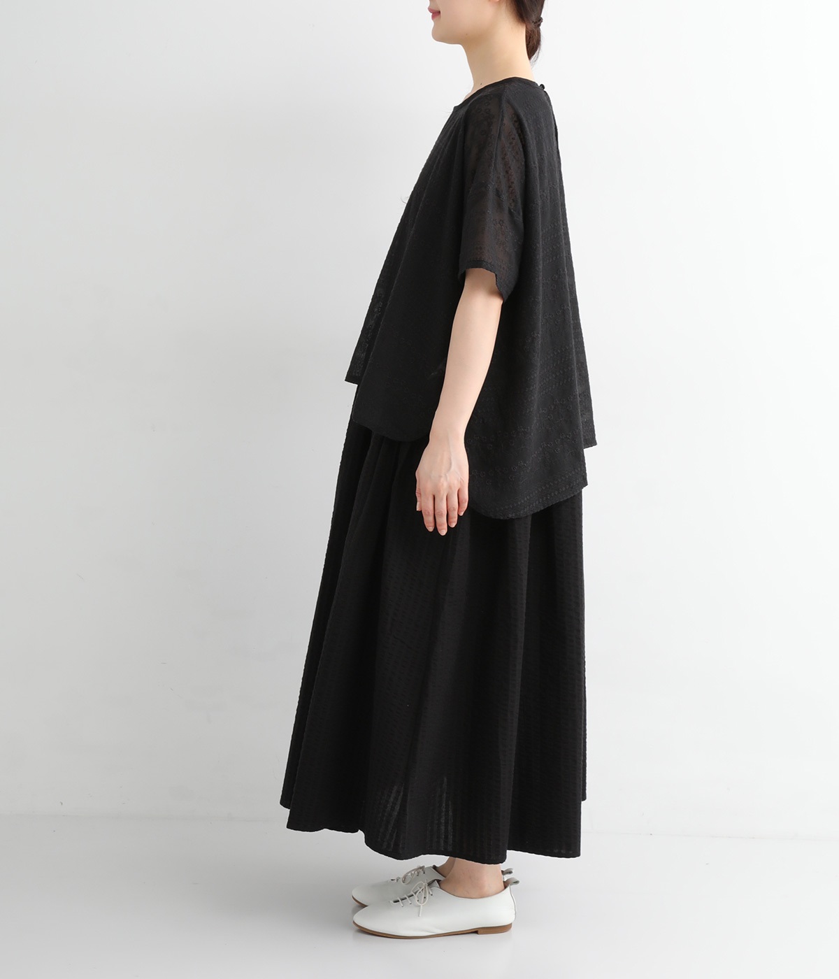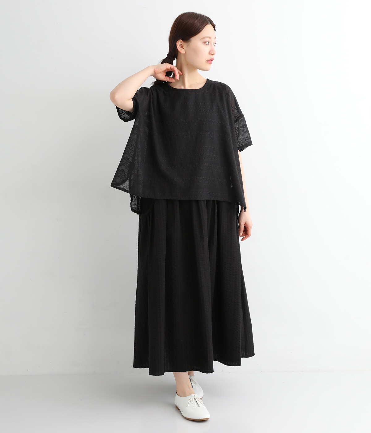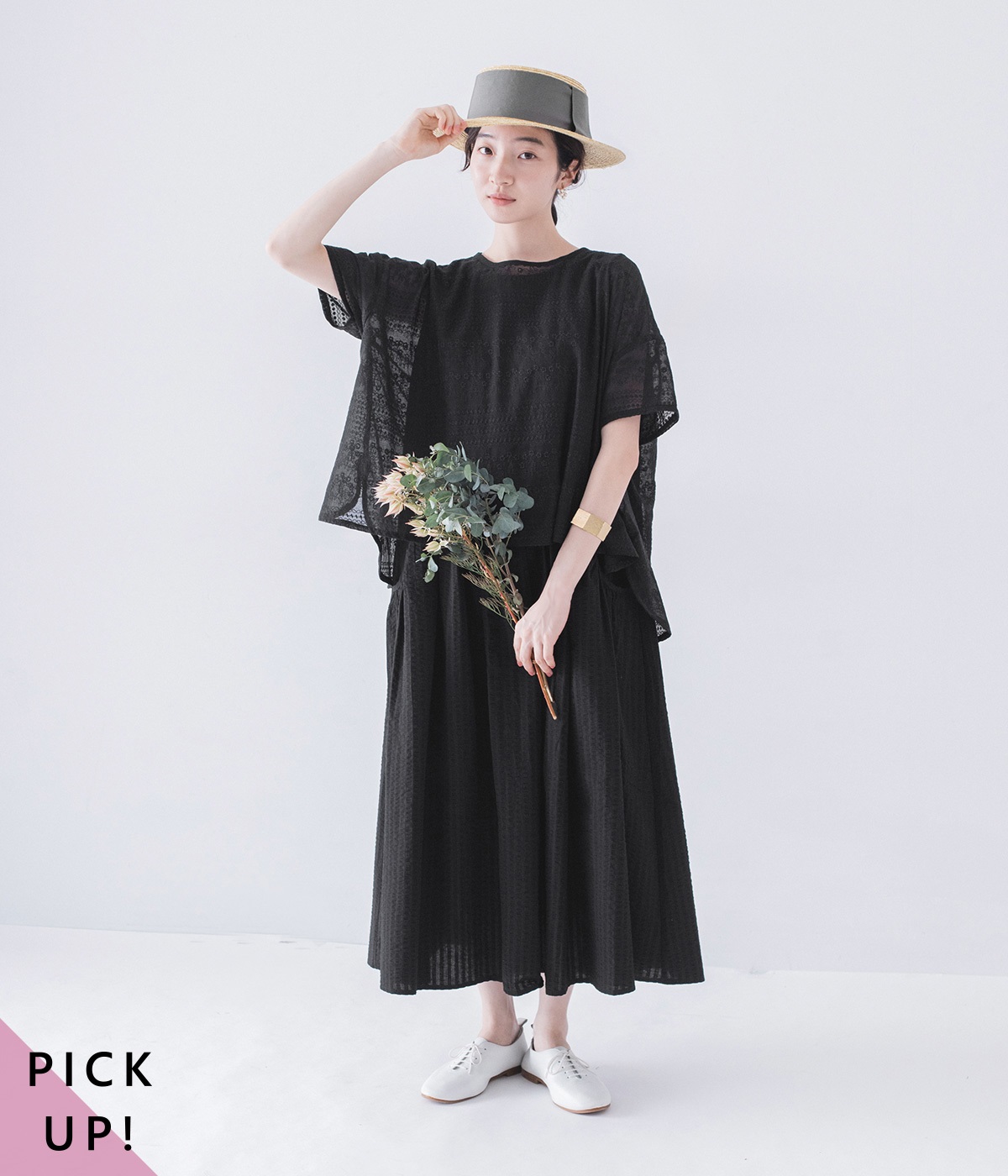 ほんのりとした透け感とハリ感が、夏のブラックを軽やかに。シンプルながらも印象に残る、大人かわいいブラックスタイルです。