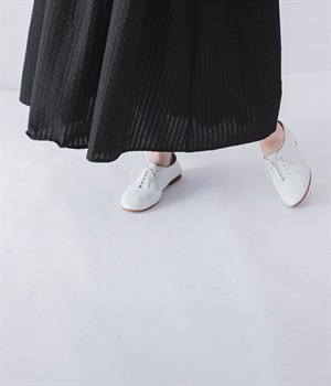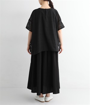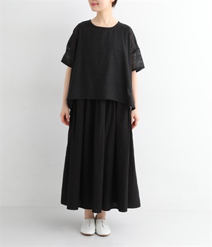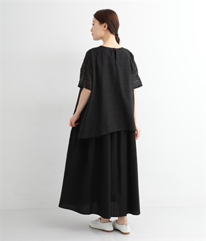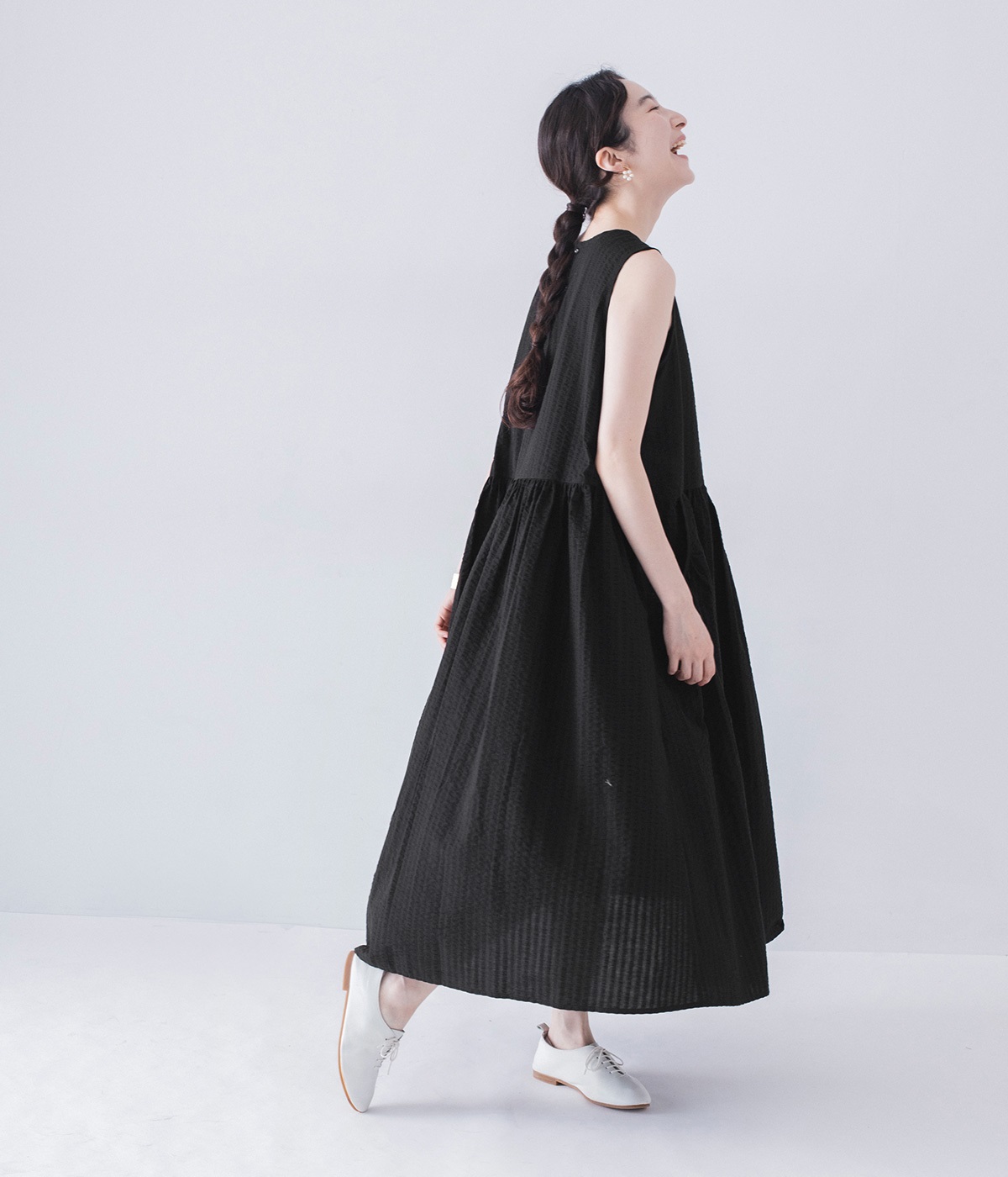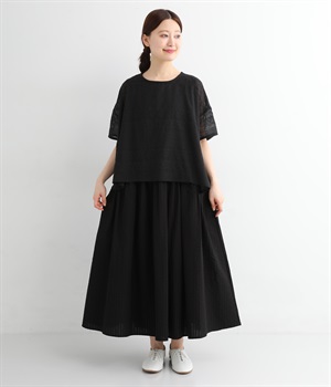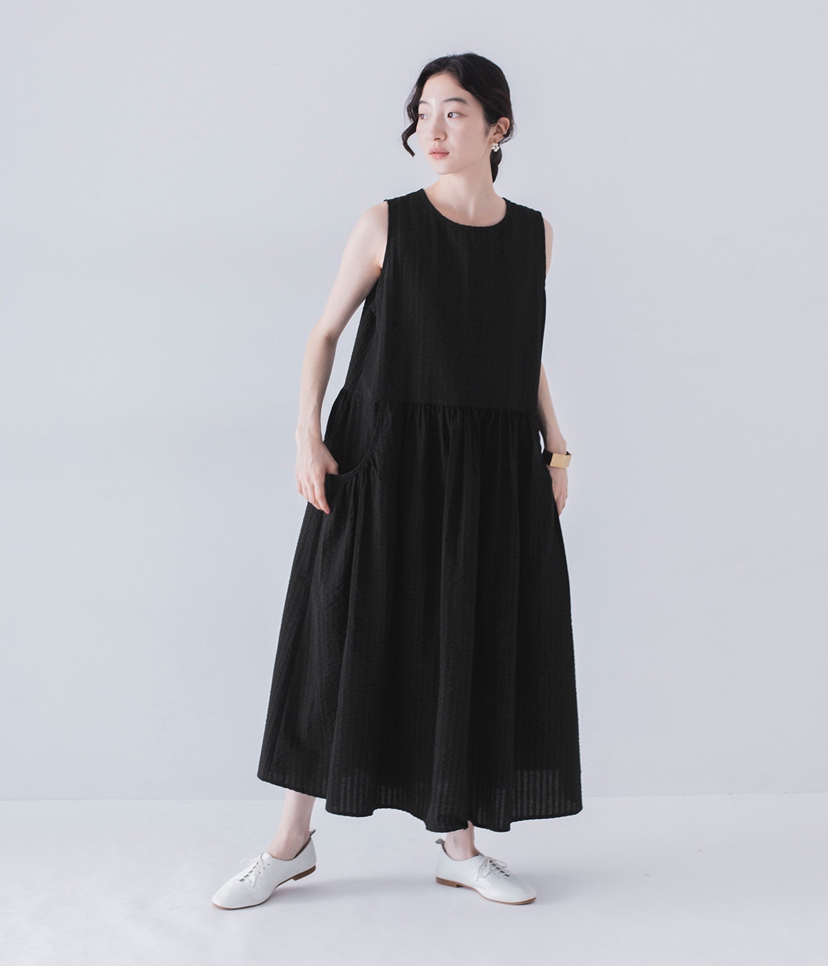 ほんのりとした透け感とハリ感が、夏のブラックを軽やかに。シンプルながらも印象に残る、大人かわいいブラックスタイルです。