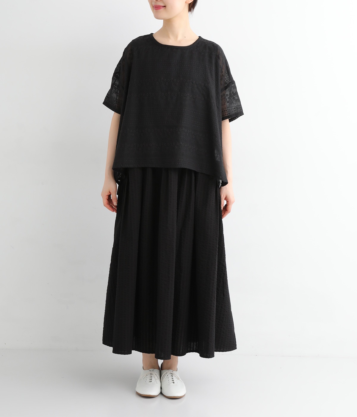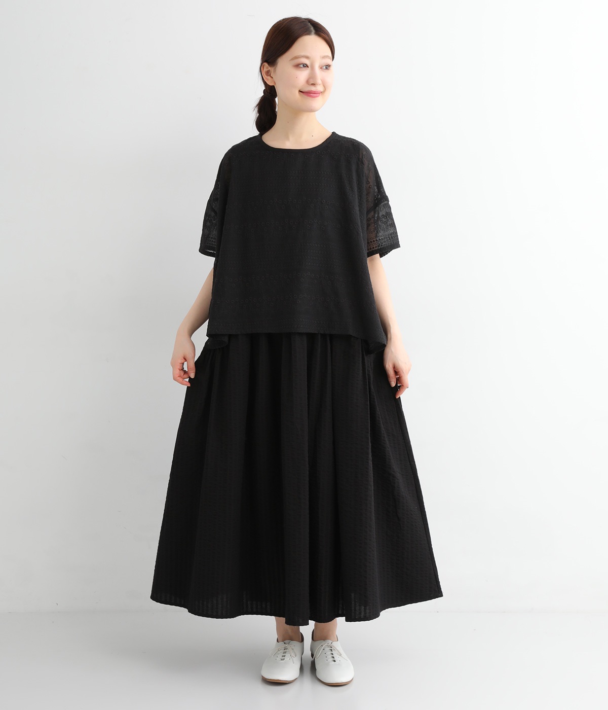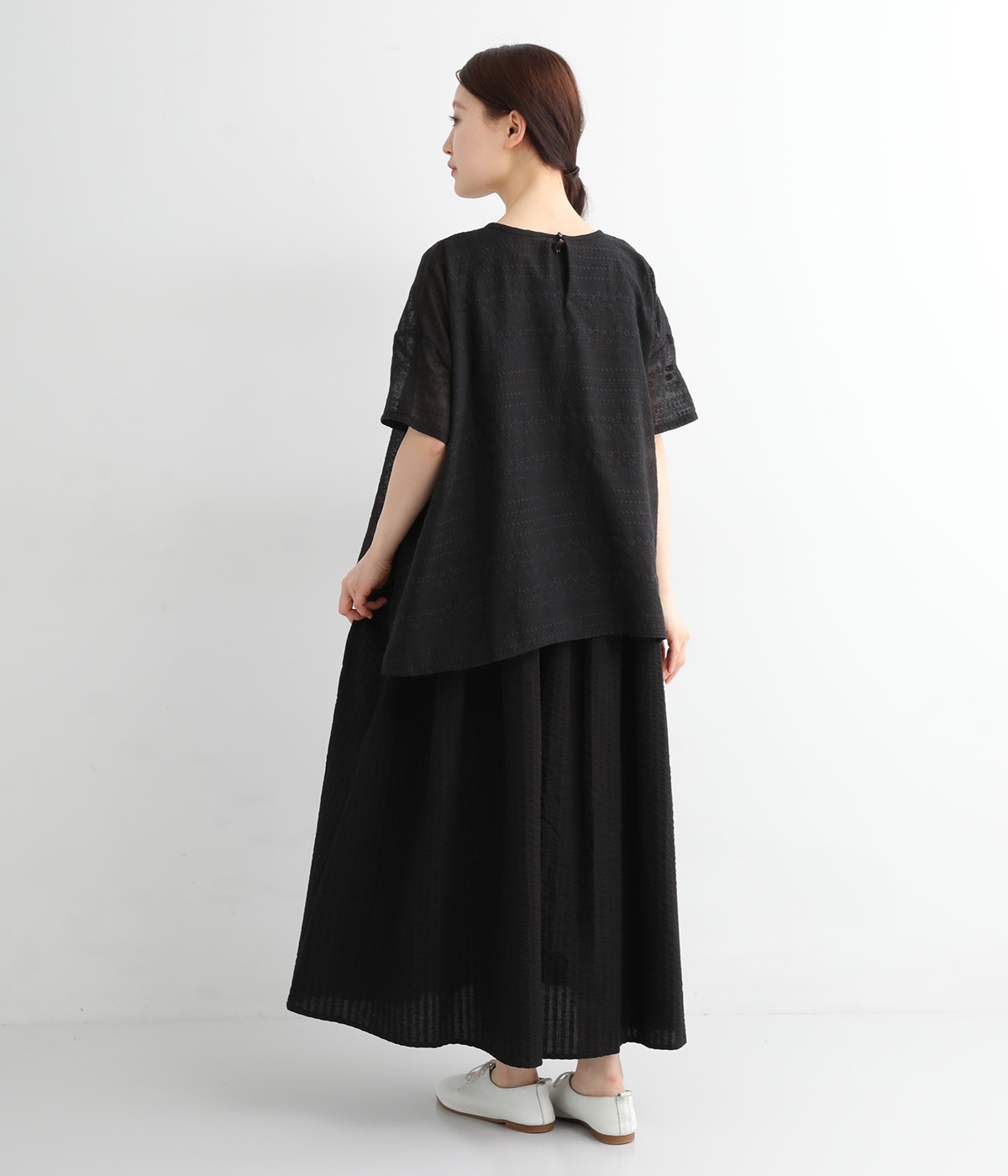 プルオーバーは透け感と刺繍が華やかで、シンプルなアイテムにレイヤードするのがおすすめ。ワンピースには、ポコポコとしたナチュラルな表情が爽やかなサッカー地を使用しています。