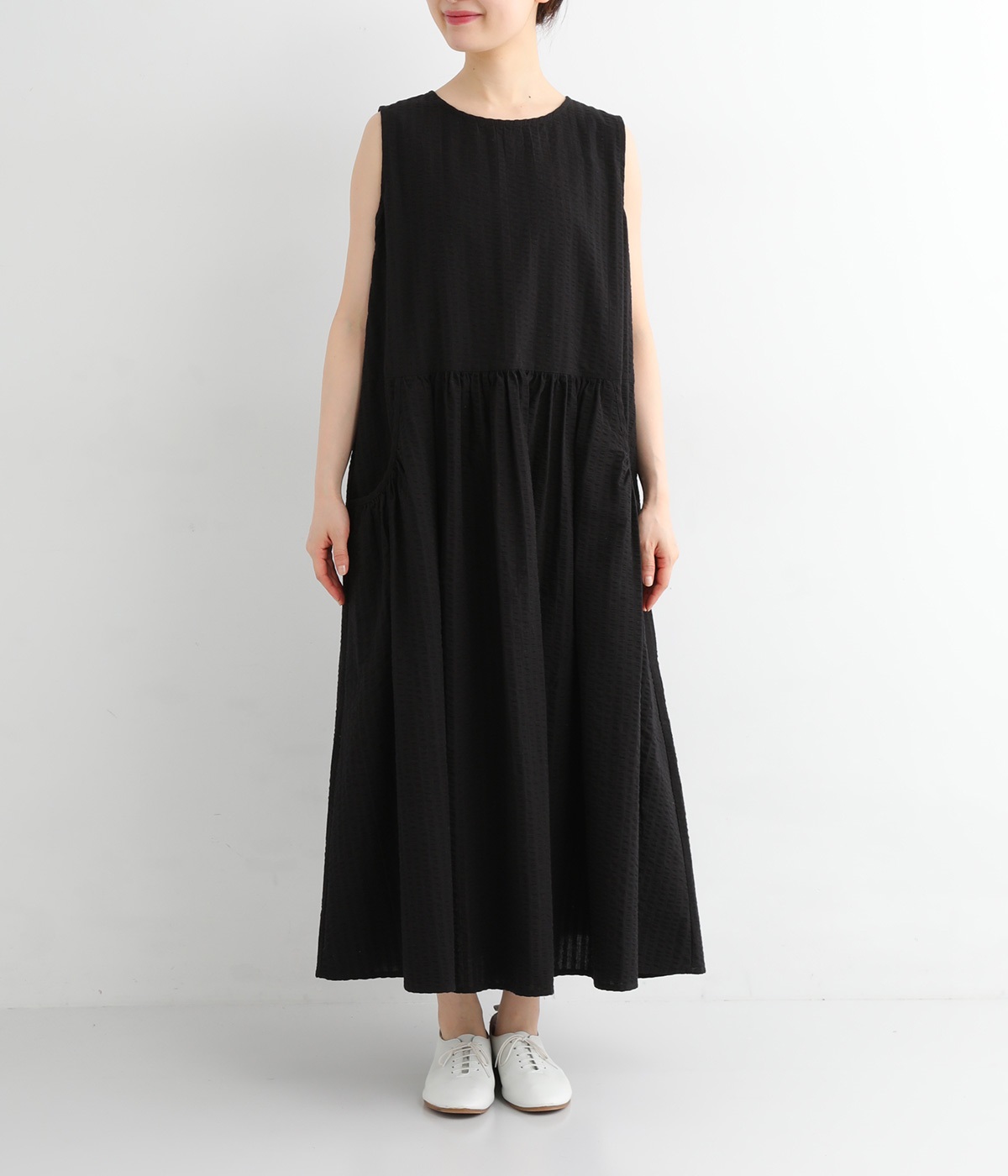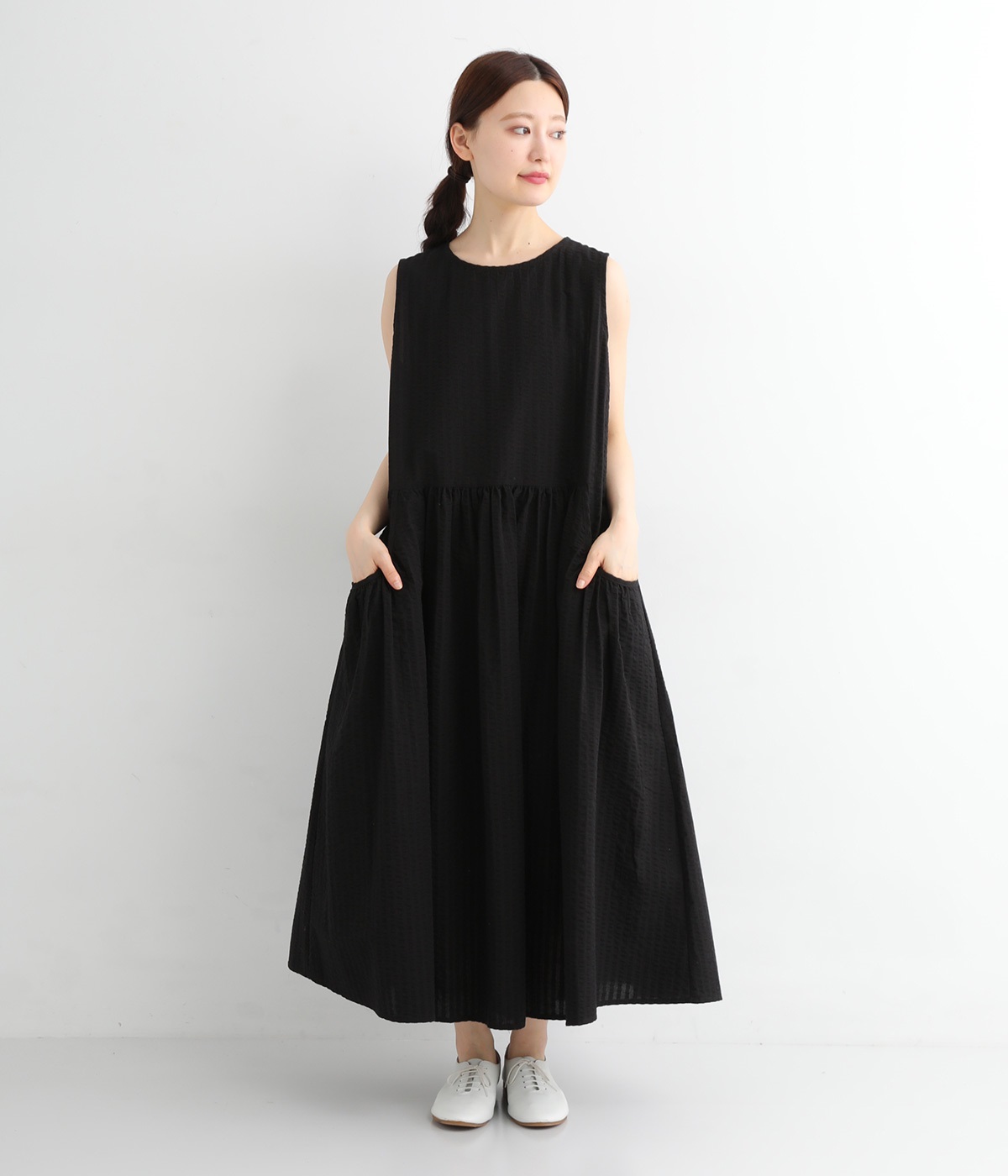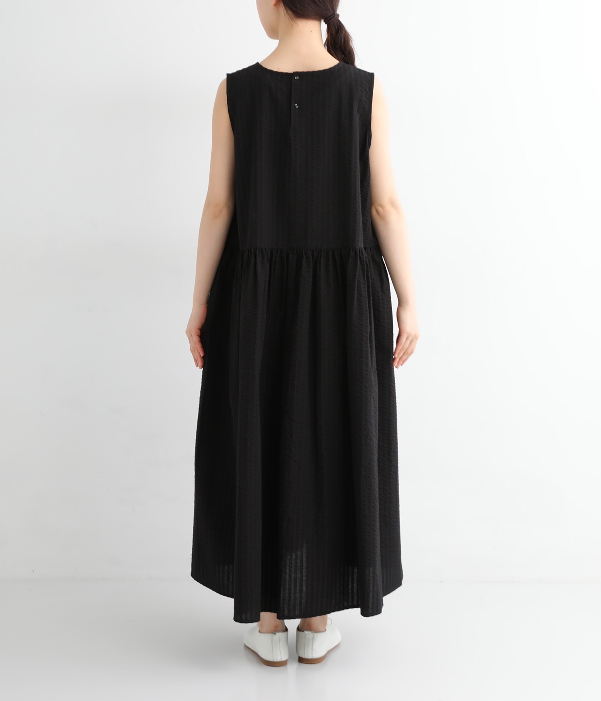ワンピースはほんのり透け感のあるサッカー地で、見た目にも涼やか。