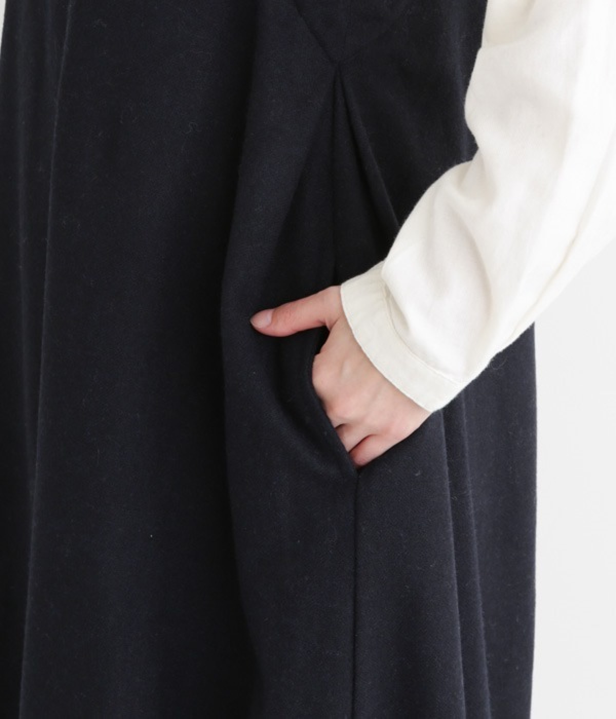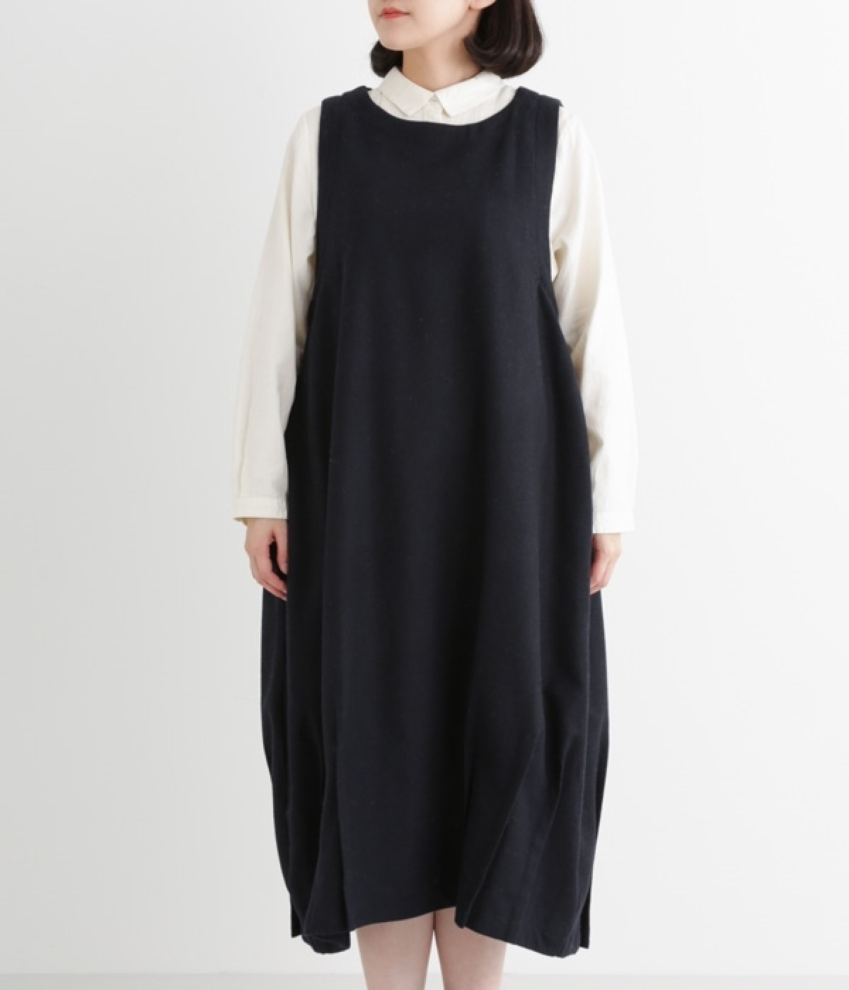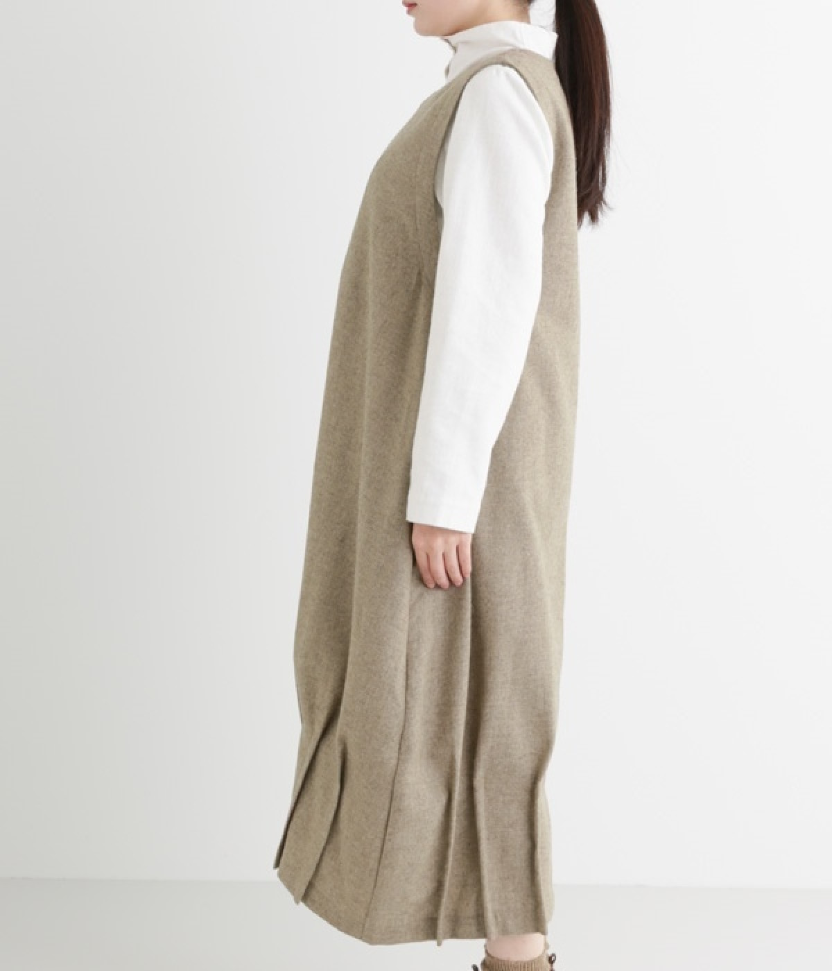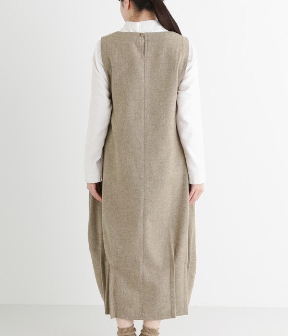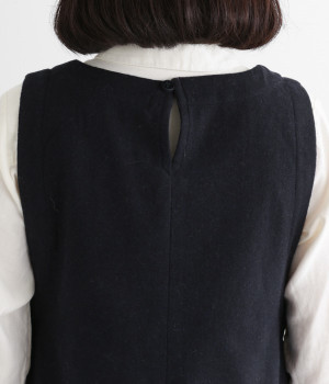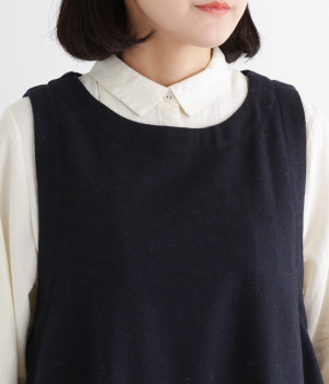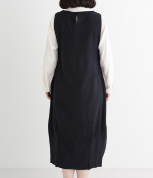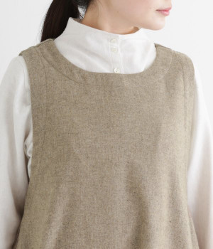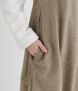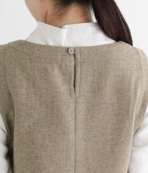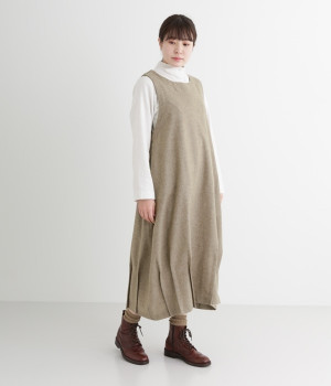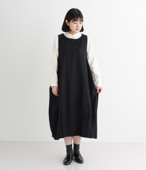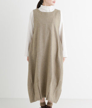 お客様からリクエストを多くいただいた、大人気のワンピースです。ノースリーブデザインなのでカーディガンなどがはおりやすく、インにブラウスやニットなどの組み合わせがしやすいアイテム。あたたかな毛混素材を使用し、裾には縦タックでふんわりとした魅力のバルーンシルエットに仕上げました。フェミニンなコーディネートが決まる一枚です。