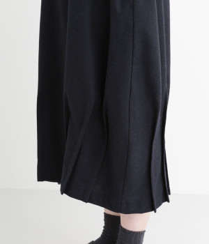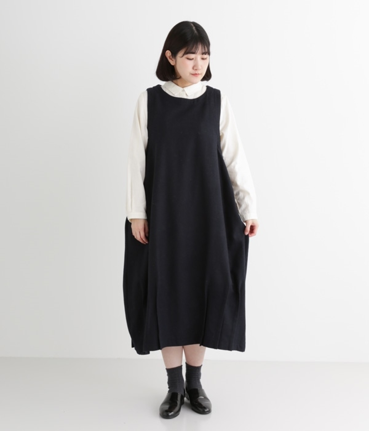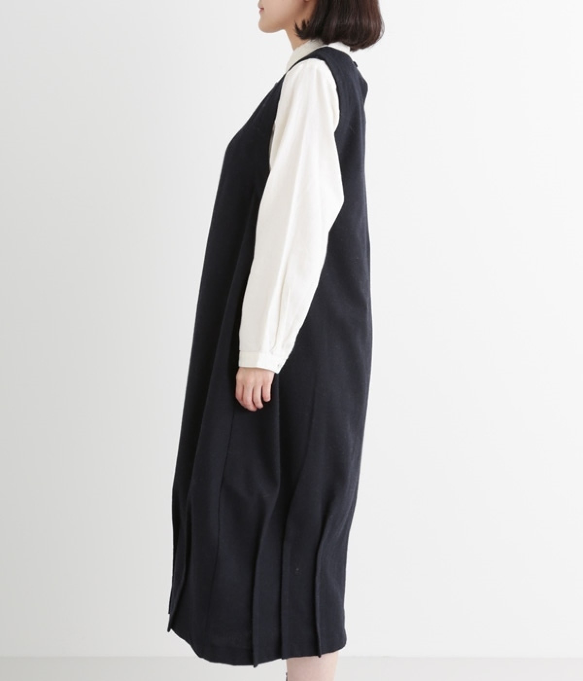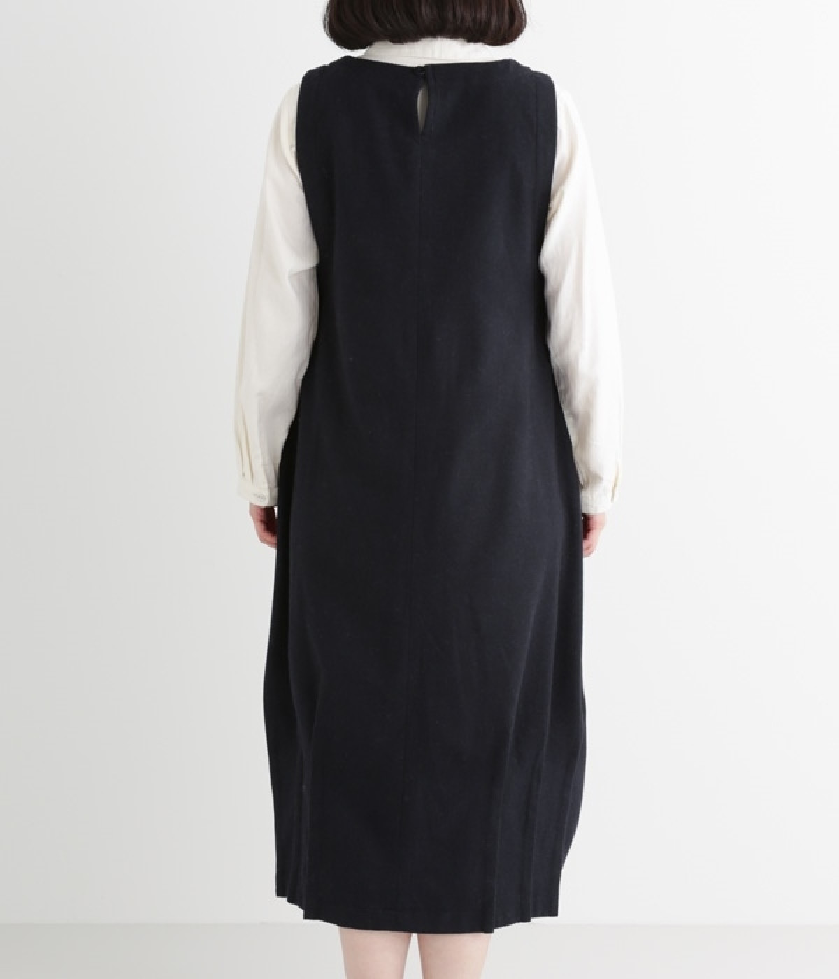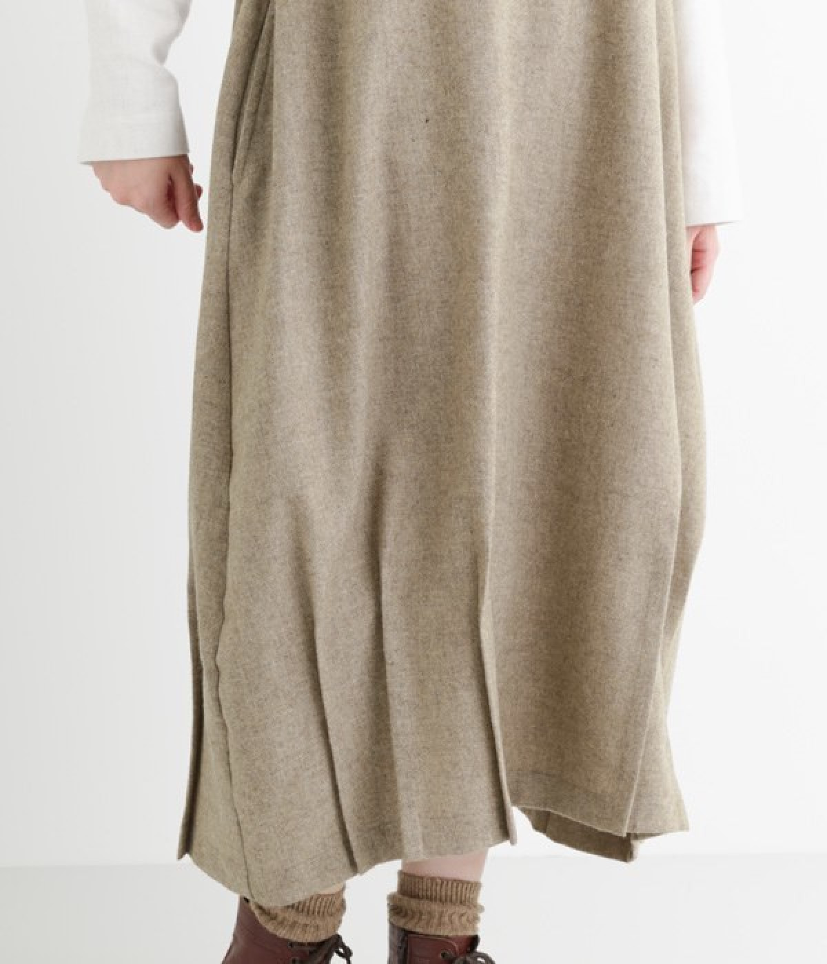 お客様からリクエストを多くいただいた、大人気のワンピースです。ノースリーブデザインなのでカーディガンなどがはおりやすく、インにブラウスやニットなどの組み合わせがしやすいアイテム。あたたかな毛混素材を使用し、裾には縦タックでふんわりとした魅力のバルーンシルエットに仕上げました。フェミニンなコーディネートが決まる一枚です。