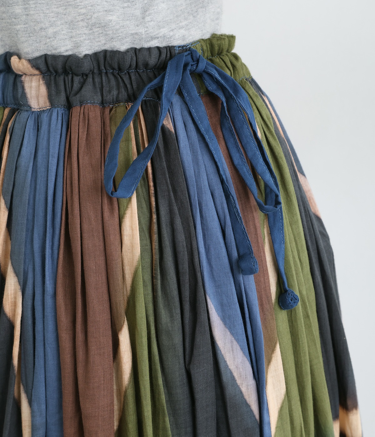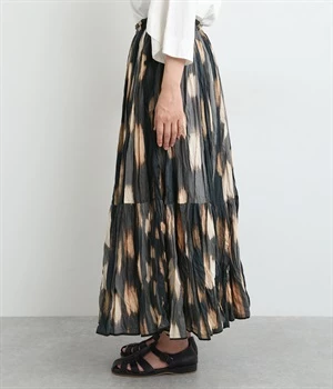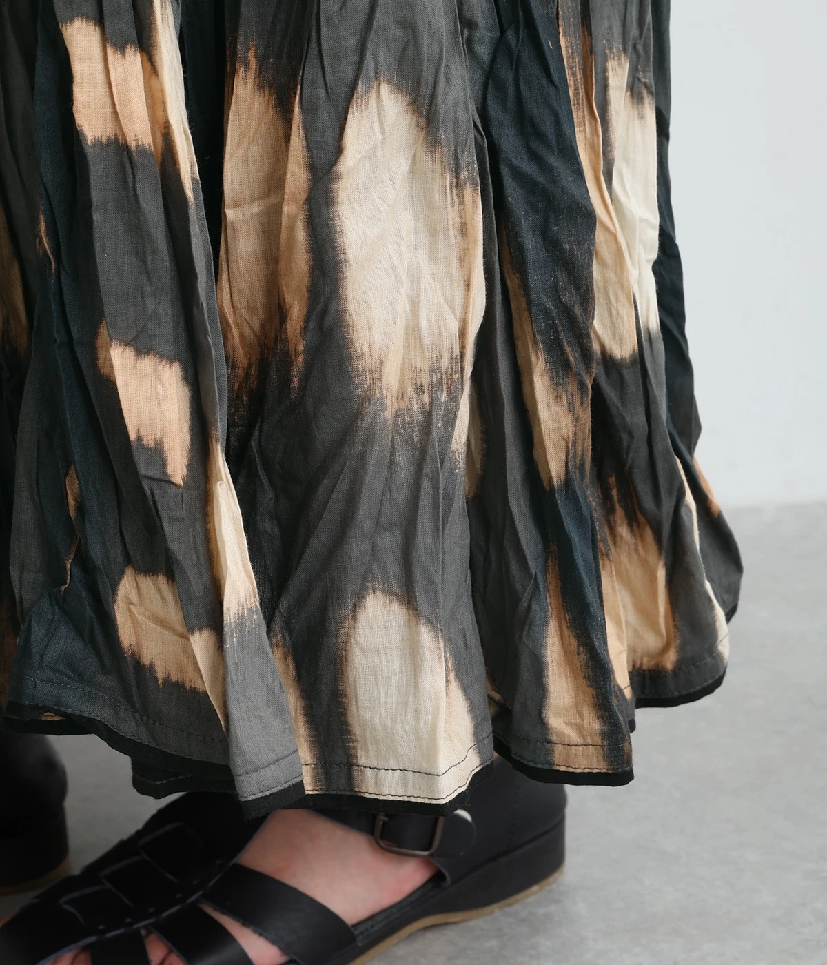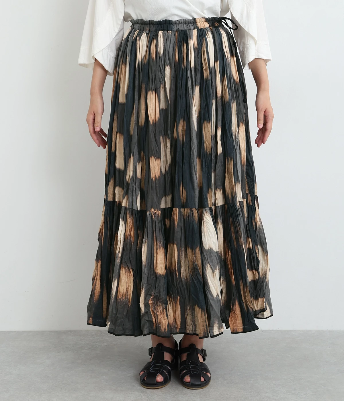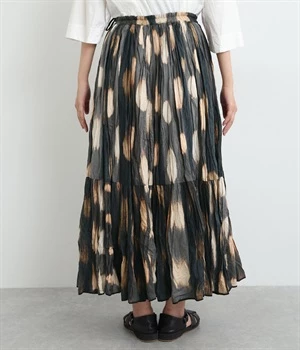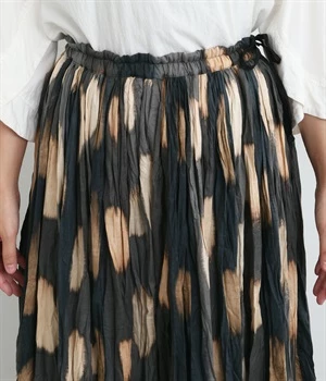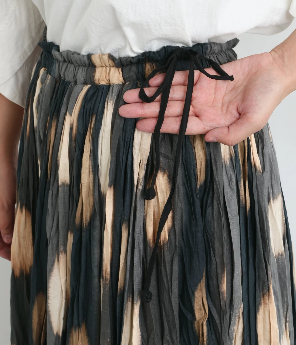 クリンクル加工を施し、独特のシワや縮みを出したボリュームたっぷりのスカートです。シワがあることにより肌にまとわりつきにくく、暑い日も快適に着こなすことができます。柄は一枚一枚職人が描いており、線の太さのムラやにじみがみられる味わい深い仕上がり。シンプルなTシャツ合わせでも着映えするデザインです。ウエストは細めの総ゴムに調節ヒモつきで、窮屈さを感じにくくお好みのサイズ感で着用できます。
