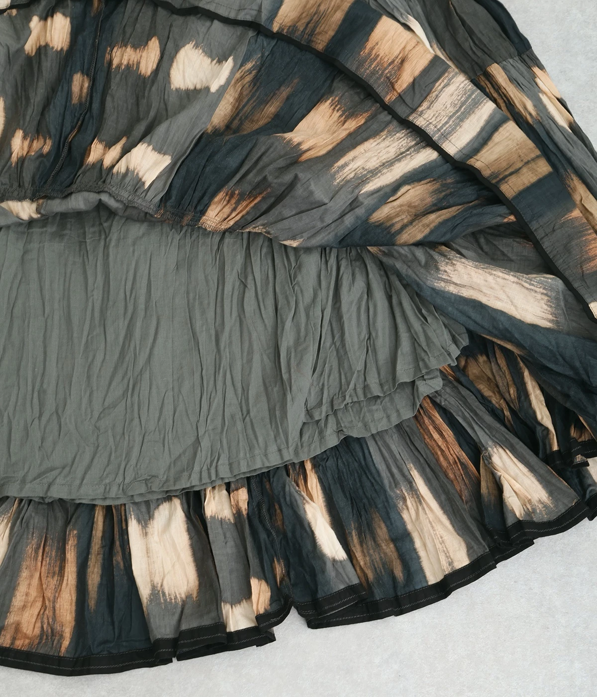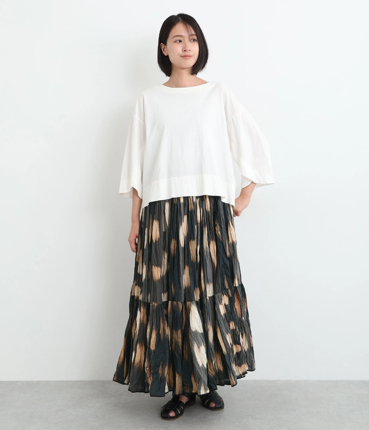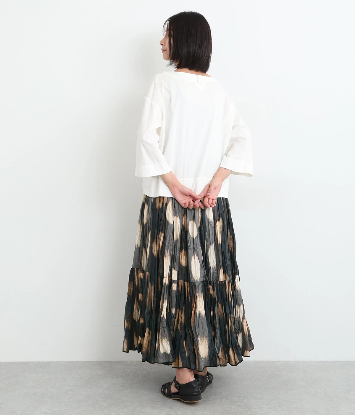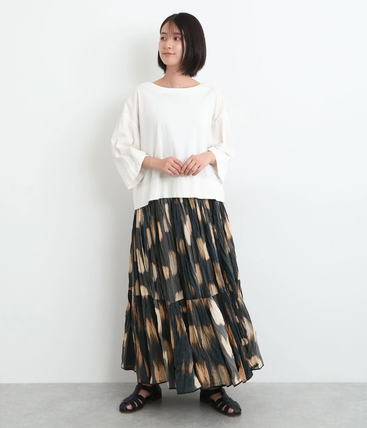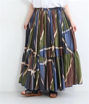 クリンクル加工を施し、独特のシワや縮みを出したボリュームたっぷりのスカートです。シワがあることにより肌にまとわりつきにくく、暑い日も快適に着こなすことができます。柄は一枚一枚職人が描いており、線の太さのムラやにじみがみられる味わい深い仕上がり。シンプルなTシャツ合わせでも着映えするデザインです。ウエストは細めの総ゴムに調節ヒモつきで、窮屈さを感じにくくお好みのサイズ感で着用できます。