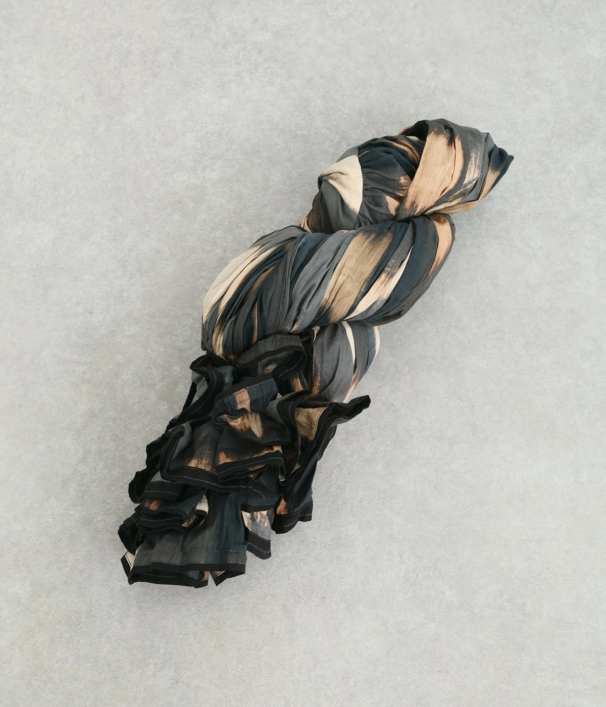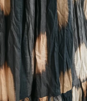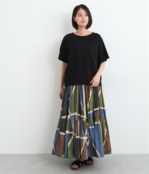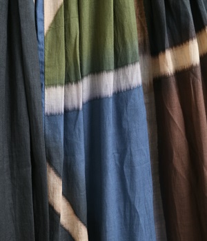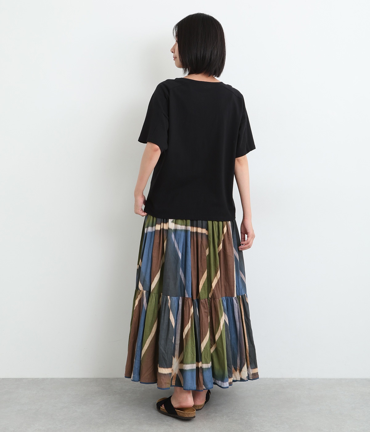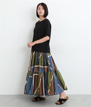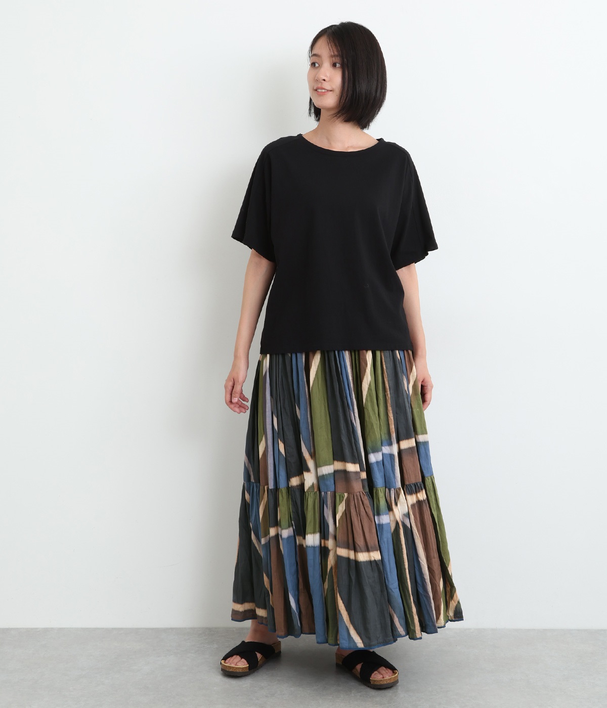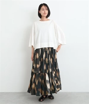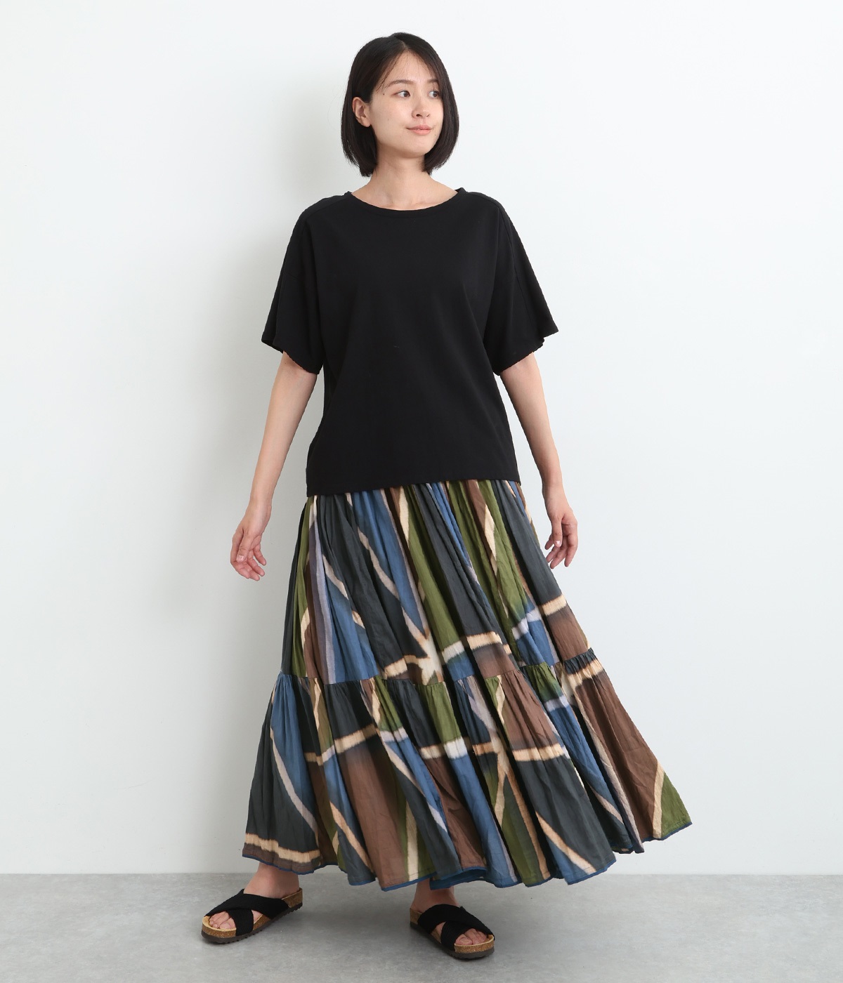 クリンクル加工を施し、独特のシワや縮みを出したボリュームたっぷりのスカートです。シワがあることにより肌にまとわりつきにくく、暑い日も快適に着こなすことができます。柄は一枚一枚職人が描いており、線の太さのムラやにじみがみられる味わい深い仕上がり。シンプルなTシャツ合わせでも着映えするデザインです。ウエストは細めの総ゴムに調節ヒモつきで、窮屈さを感じにくくお好みのサイズ感で着用できます。