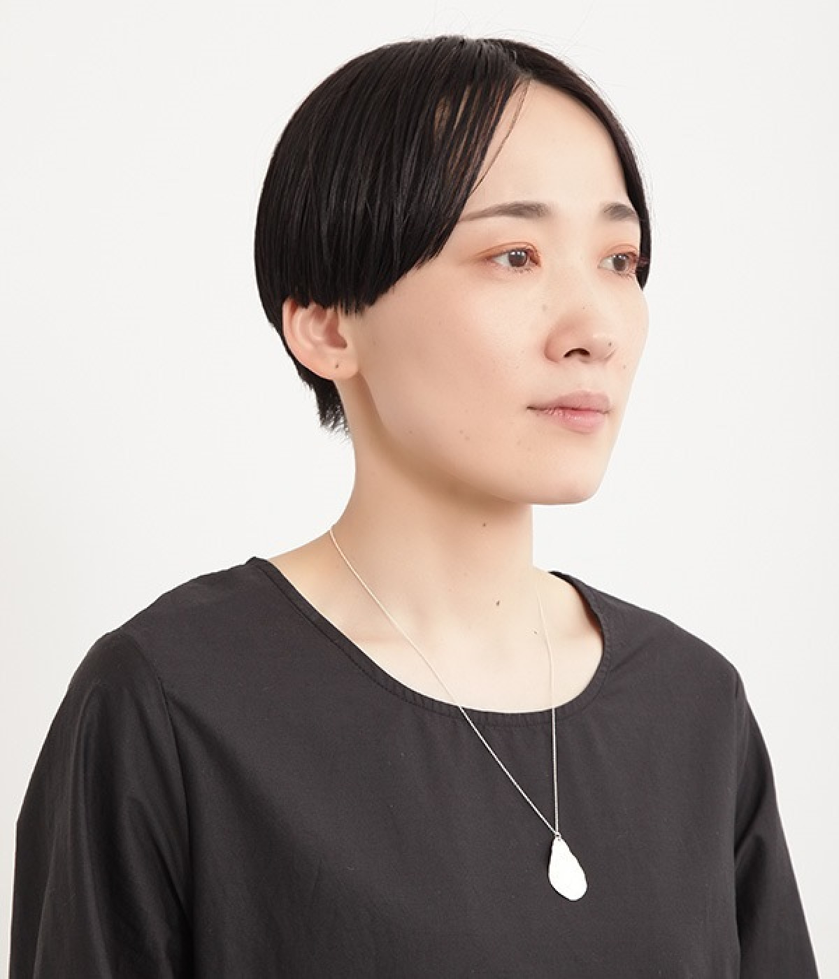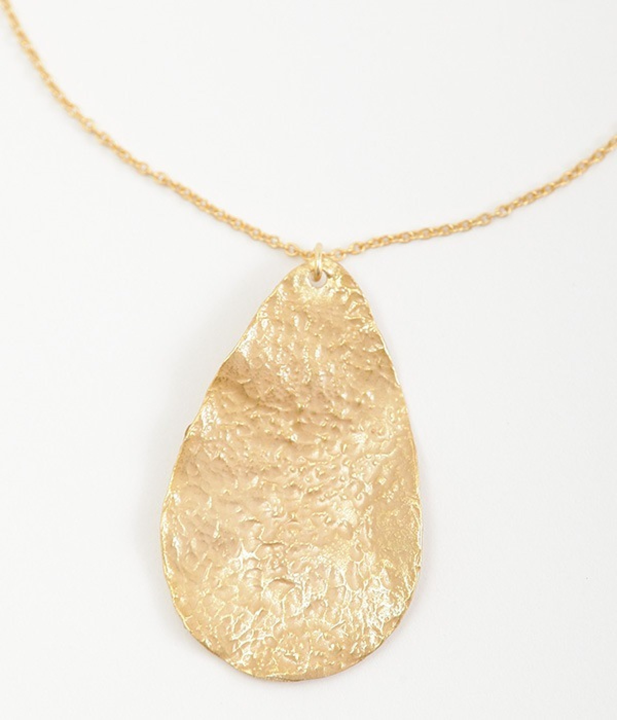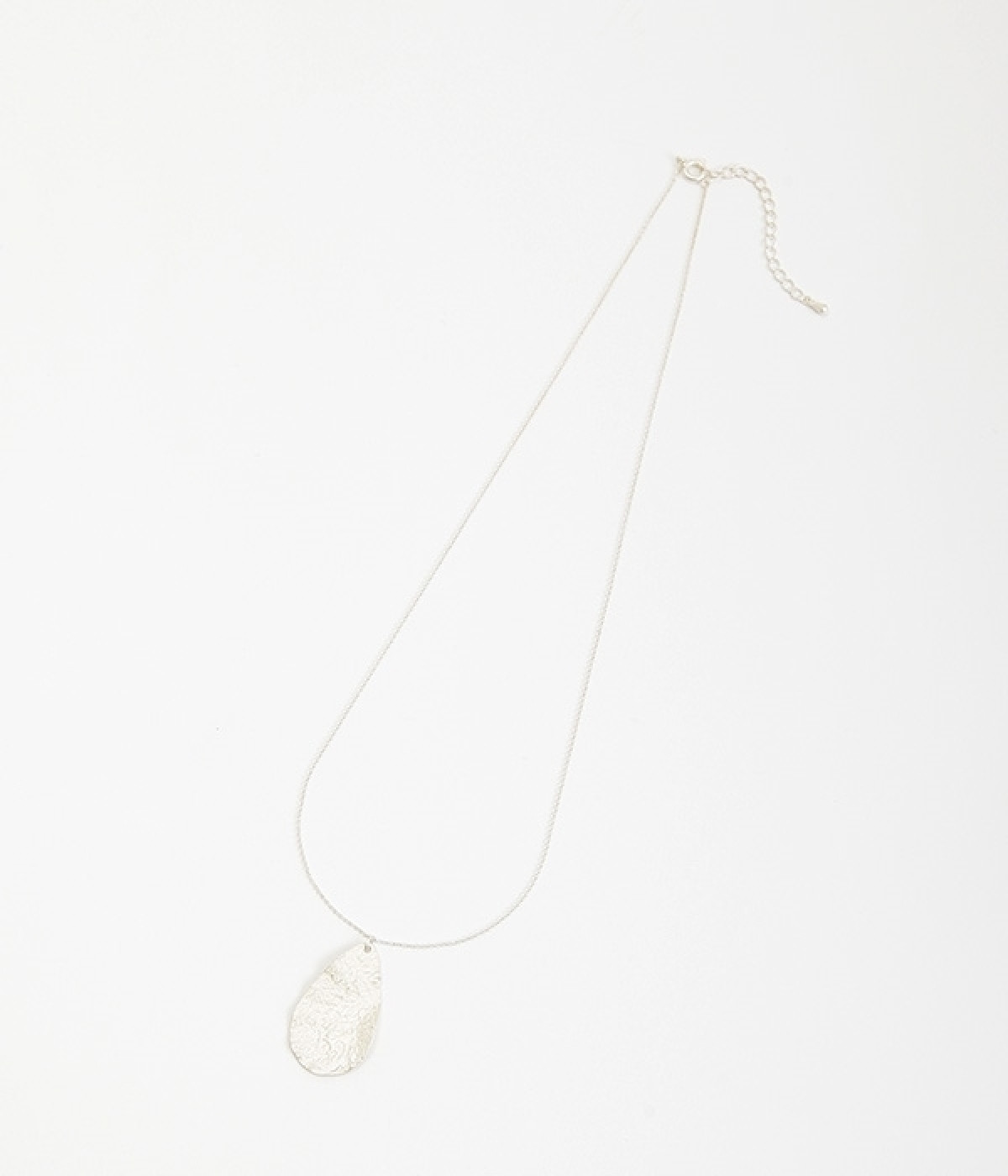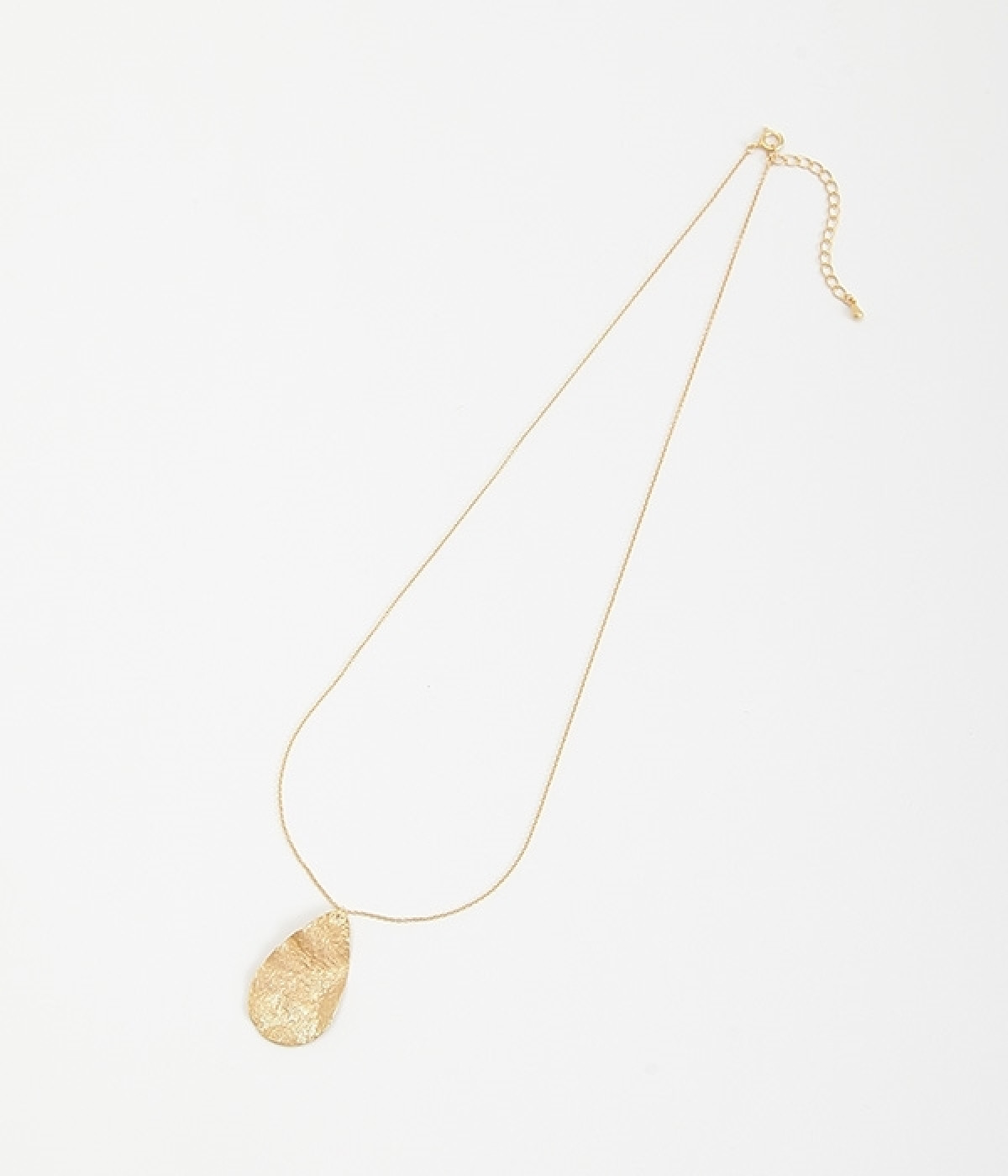 しずく型の薄いプレートにテクスチャーを施した動きのある表情豊かなモチーフのネックレスです。華奢なゴールドチェーンと光沢を抑えたプレートの色合いが相まって上品な仕上がりになっており、普段使いから特別感のあるお出かけシーンの装いまで幅広く対応できます。軽い付け心地と、金属アレルギーに優しいニッケルフリーの加工を施した作りも嬉しいポイントです。