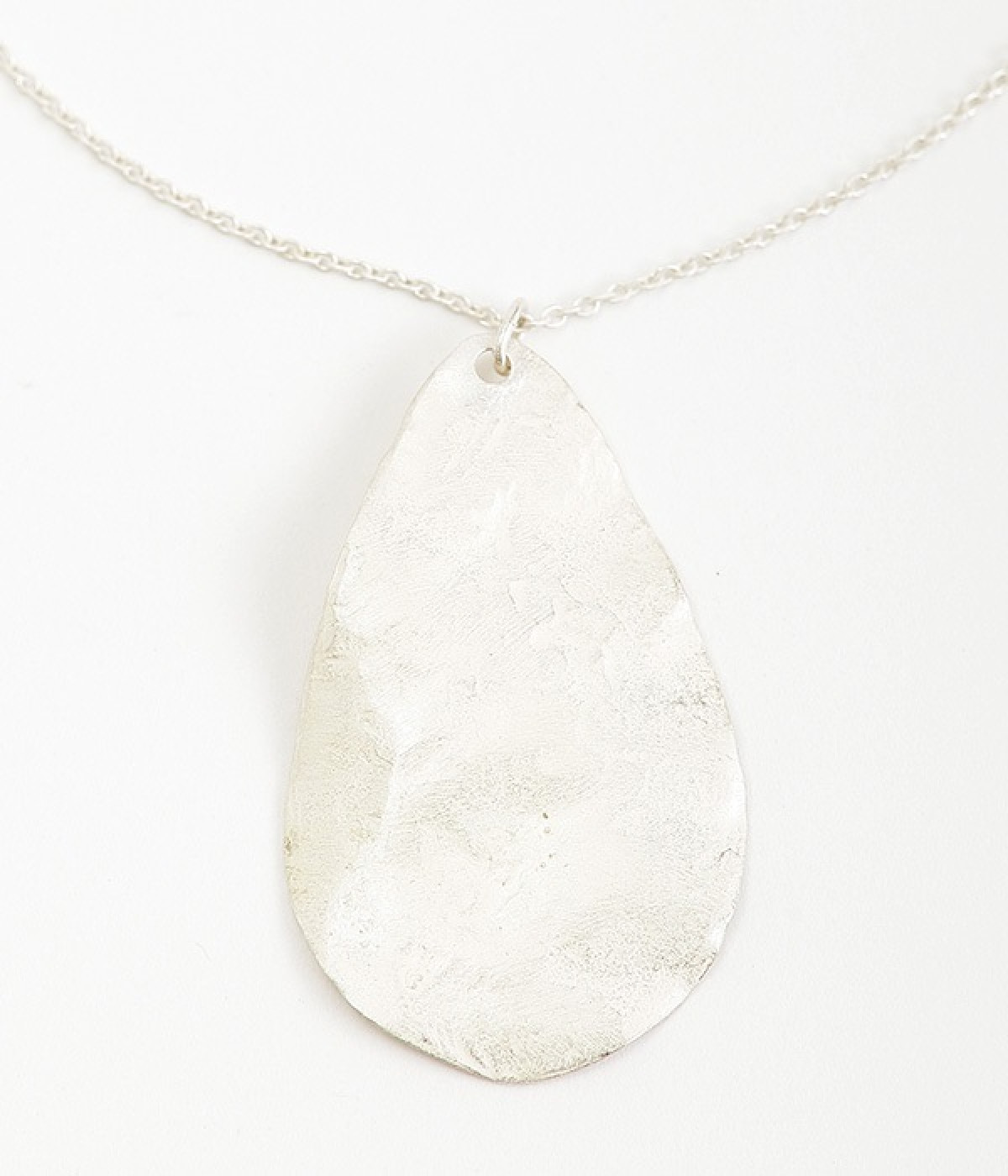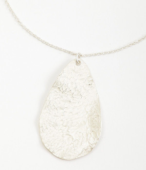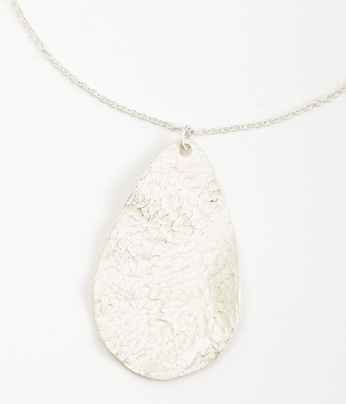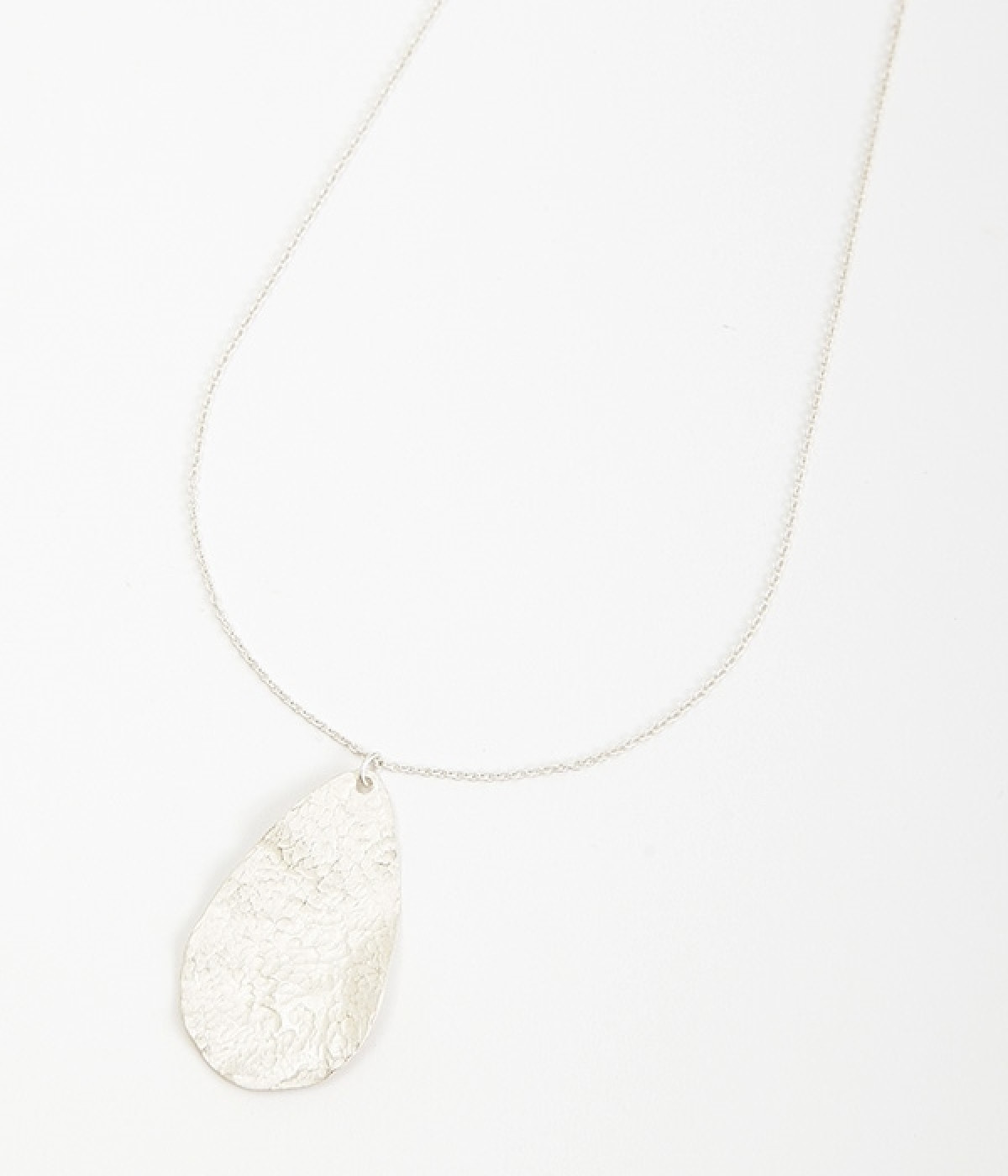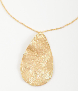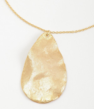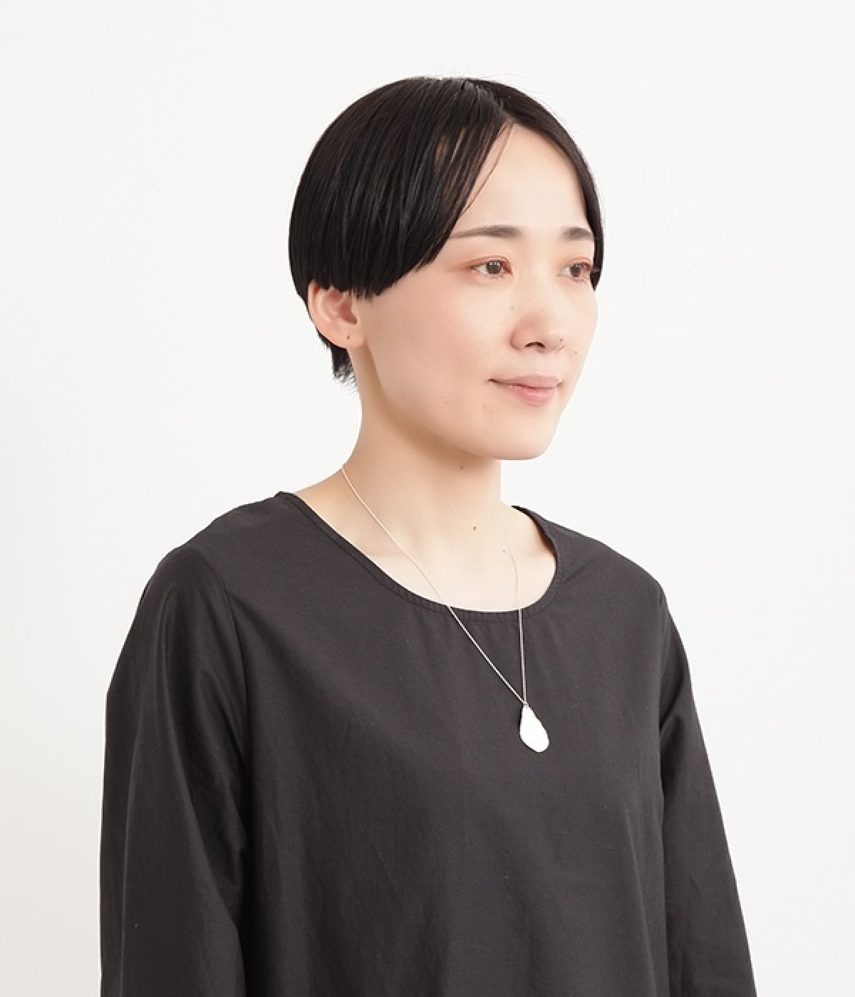 しずく型の薄いプレートにテクスチャーを施した動きのある表情豊かなモチーフのネックレスです。華奢なゴールドチェーンと光沢を抑えたプレートの色合いが相まって上品な仕上がりになっており、普段使いから特別感のあるお出かけシーンの装いまで幅広く対応できます。軽い付け心地と、金属アレルギーに優しいニッケルフリーの加工を施した作りも嬉しいポイントです。