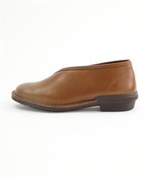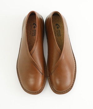 1956年から革靴生産を担ってきた佐賀の工場でゆっくり時間をかけ、丁寧に作られたムーンスター「SLOW FACTORY」。甲の部分はやわらかく屈曲性がよいステッチダウン製法、かかとまわりは革を内側に包み込むつり込み式でしっかりと足をホールド。ソールは足なりの形に立体的にフィットし、ソールそのものがフットベッドの役割をはたすので足にやさしい仕上がりです。着物の衿もとをイメージしたデザインが個性的な和を思わせるスリッポン。シンプルなので意外にもスタイルを選ばない一足です。
