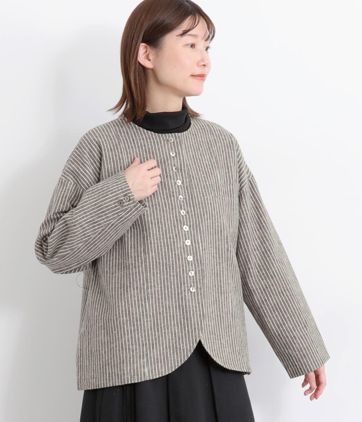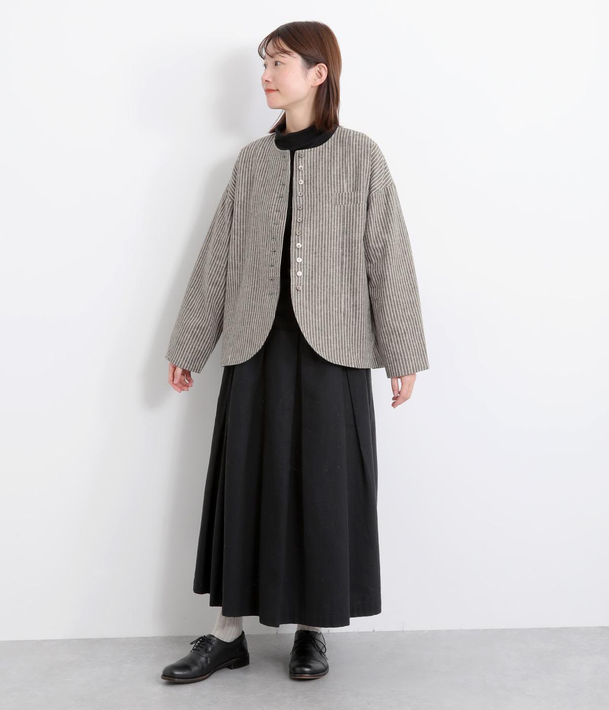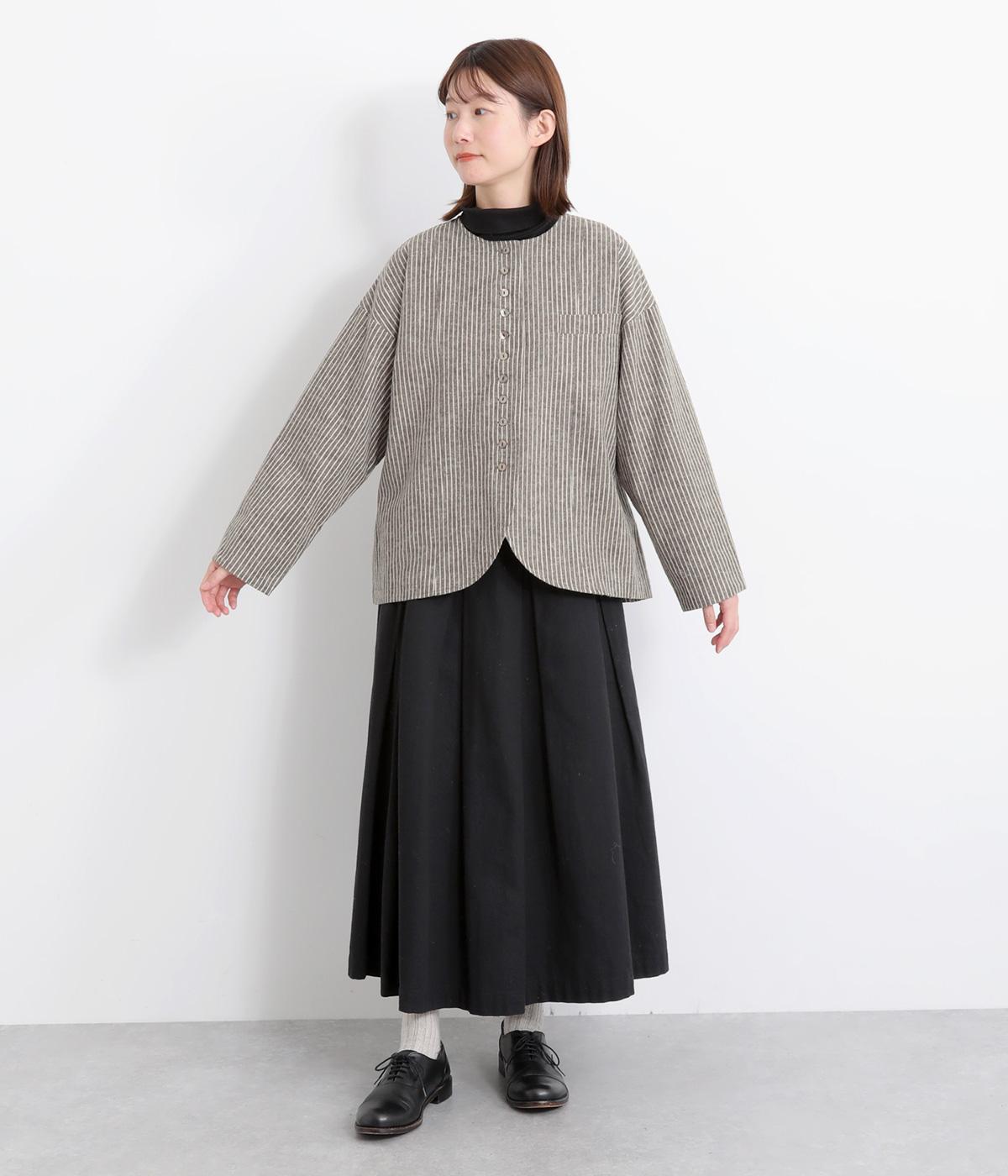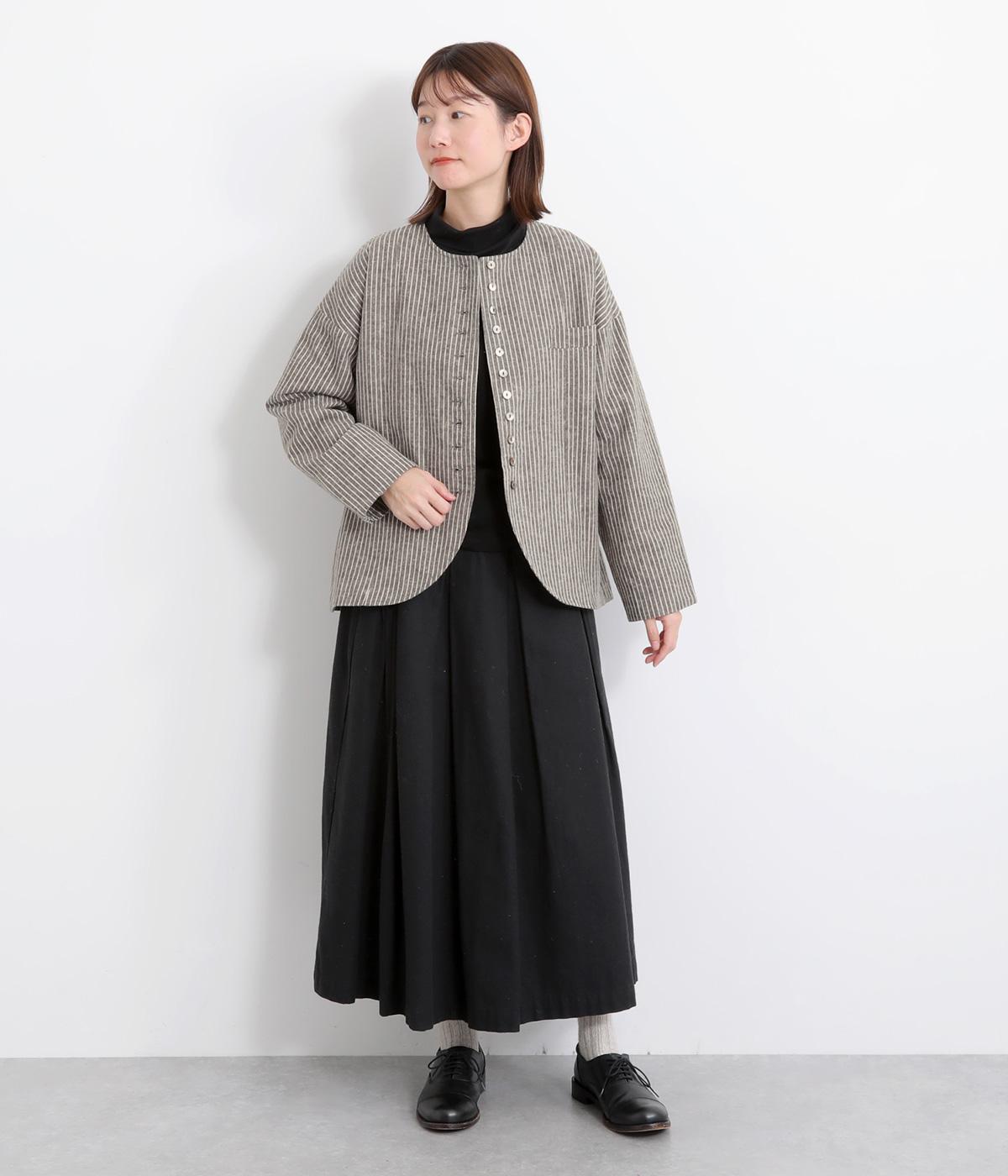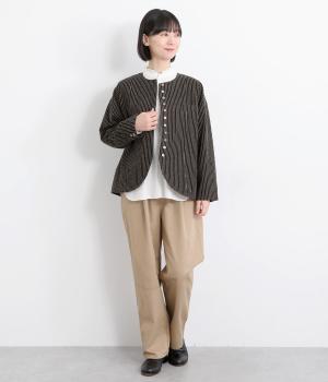 やわらかな綿麻生地の表面にほんのりと起毛をほどこして、秋冬ムードを高めた素材です。落ち着いた色合いのストライプ柄がきちんと感も演出。