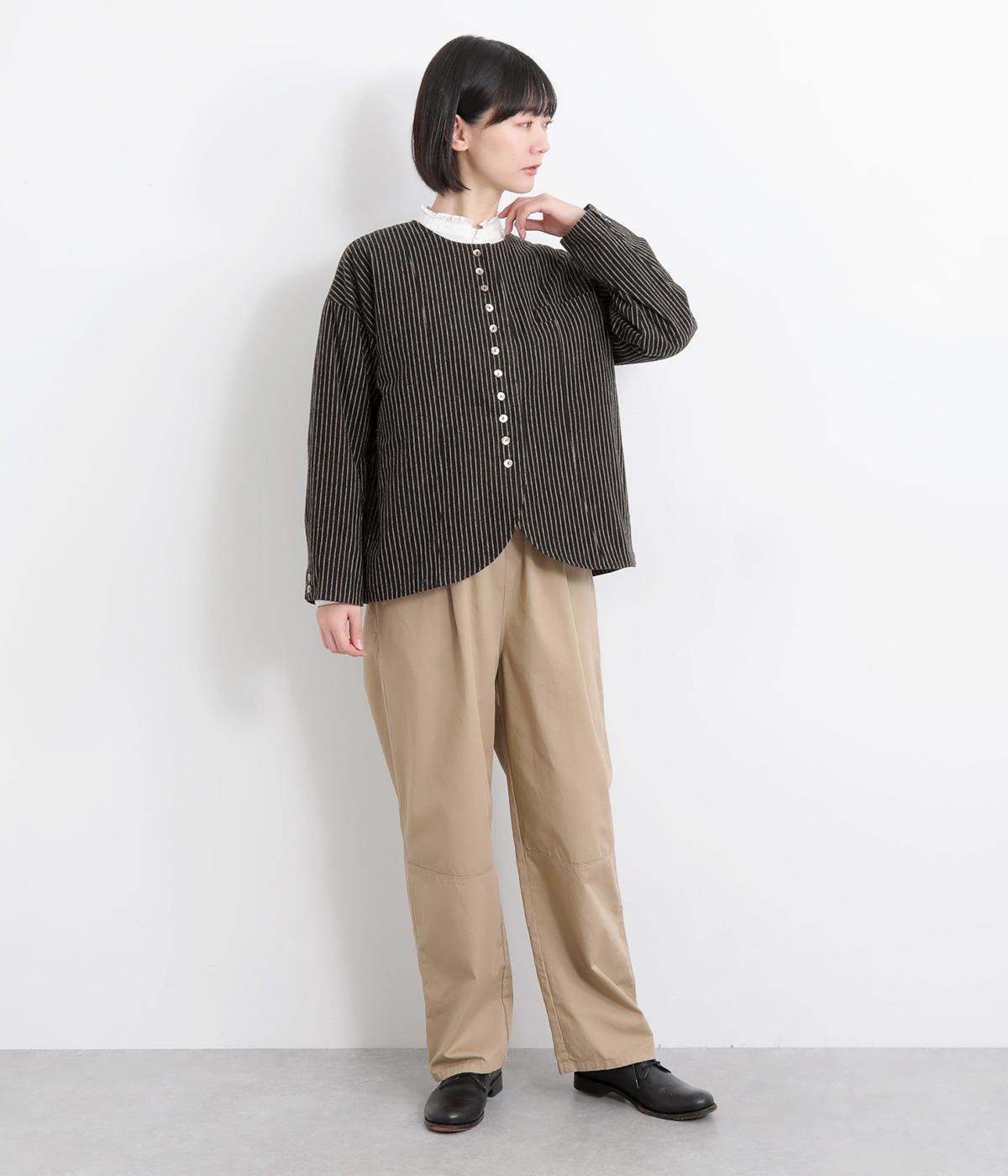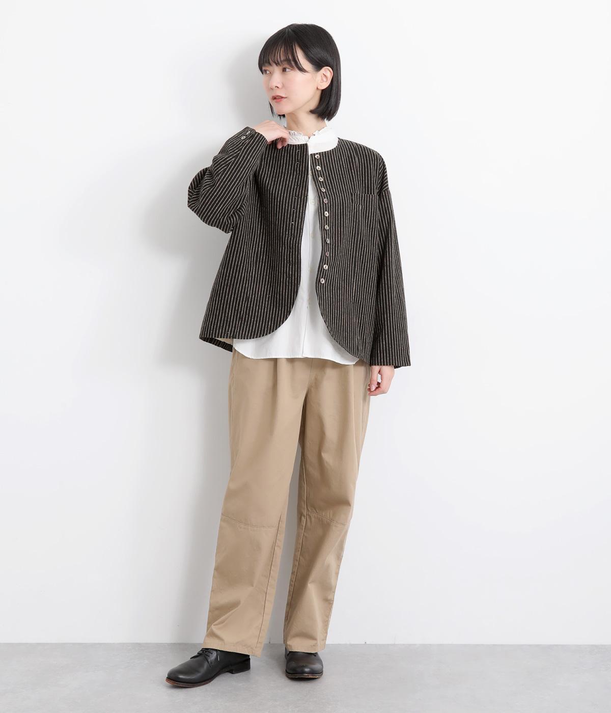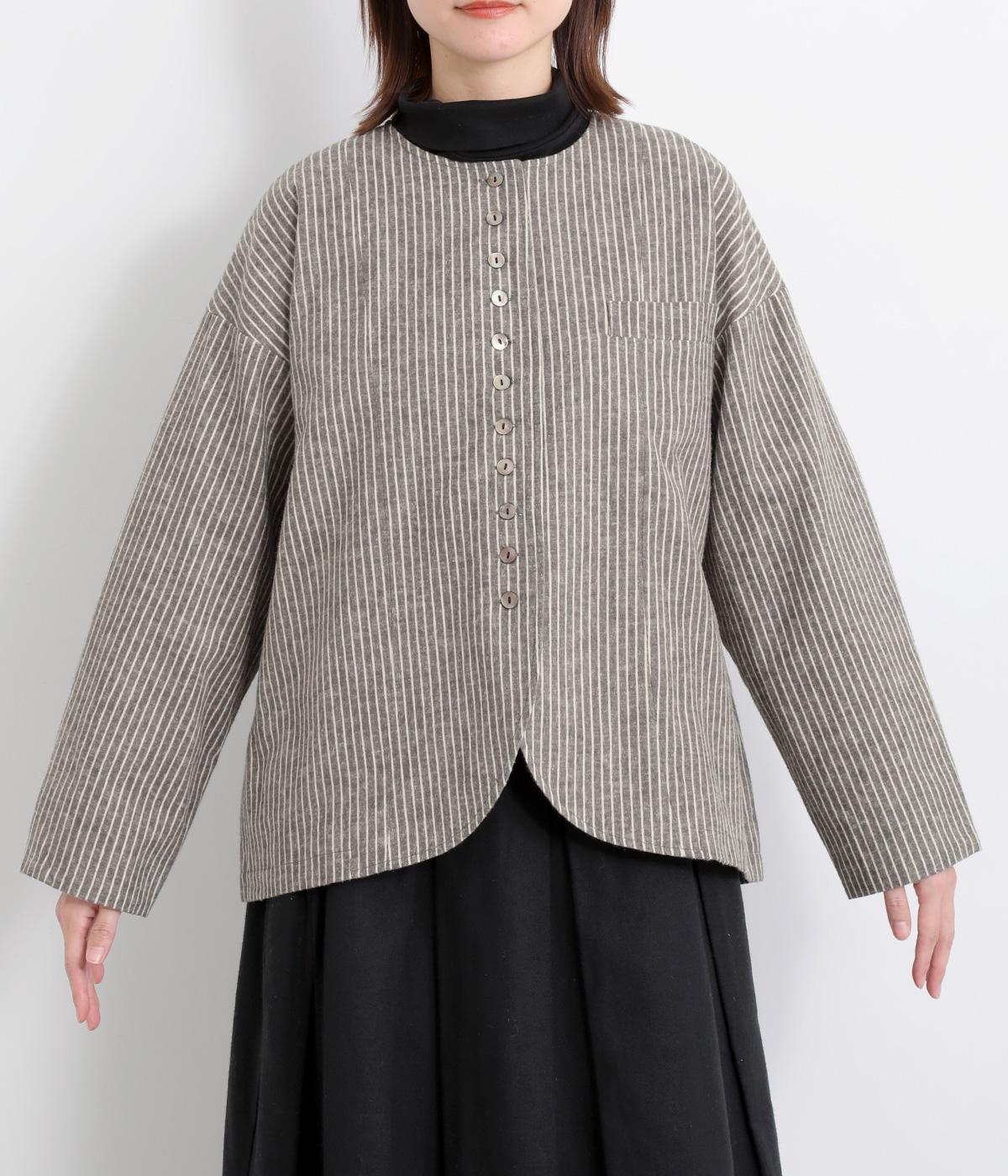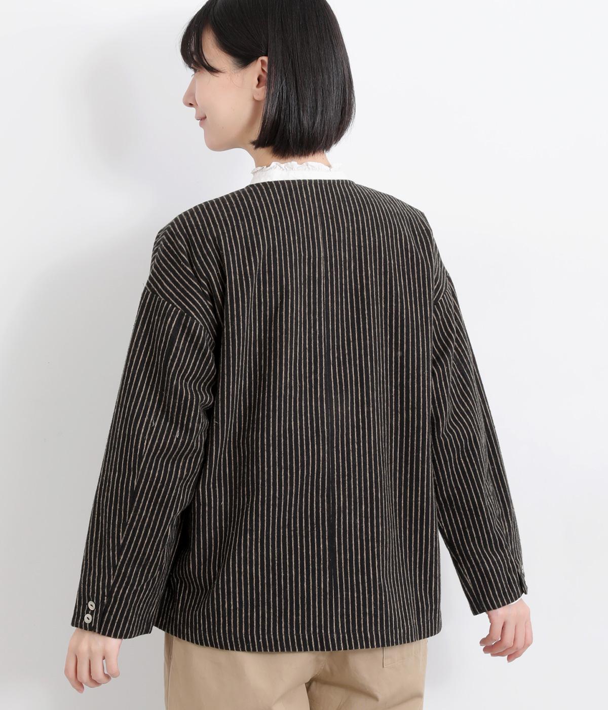 やわらかな綿麻生地の表面にほんのりと起毛をほどこして、秋冬ムードを高めた素材です。落ち着いた色合いのストライプ柄がきちんと感も演出。
