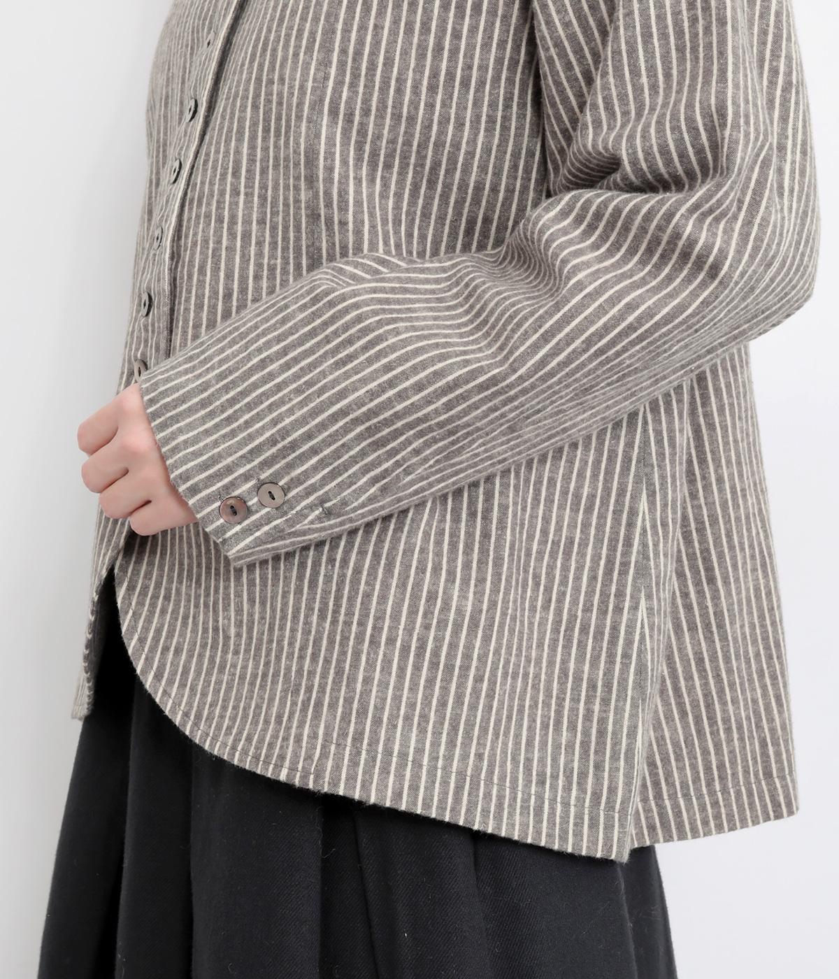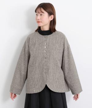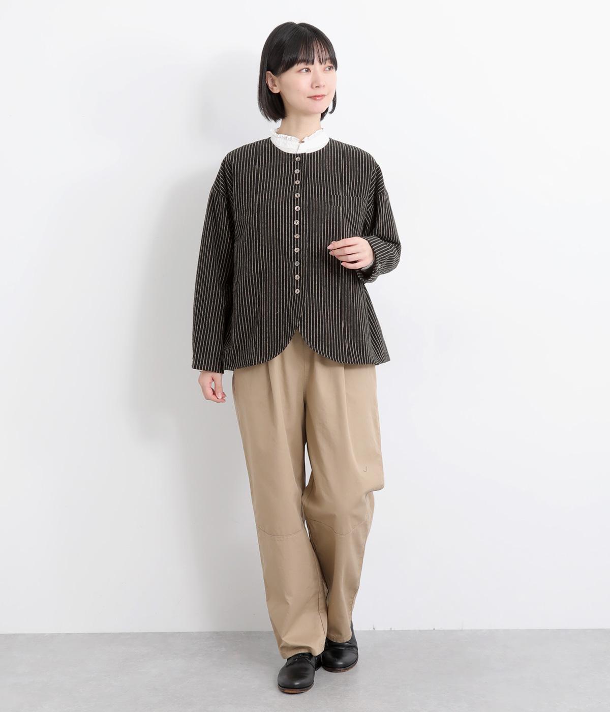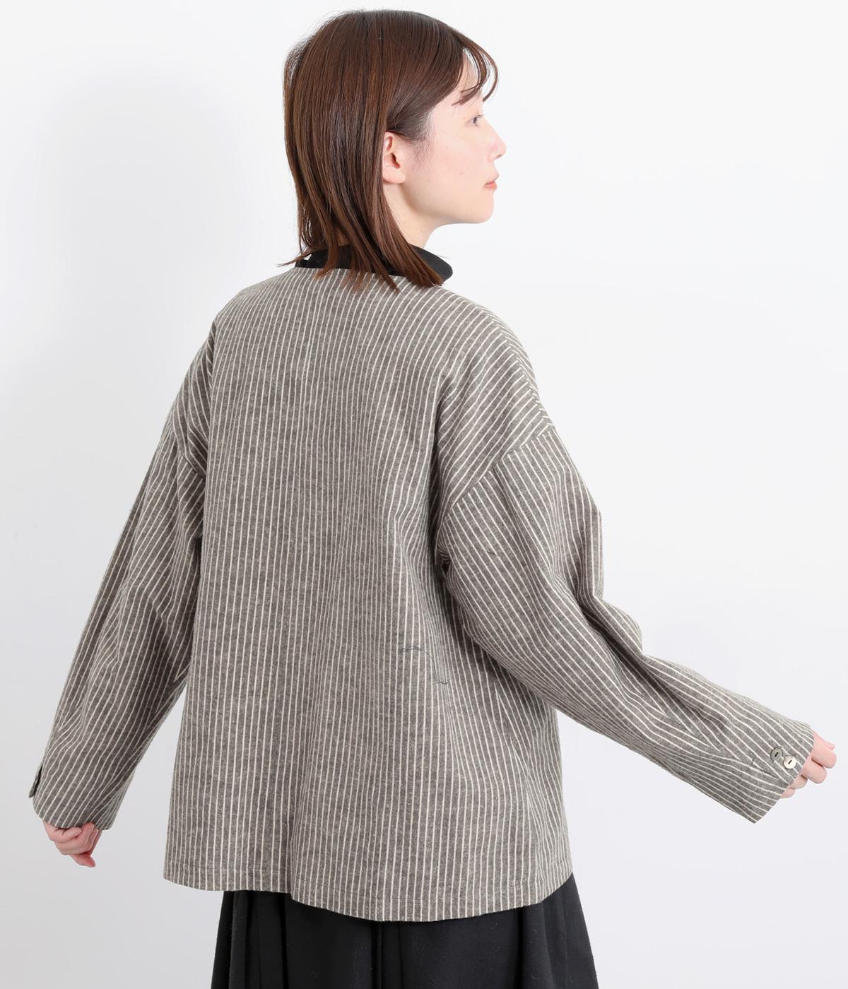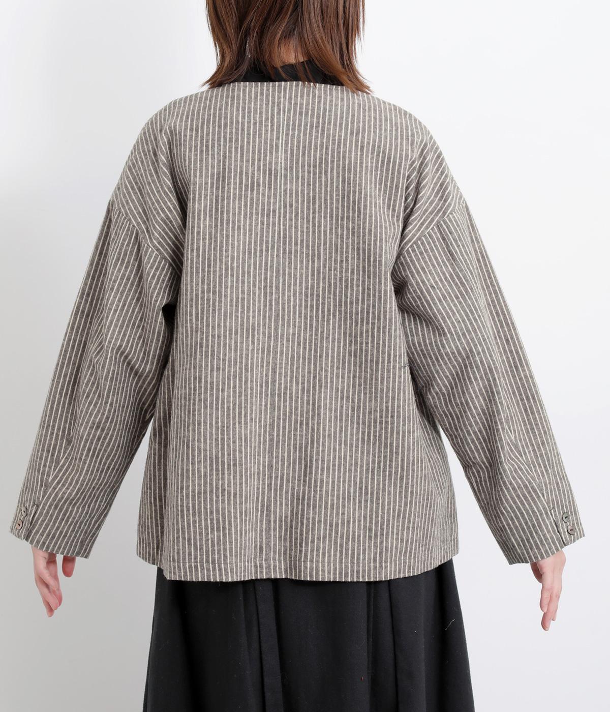 やわらかな綿麻生地の表面にほんのりと起毛をほどこして、秋冬ムードを高めた素材です。落ち着いた色合いのストライプ柄がきちんと感も演出。