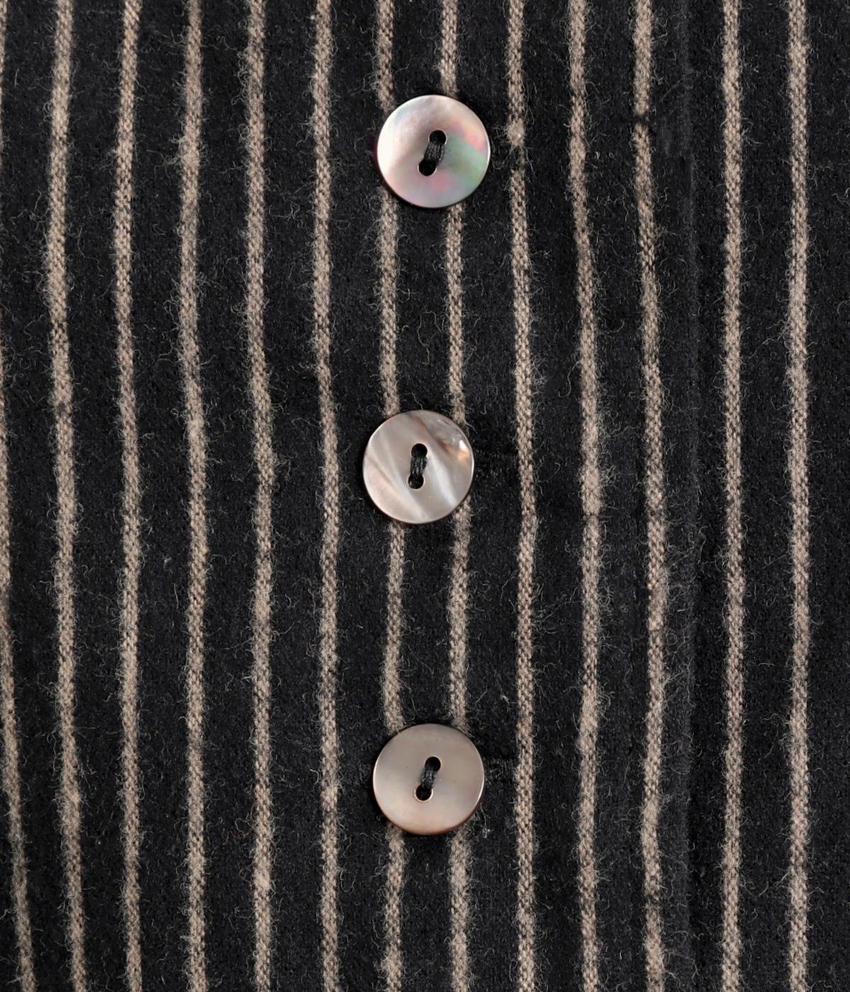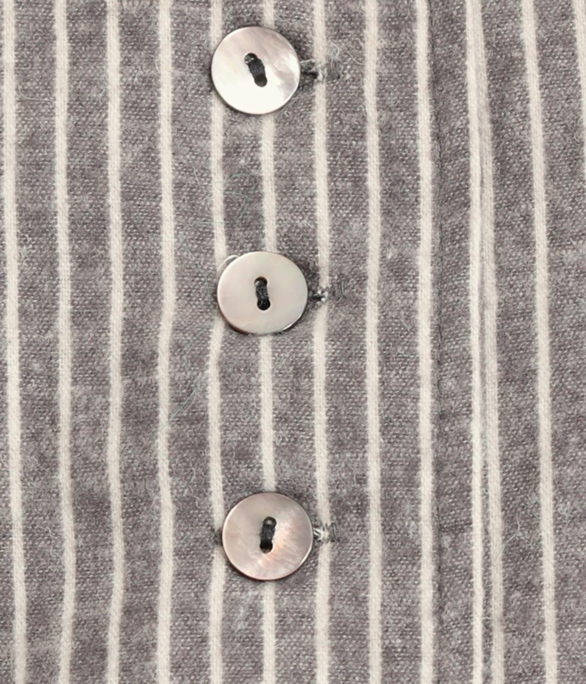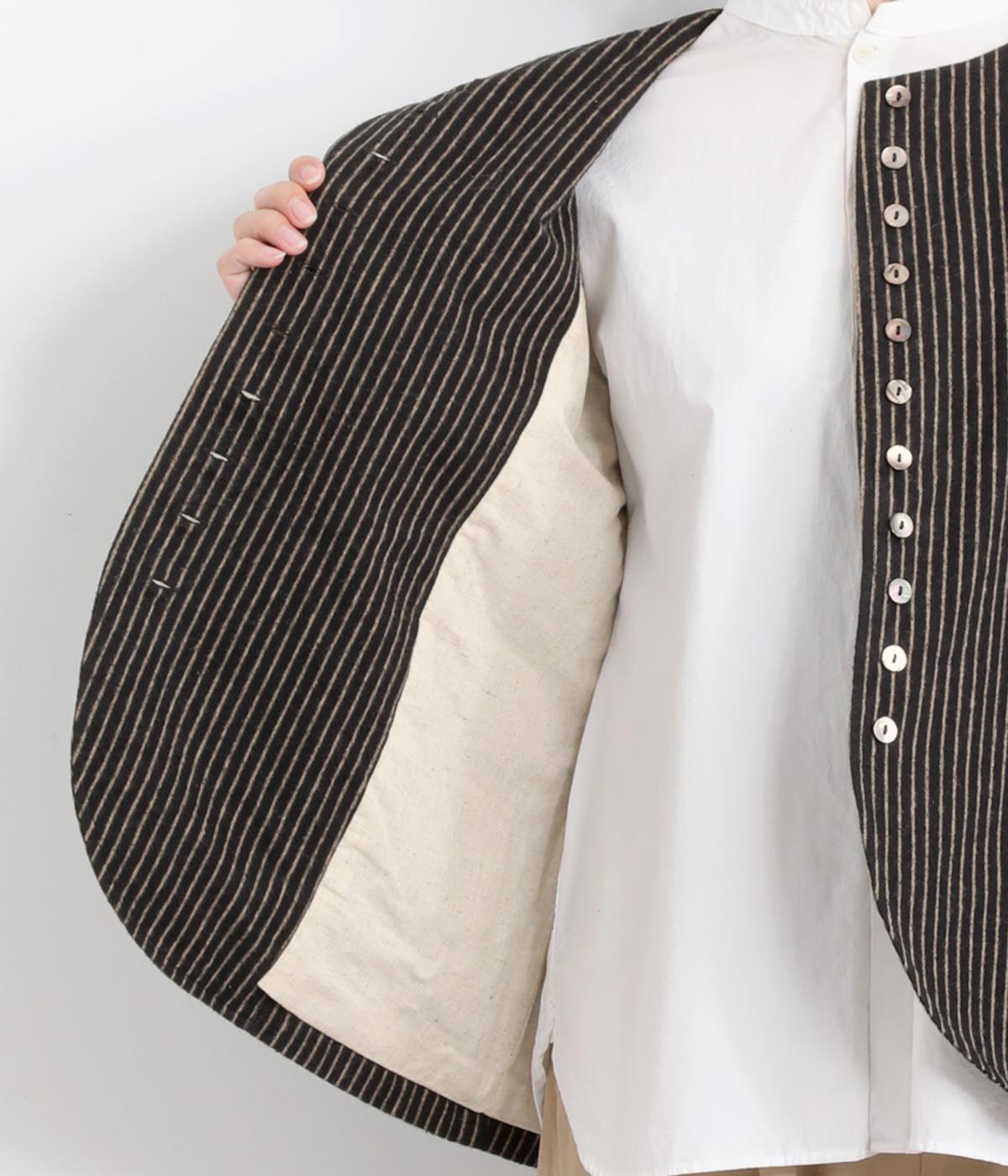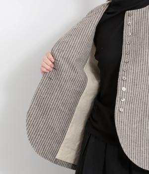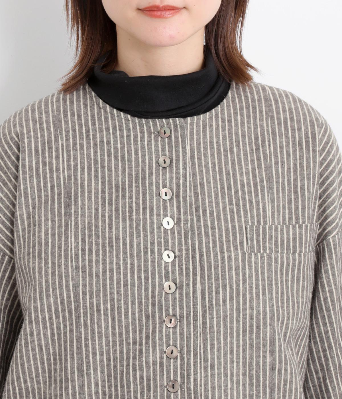 やわらかな綿麻生地の表面にほんのりと起毛をほどこして、秋冬ムードを高めた素材です。落ち着いた色合いのストライプ柄がきちんと感も演出。