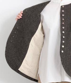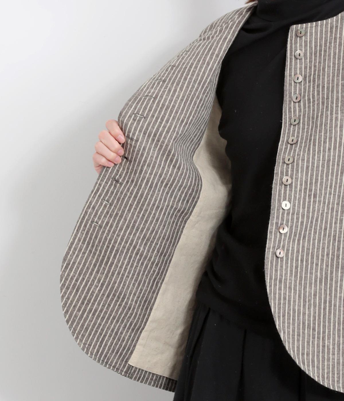 ゆったりと身幅をもたせたリラクシーなシルエットのジャケットです。前裾をラウンドカットした軽やかなショート丈はボトムとのバランスも取りやすく、様々なスタイリングと好相性。前をあけてラフにカーディガン感覚で着用するのも◎。