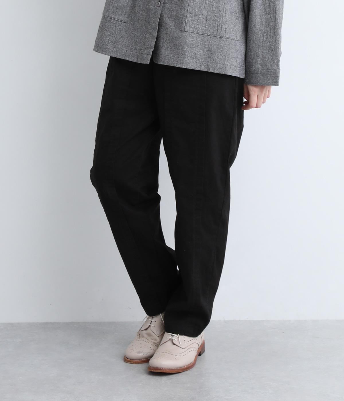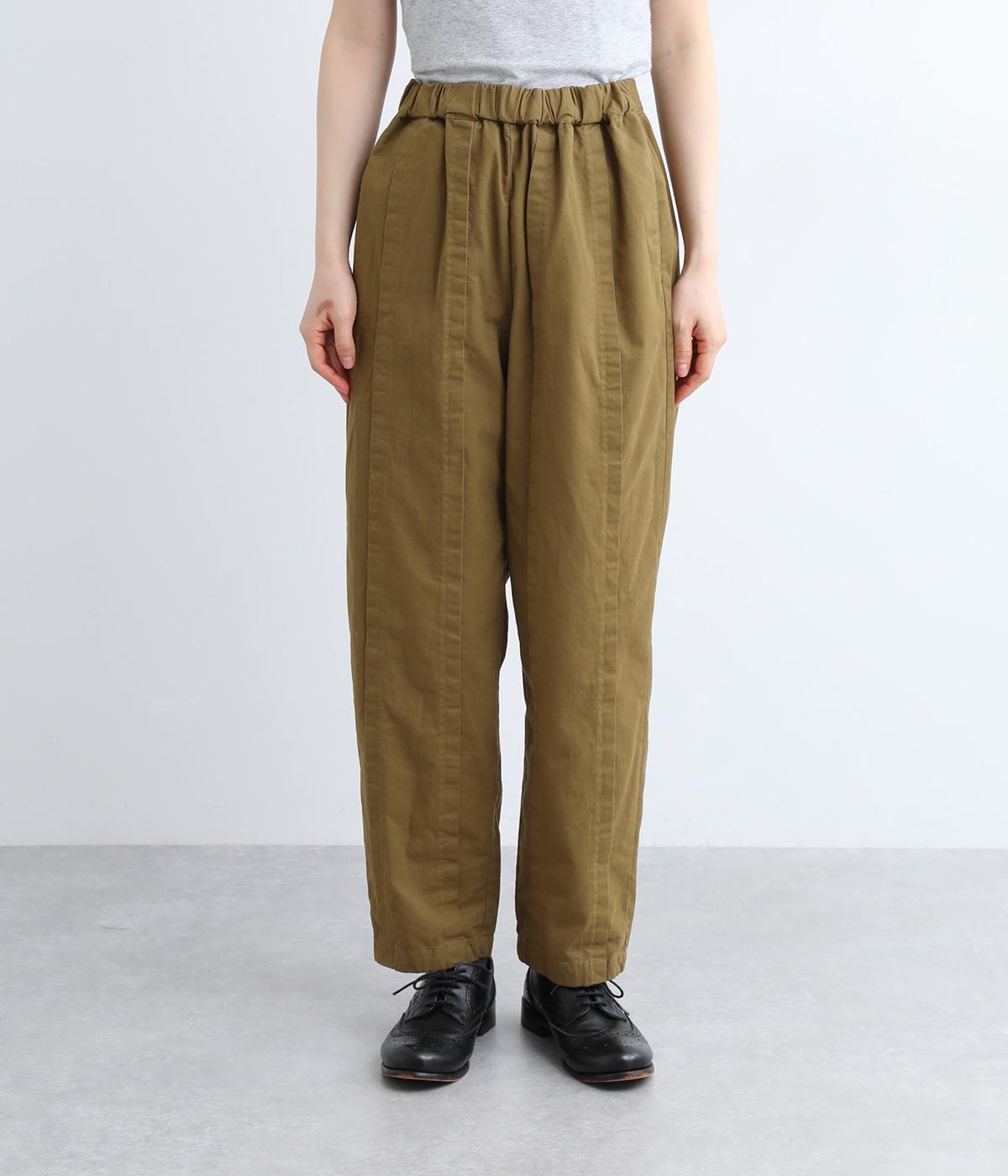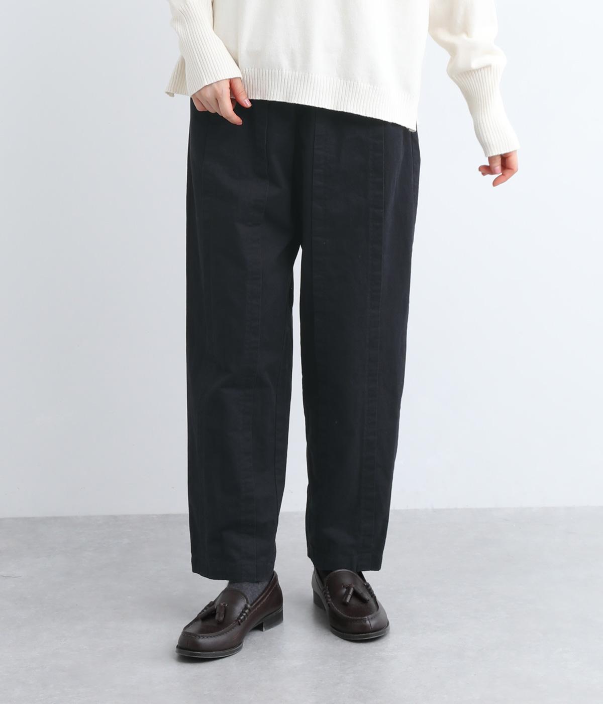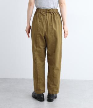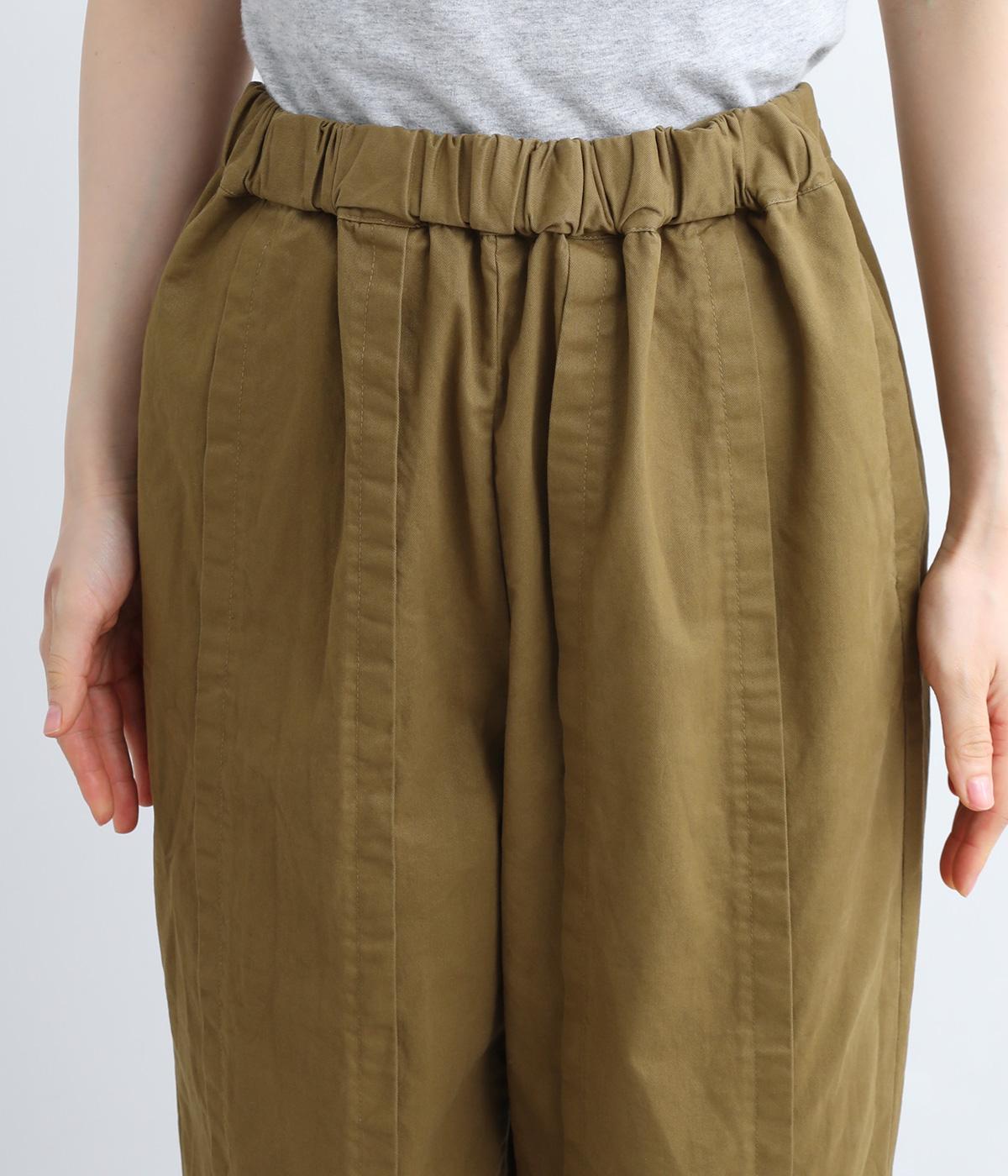 ウエストから太ももまでタックをとり、裾に向かって細くなっていくテーパードシルエットと足元まで伸びるステッチラインが洗練されたデザイン。お腹まわりやヒップラインをカバーできるのも、嬉しいポイントです。ウエストは総ゴム仕様で、内紐でサイズ調節ができます。