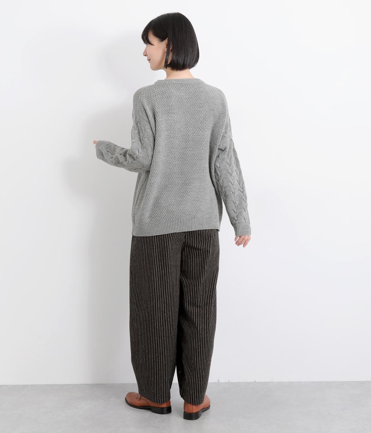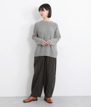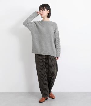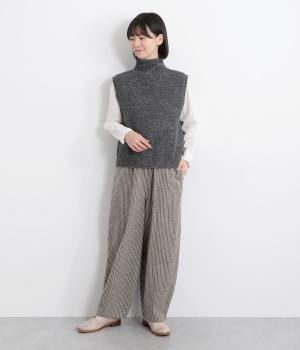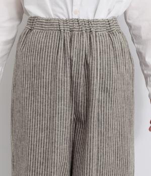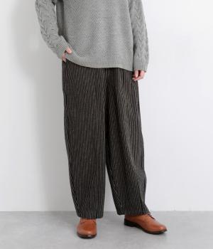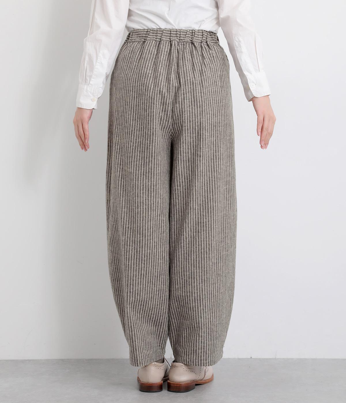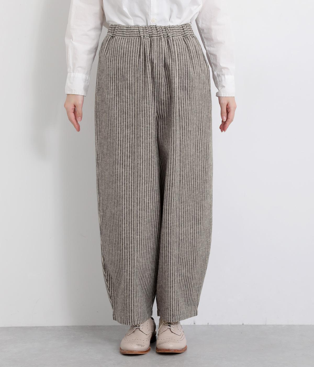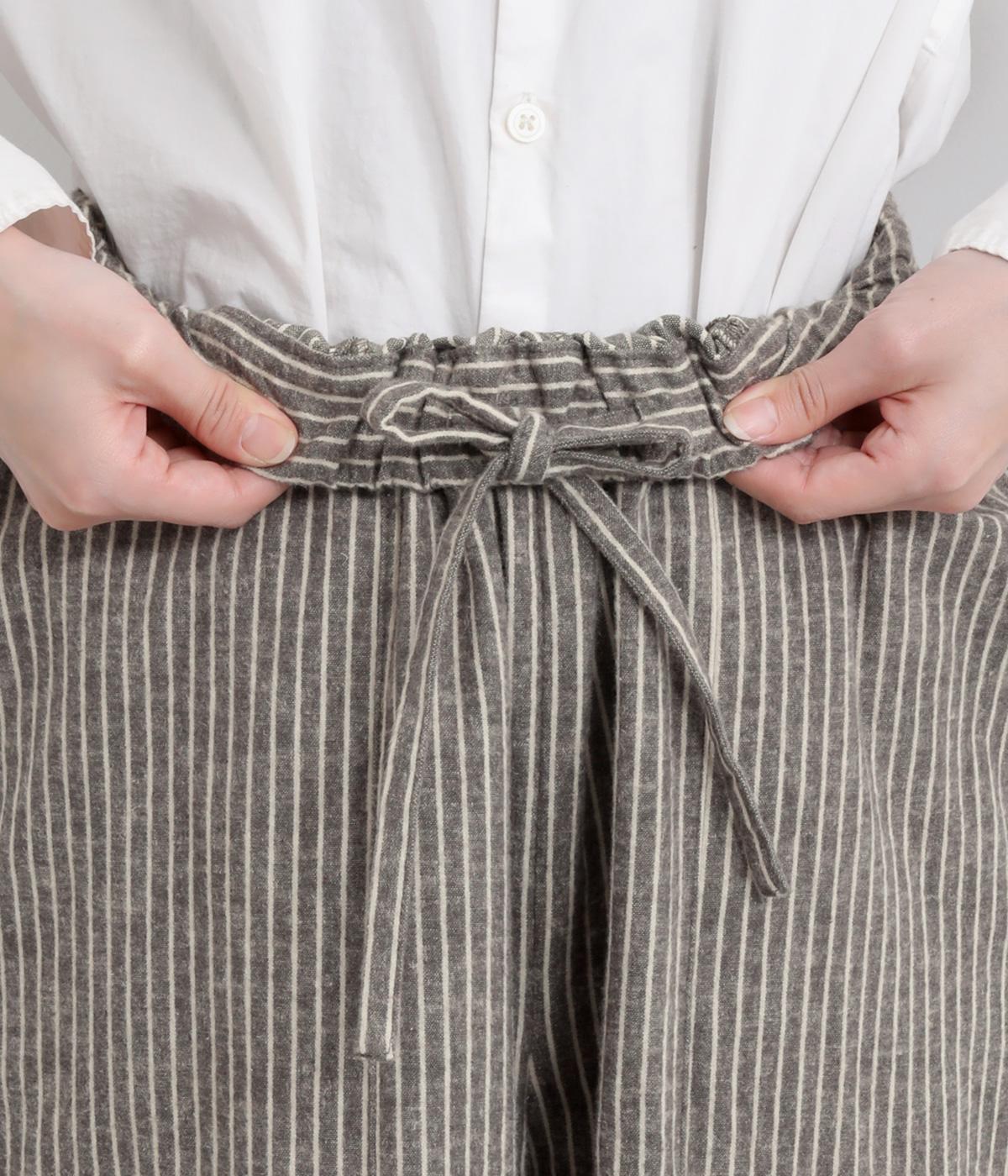 センター切り替えですっきりと見せつつも、立体的でふんわりと丸みをもたせたコクーンシルエットがかわいらしいパンツです。ウエストは伸びのよい総ゴム仕様で、内側に通した紐で調節もできます。