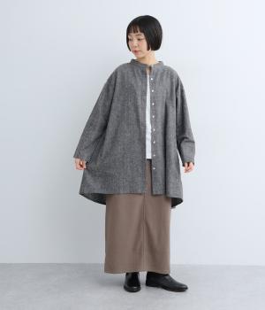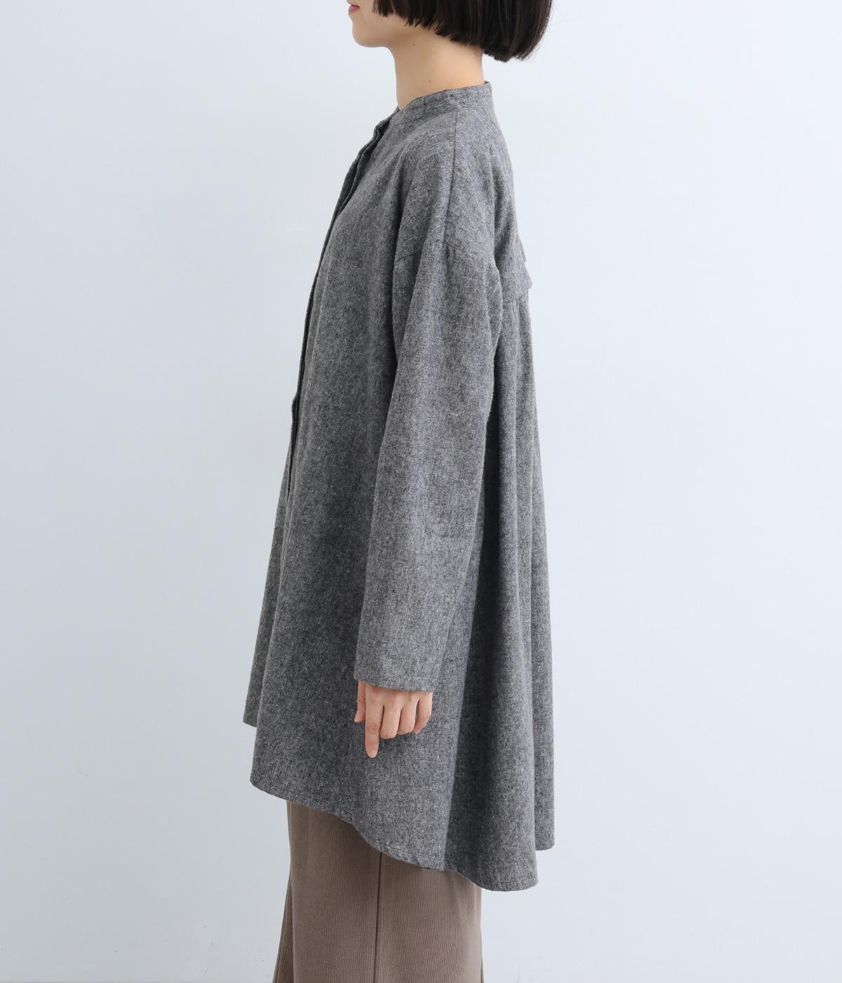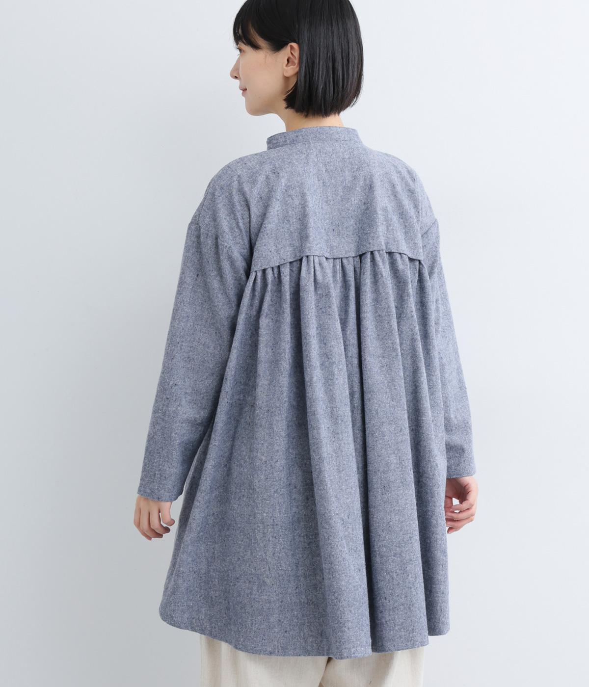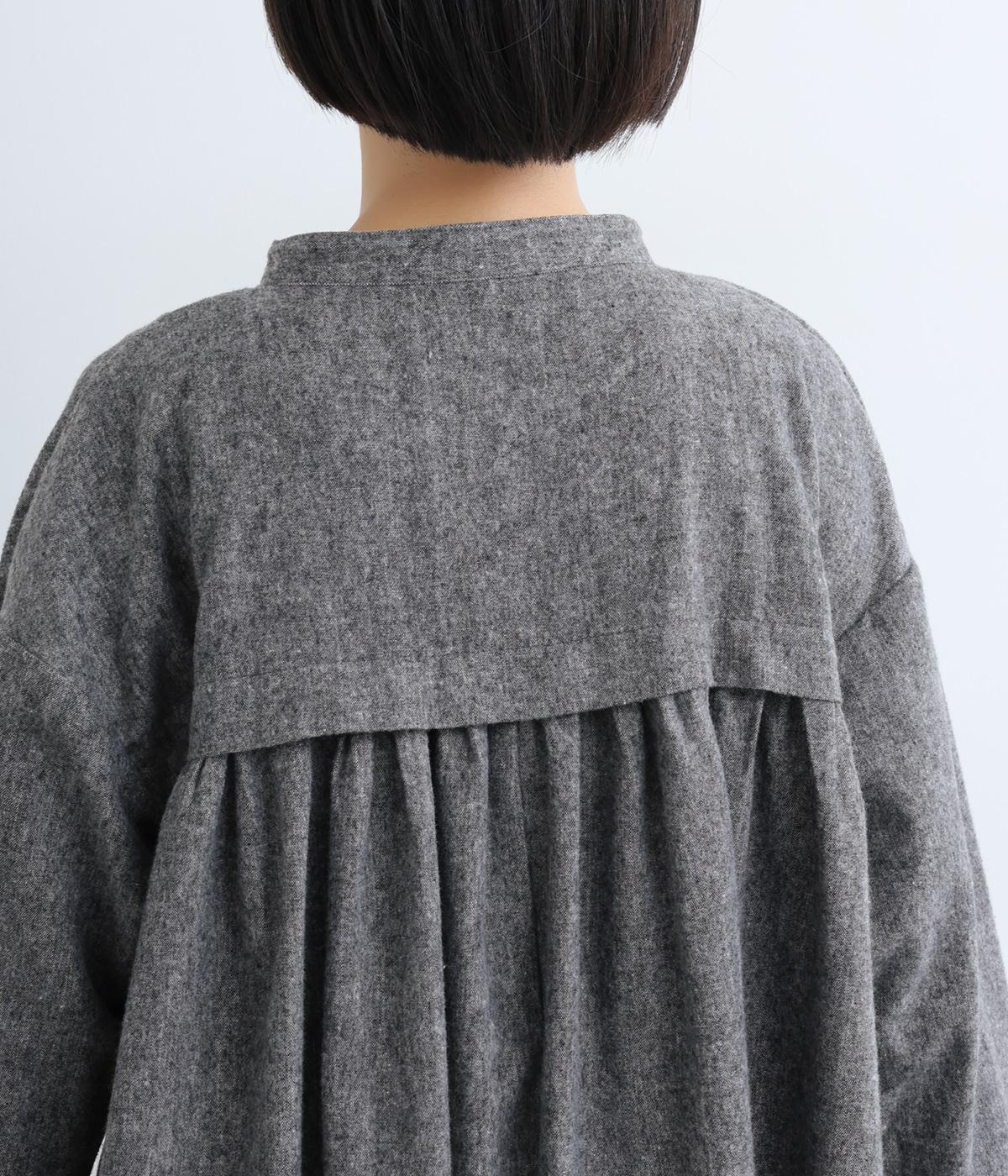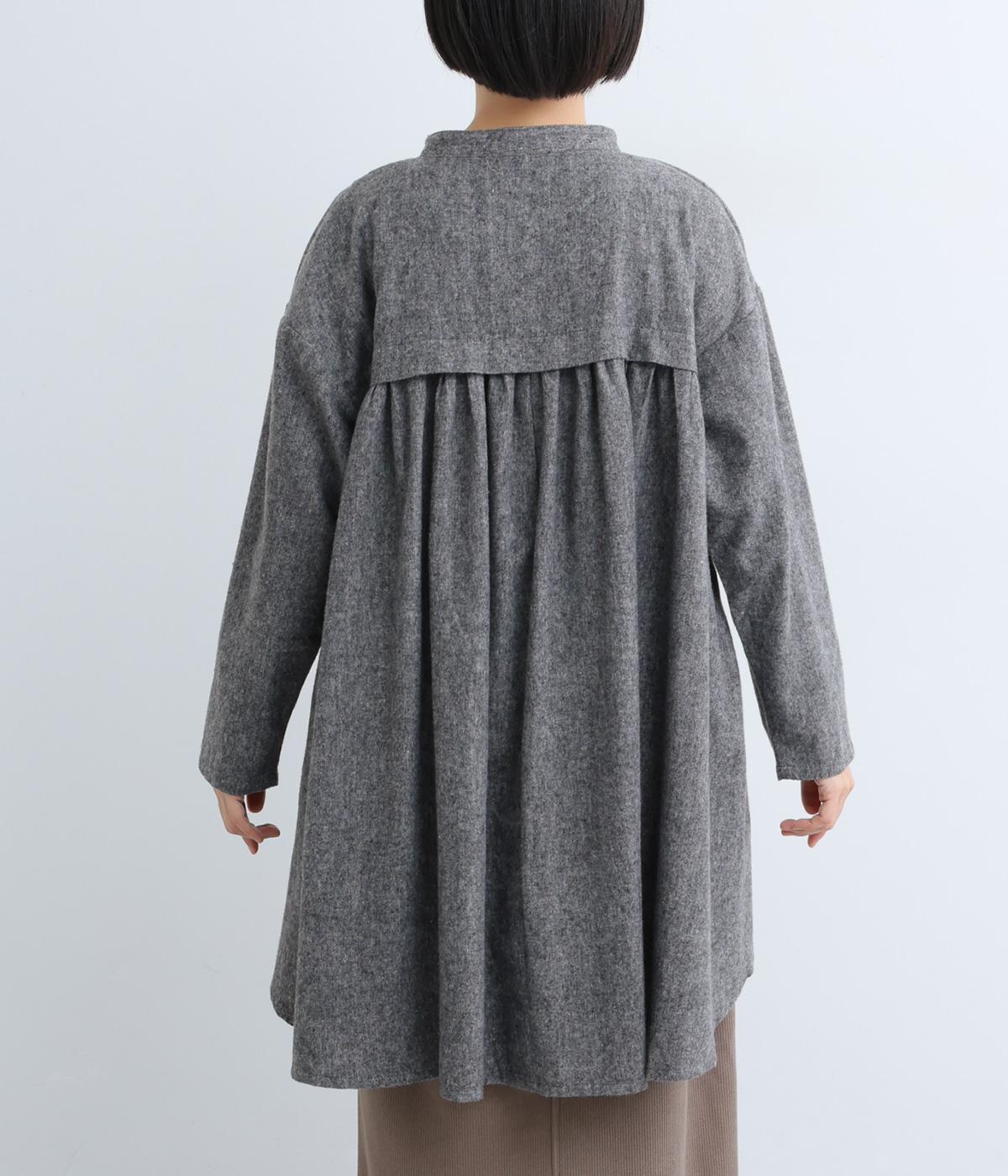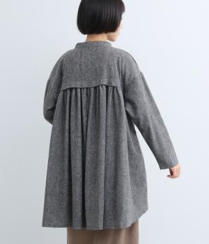 後ろ身ごろのギャザーのあしらいと、やや長めのレングスで立体感を演出しています。全体のおだやかなラインが美しく、裾にかけてふんわりと広がっていくシルエットが女性らしい印象。ドロップショルダーがこなれ感を与えてくれます。