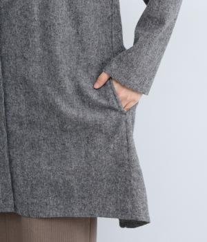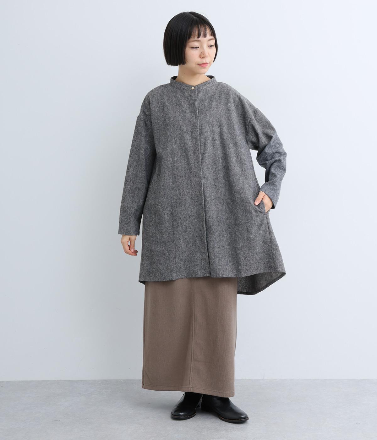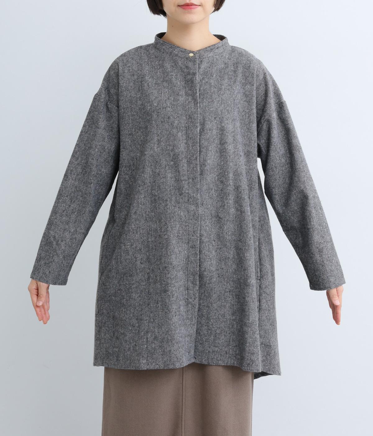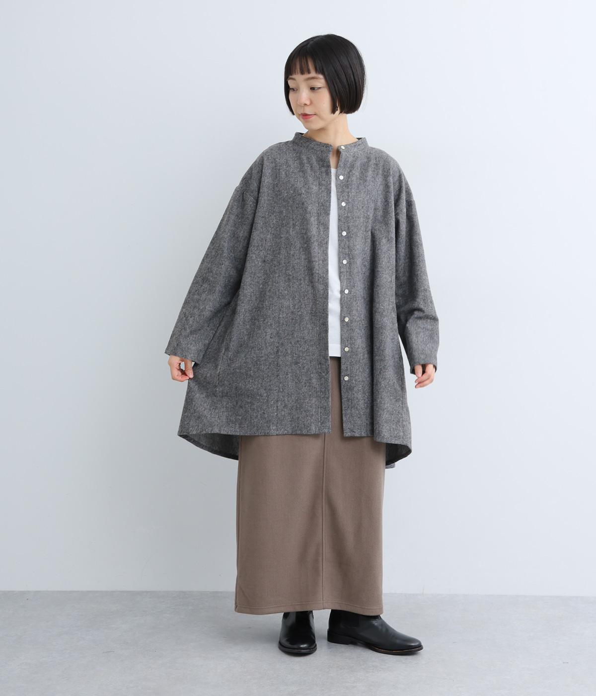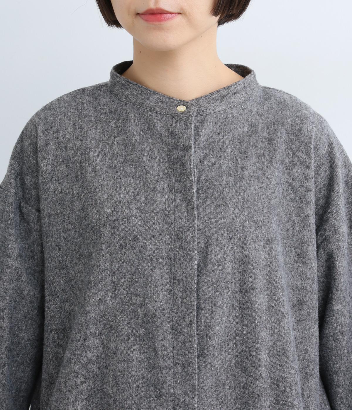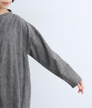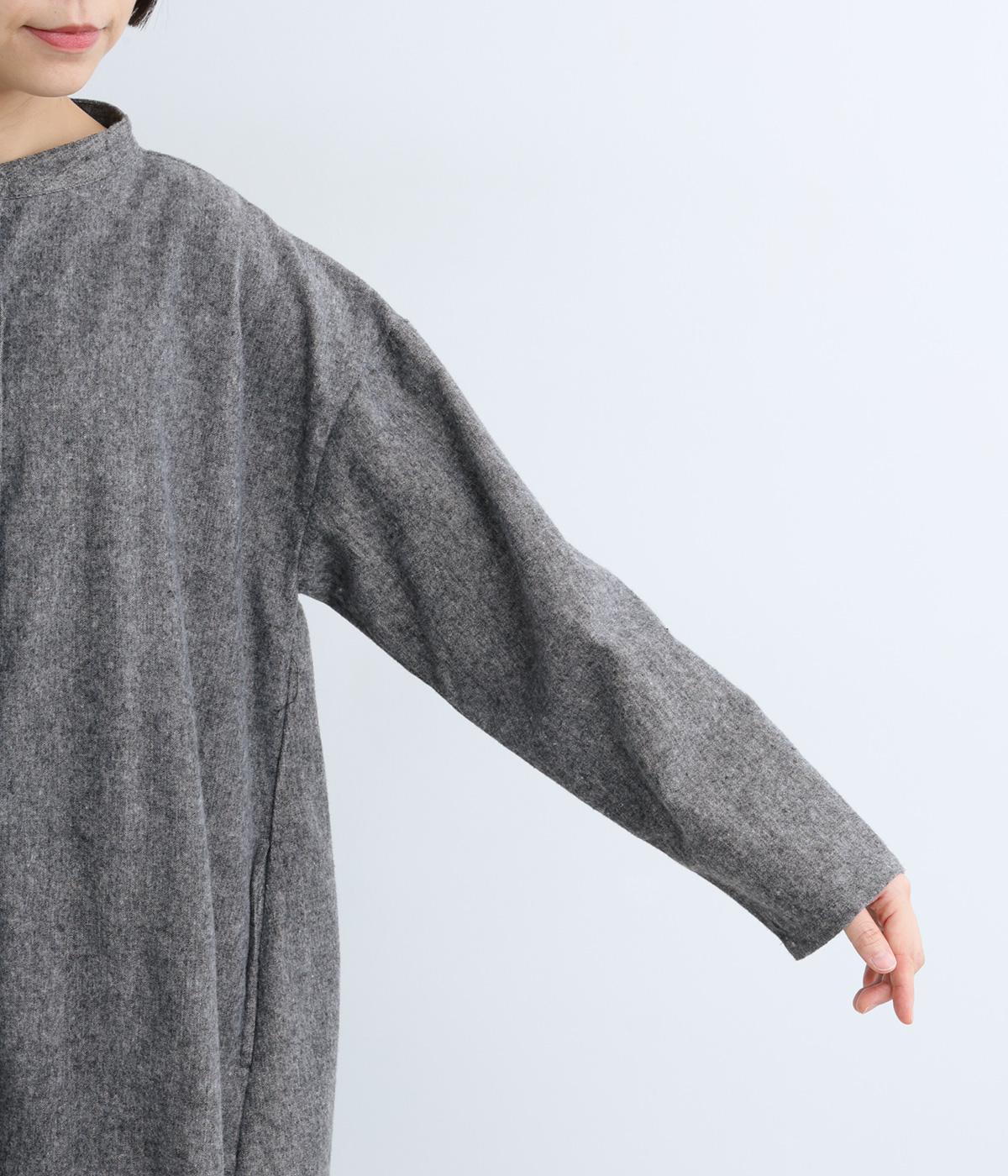 後ろ身ごろのギャザーのあしらいと、やや長めのレングスで立体感を演出しています。全体のおだやかなラインが美しく、裾にかけてふんわりと広がっていくシルエットが女性らしい印象。ドロップショルダーがこなれ感を与えてくれます。