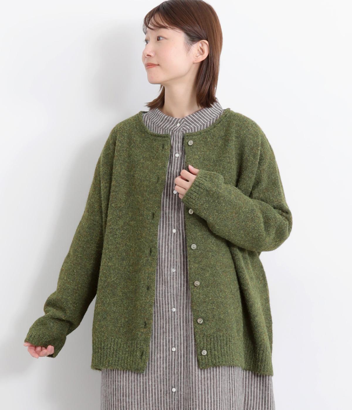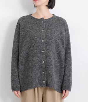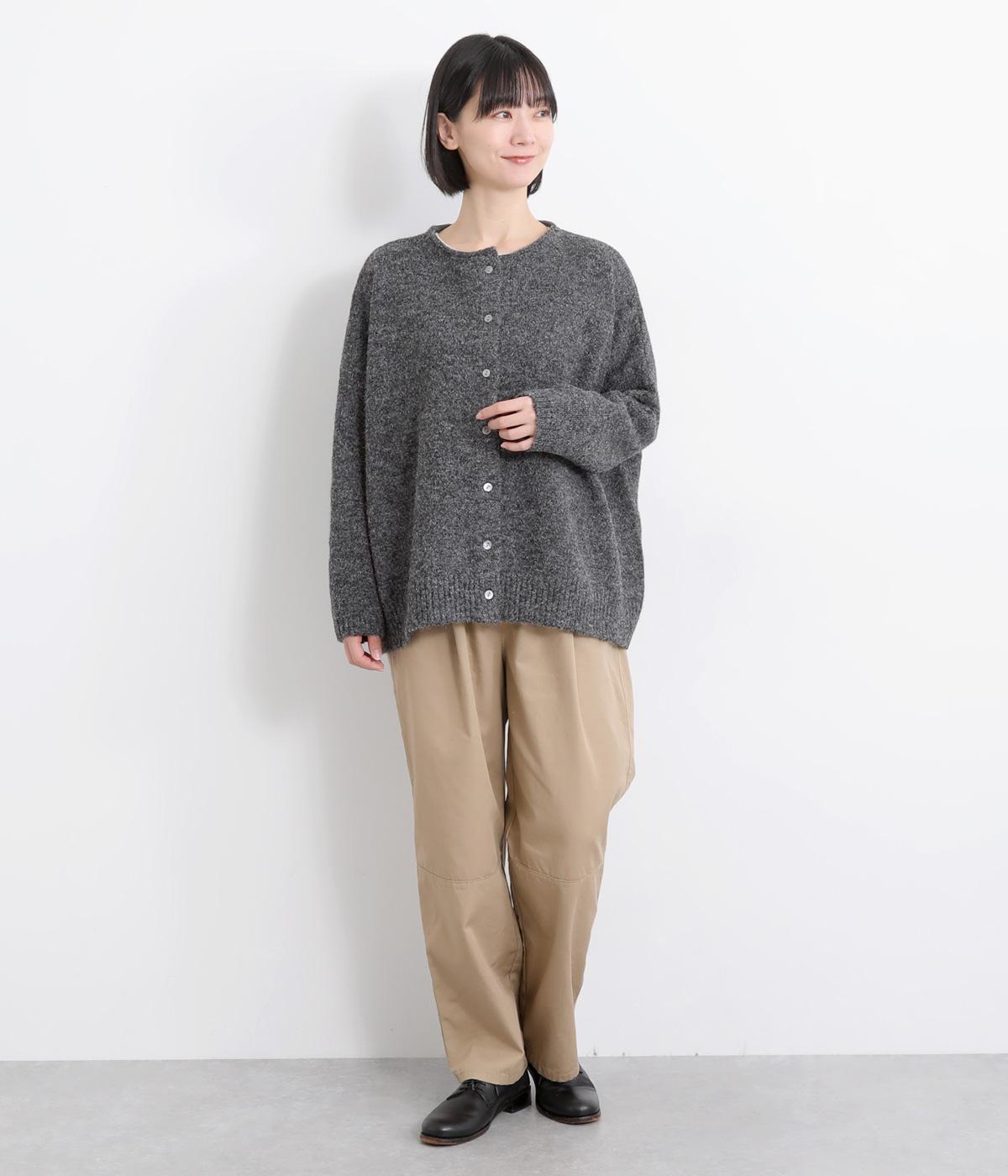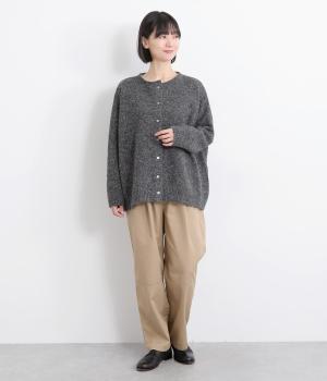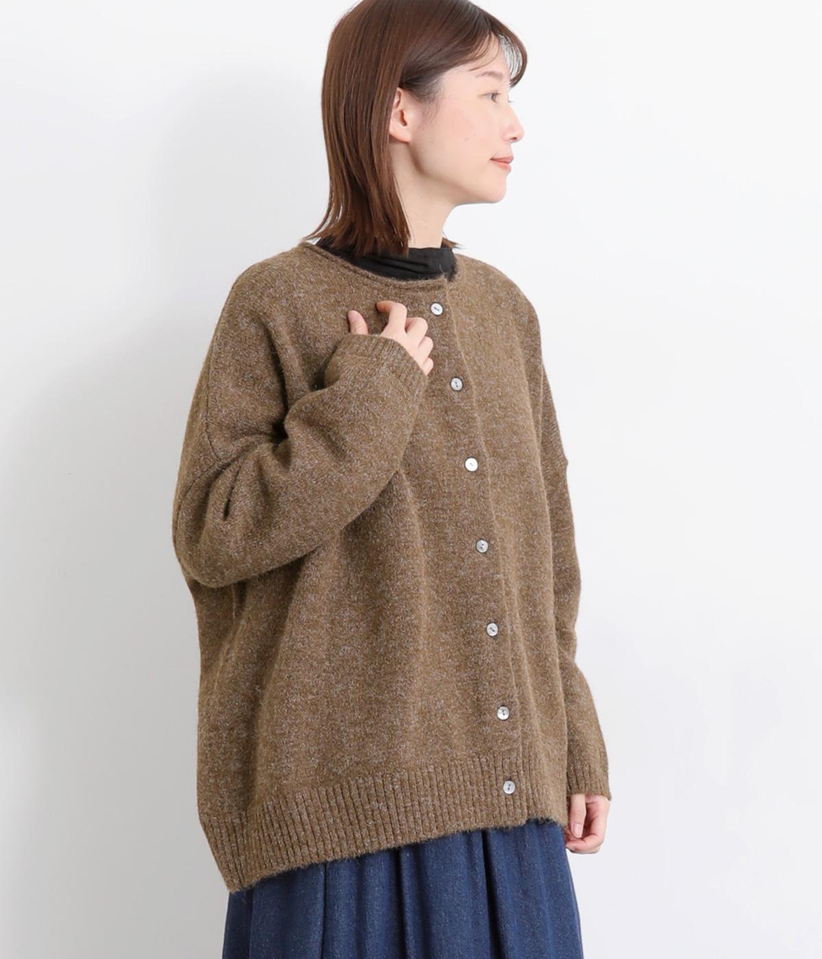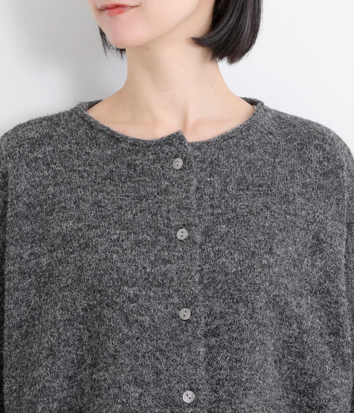 たっぷりと身幅をとったワイドシルエットのカーディガンです。襟元はくるんと丸まったロール仕様に仕立て、顔まわりにニュアンスをプラス。フロントに並ぶシェルボタンが、さりげなく品のよさを高めます。