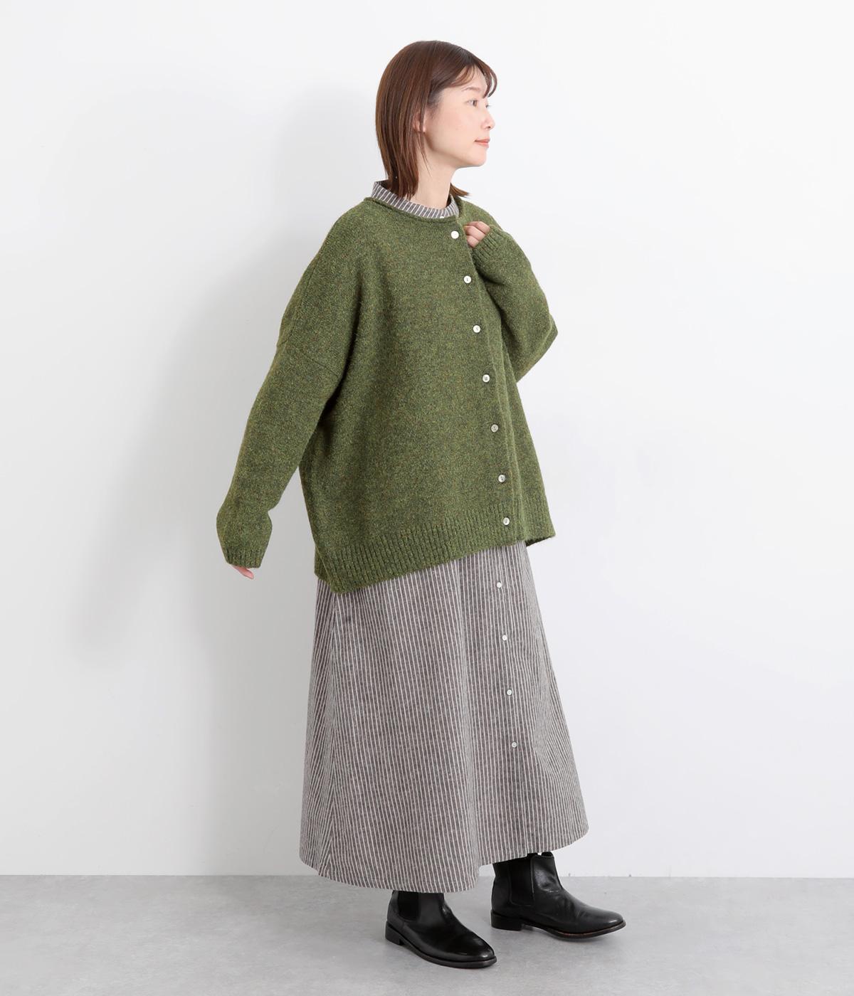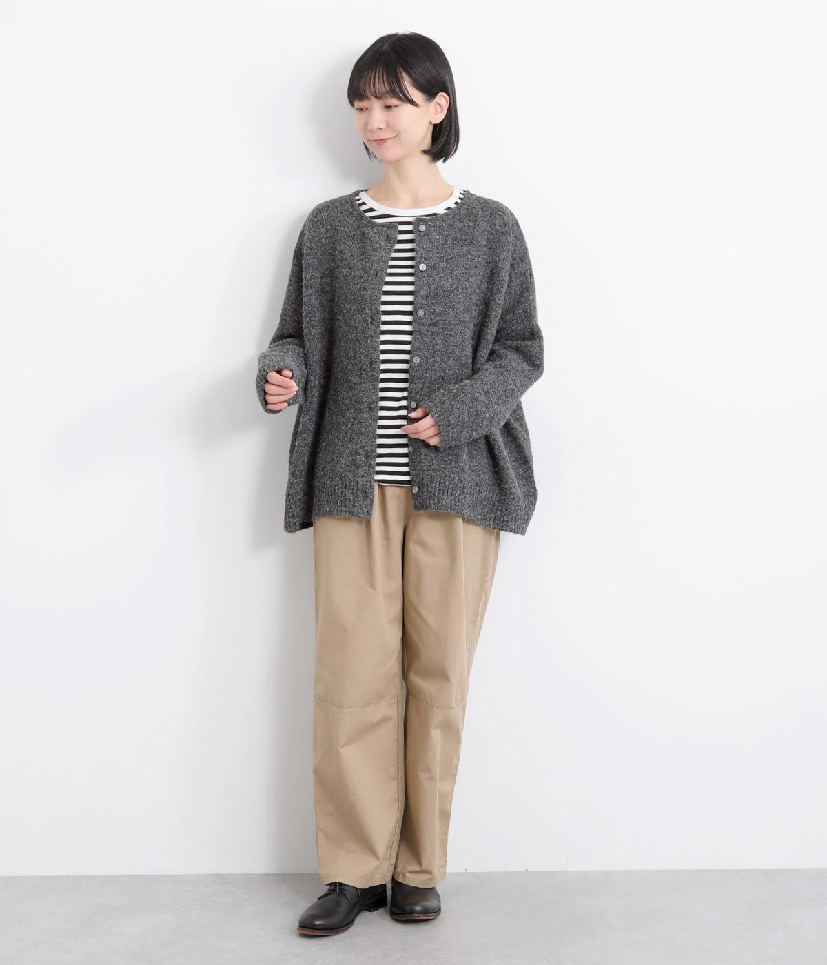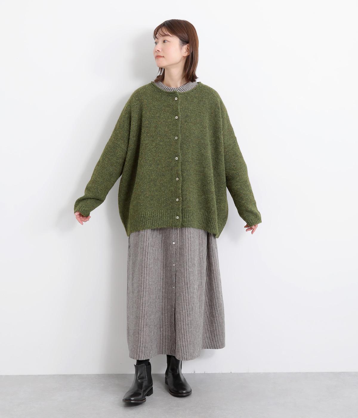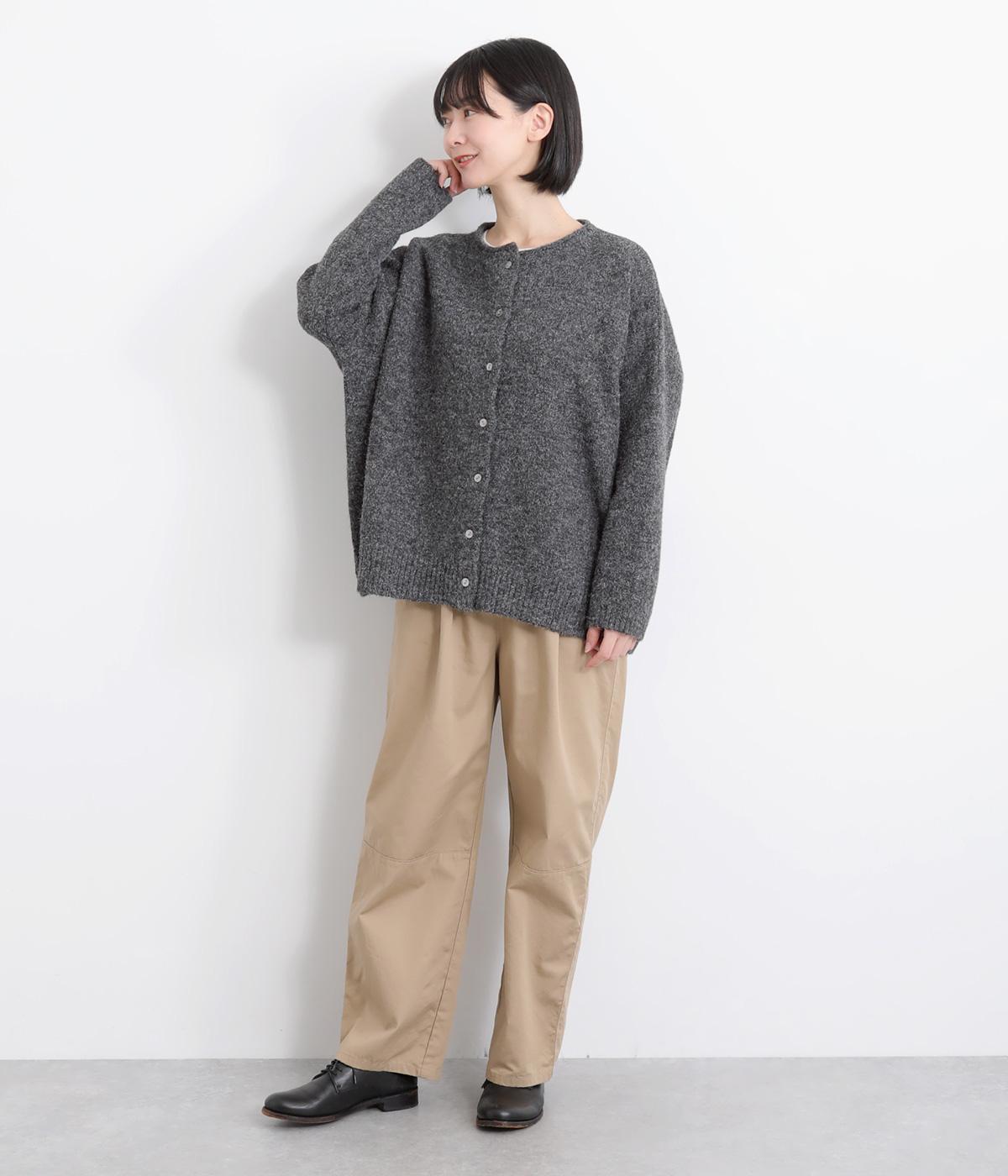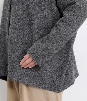 たっぷりと身幅をとったワイドシルエットのカーディガンです。襟元はくるんと丸まったロール仕様に仕立て、顔まわりにニュアンスをプラス。フロントに並ぶシェルボタンが、さりげなく品のよさを高めます。