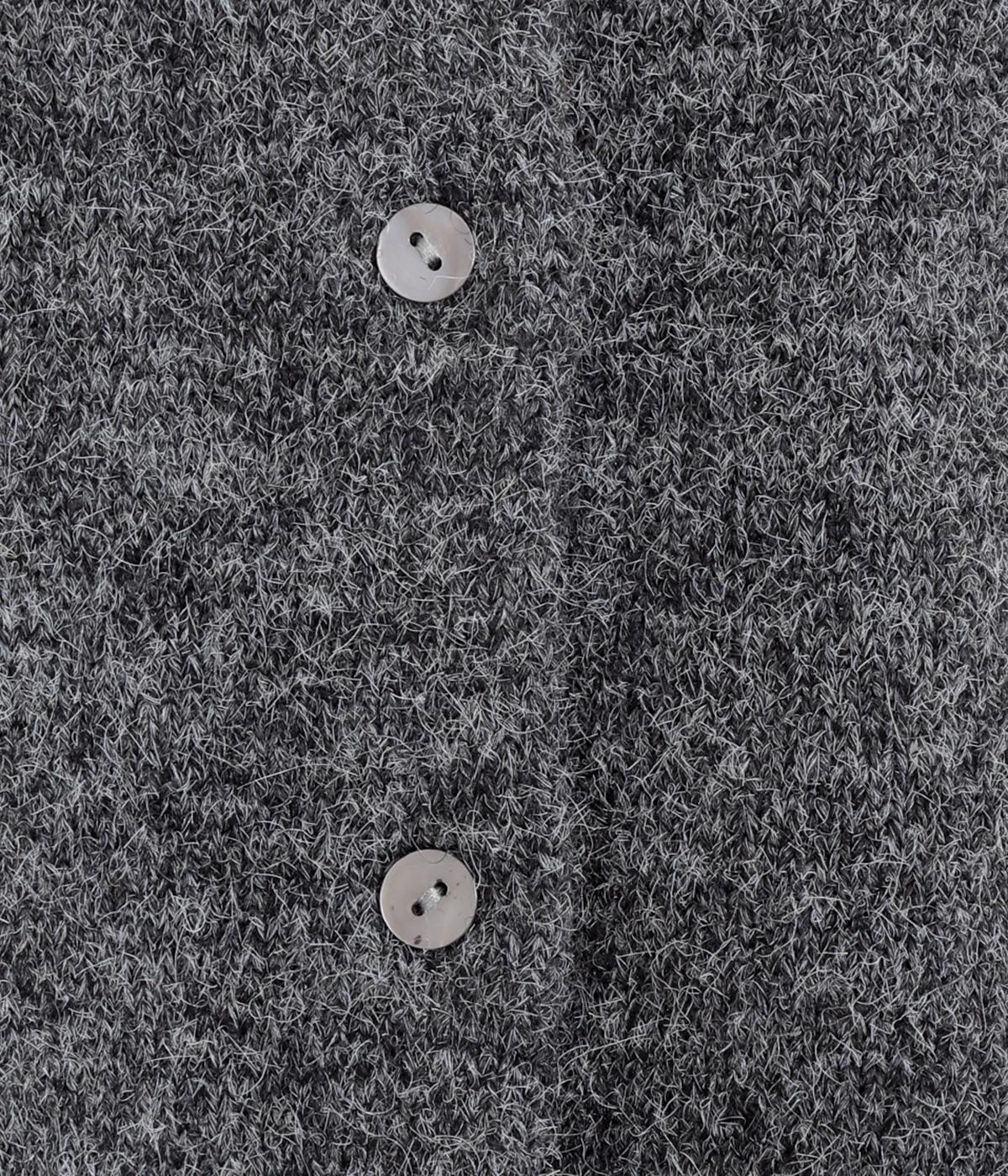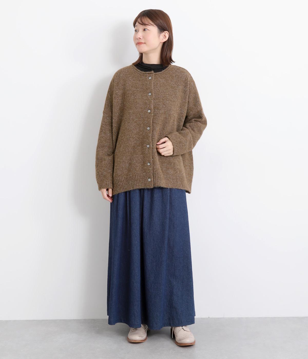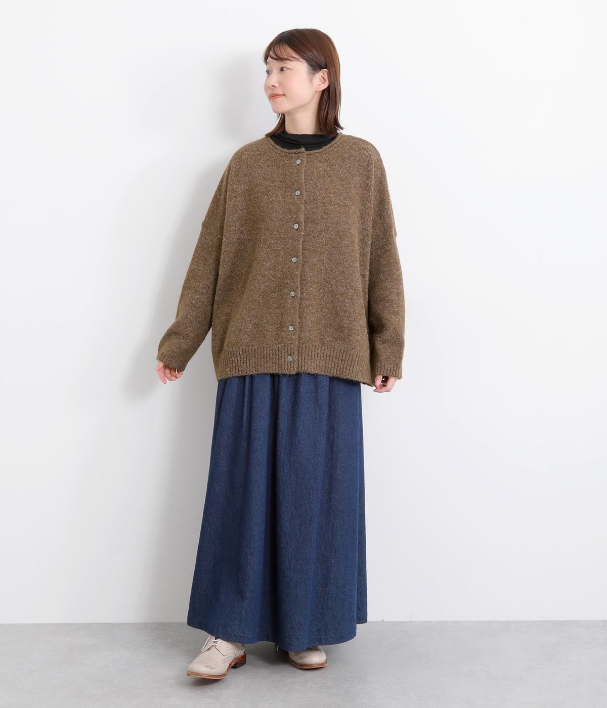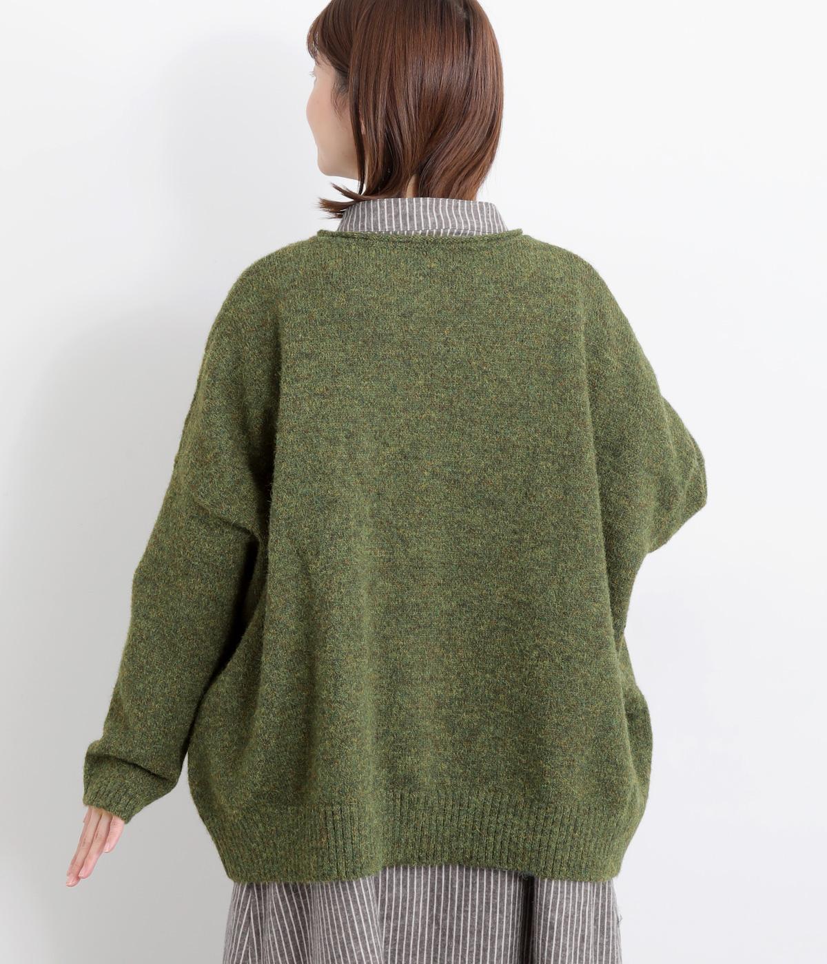 たっぷりと身幅をとったワイドシルエットのカーディガンです。襟元はくるんと丸まったロール仕様に仕立て、顔まわりにニュアンスをプラス。フロントに並ぶシェルボタンが、さりげなく品のよさを高めます。