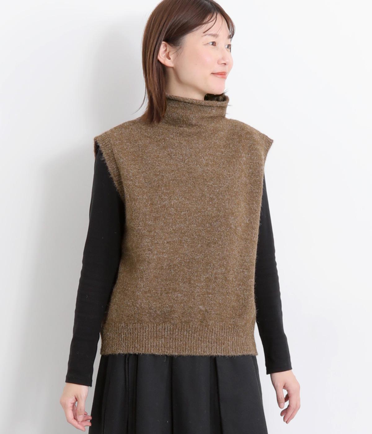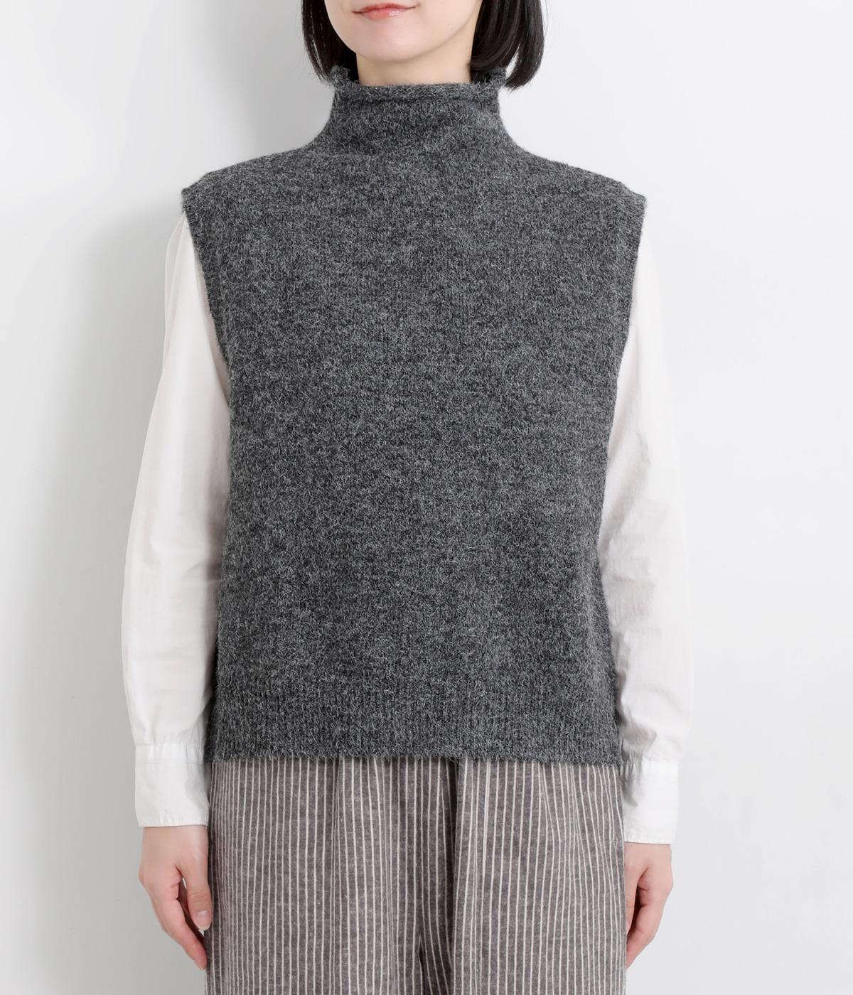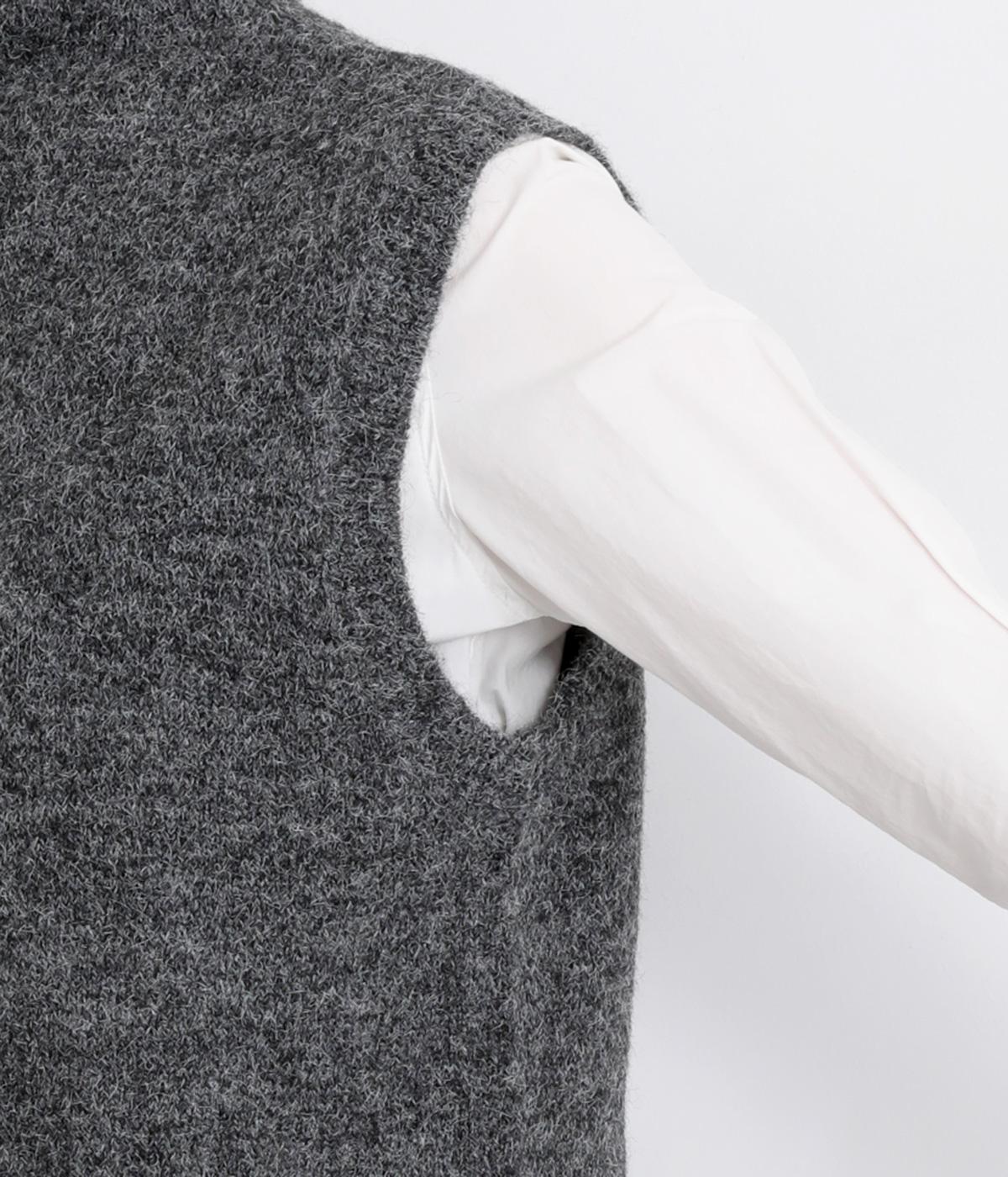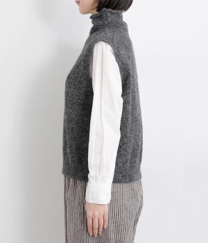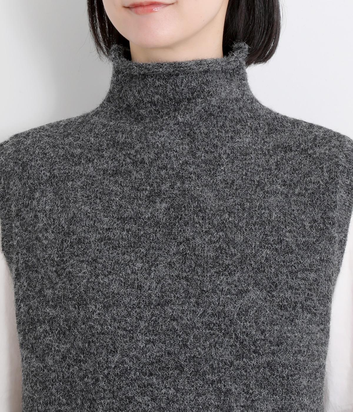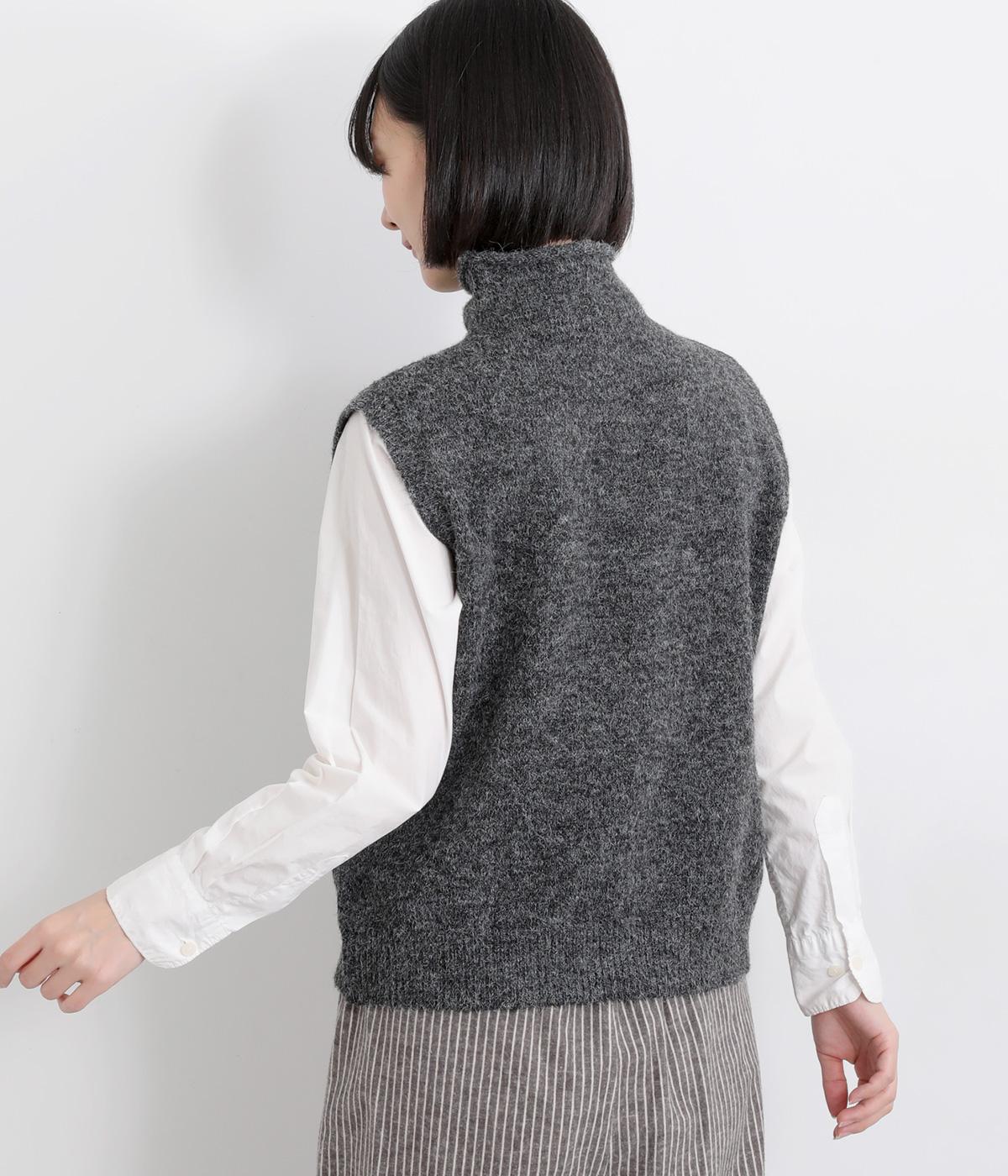 先端がくるんと丸まったスタンドネックが、顔まわりにやさしいニュアンスを添えるベストです。広めのアームホールは窮屈さを感じにくく、様々なレイヤードスタイルが楽しめるポイントに。