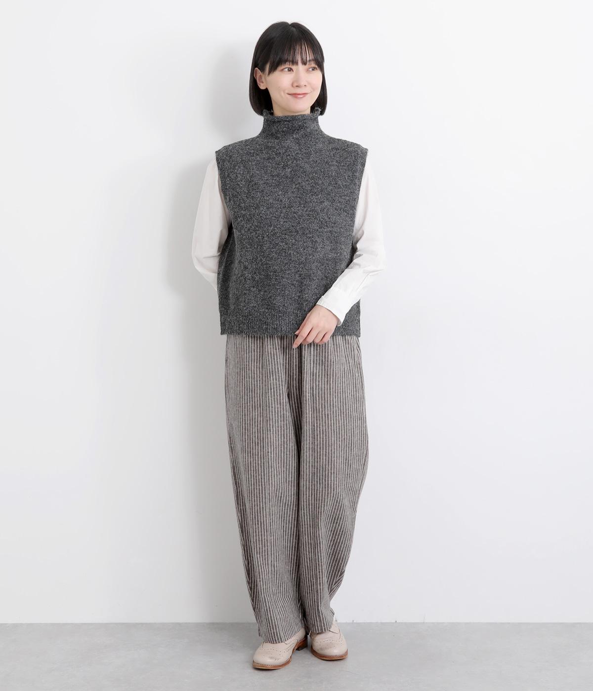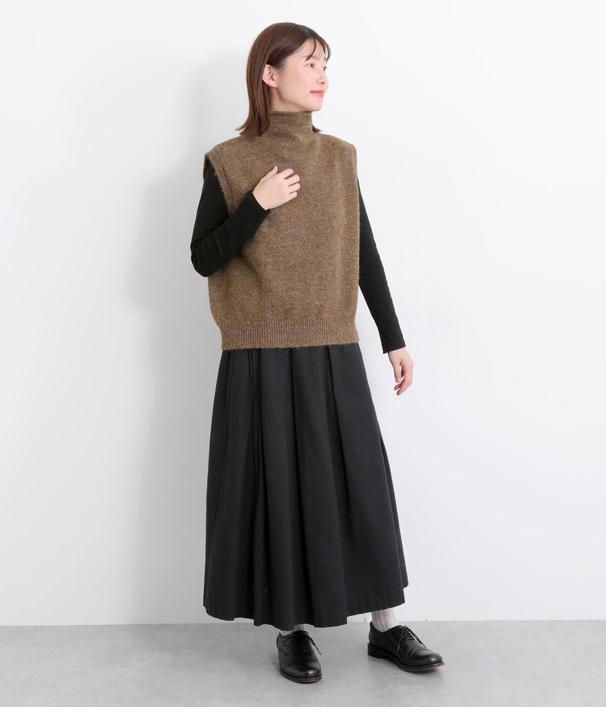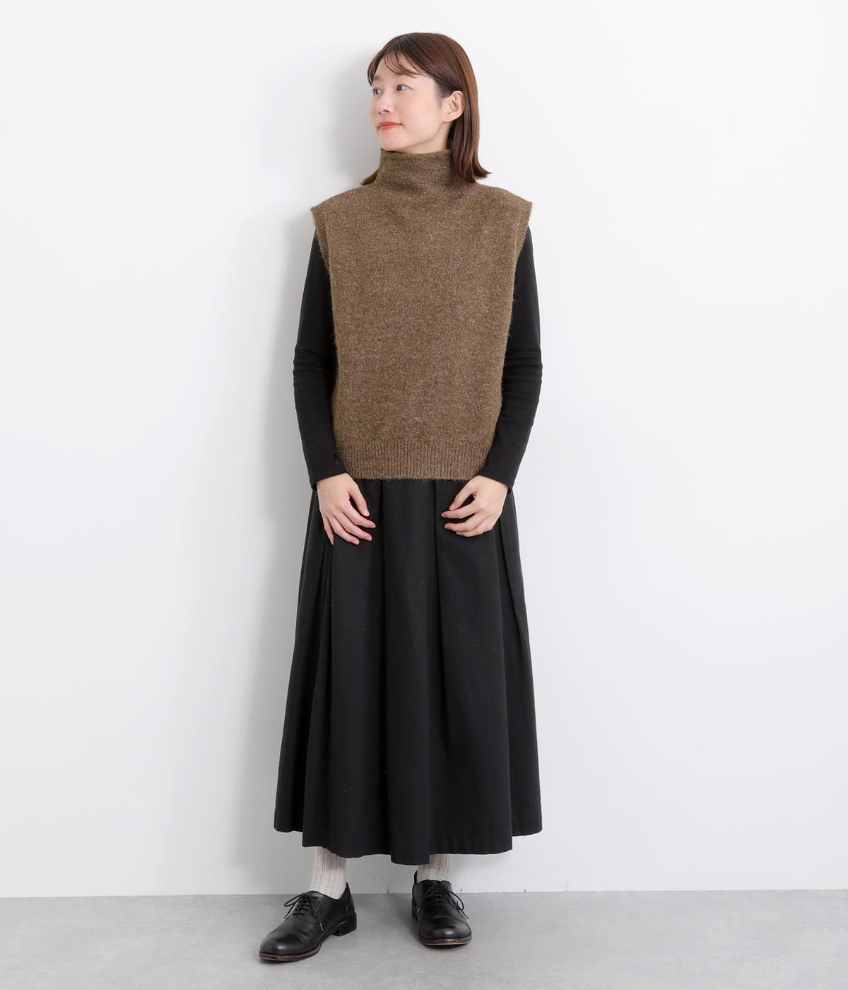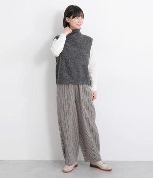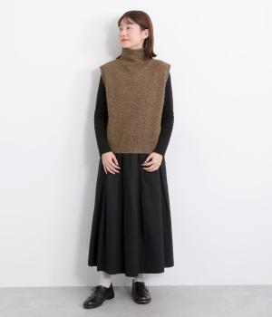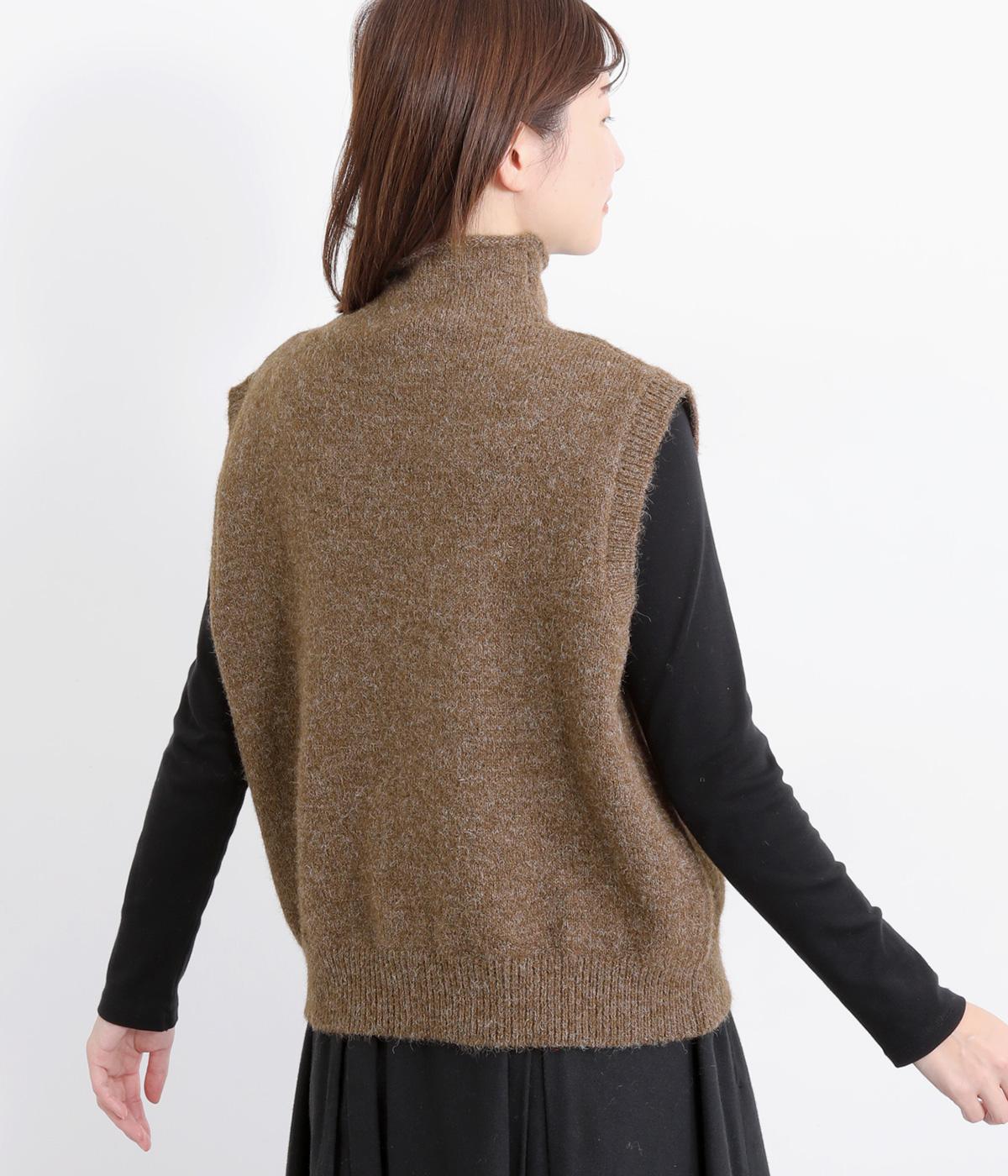 先端がくるんと丸まったスタンドネックが、顔まわりにやさしいニュアンスを添えるベストです。広めのアームホールは窮屈さを感じにくく、様々なレイヤードスタイルが楽しめるポイントに。