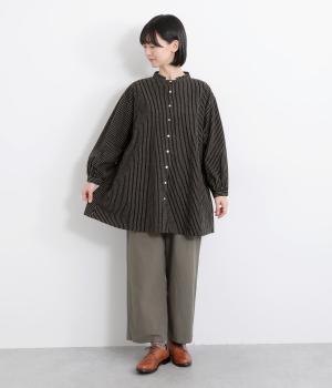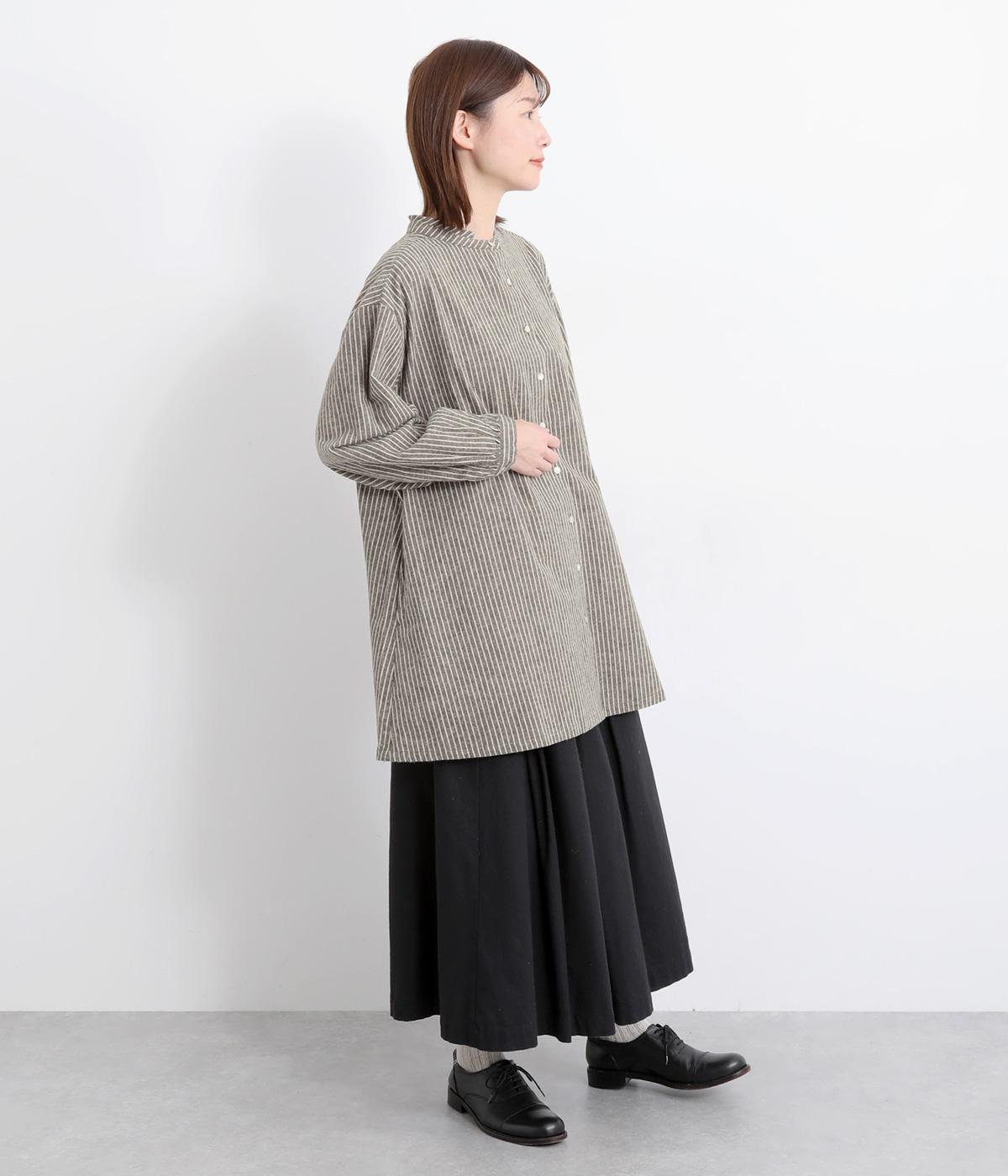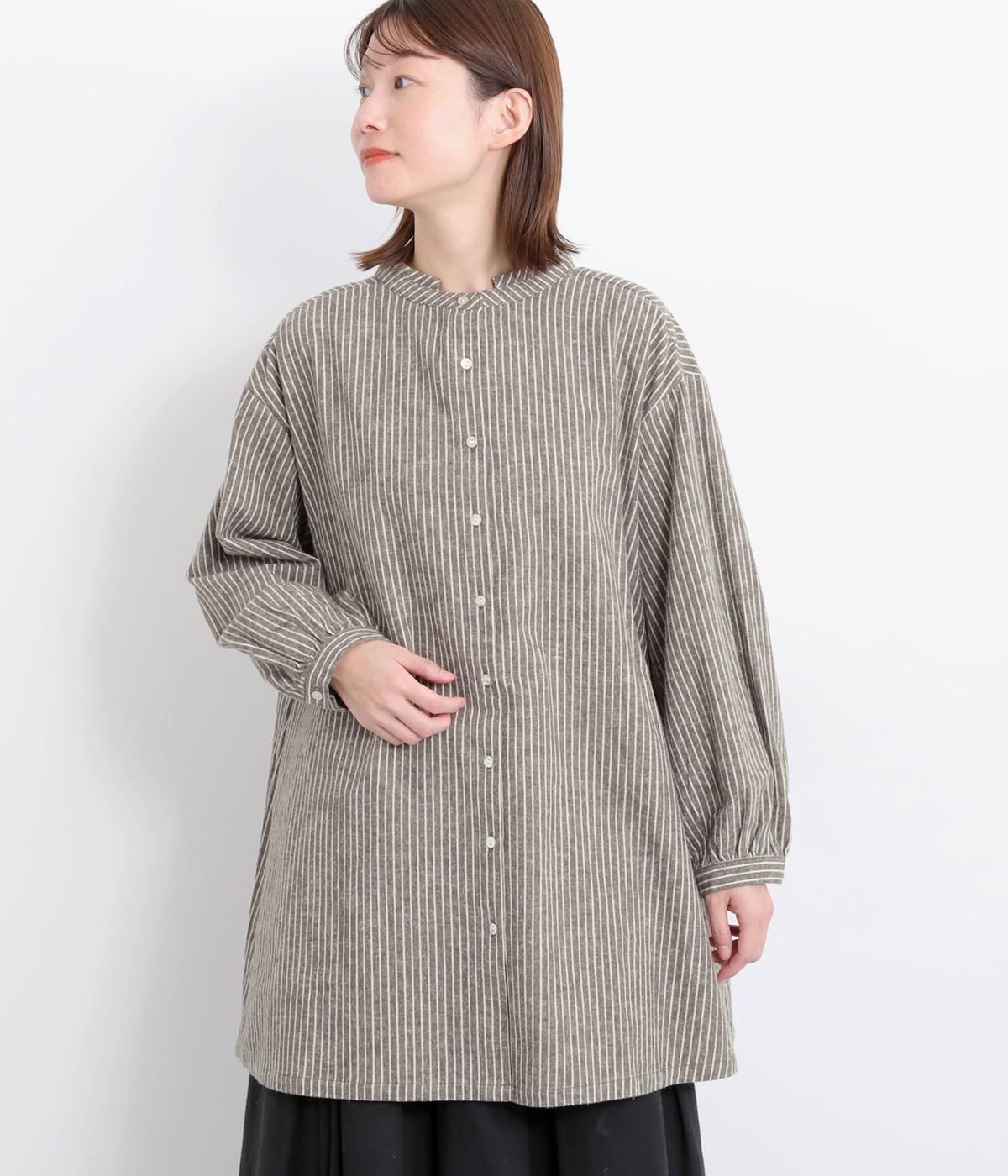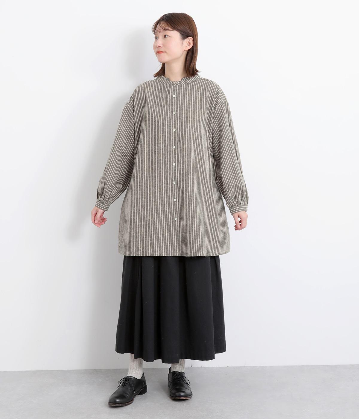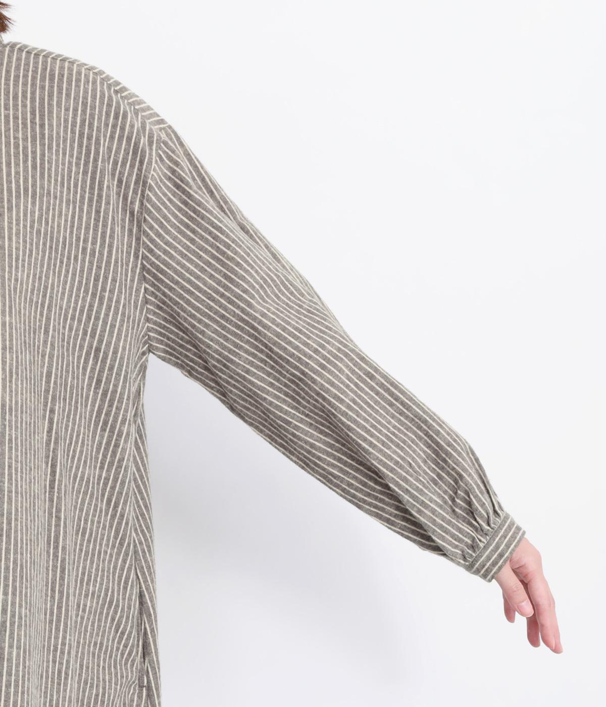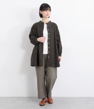 やわらかな綿麻生地の表面にほんのりと起毛をほどこして、秋冬ムードを高めました。落ち着いた色合いのストライプ柄がきちんと感も演出します。