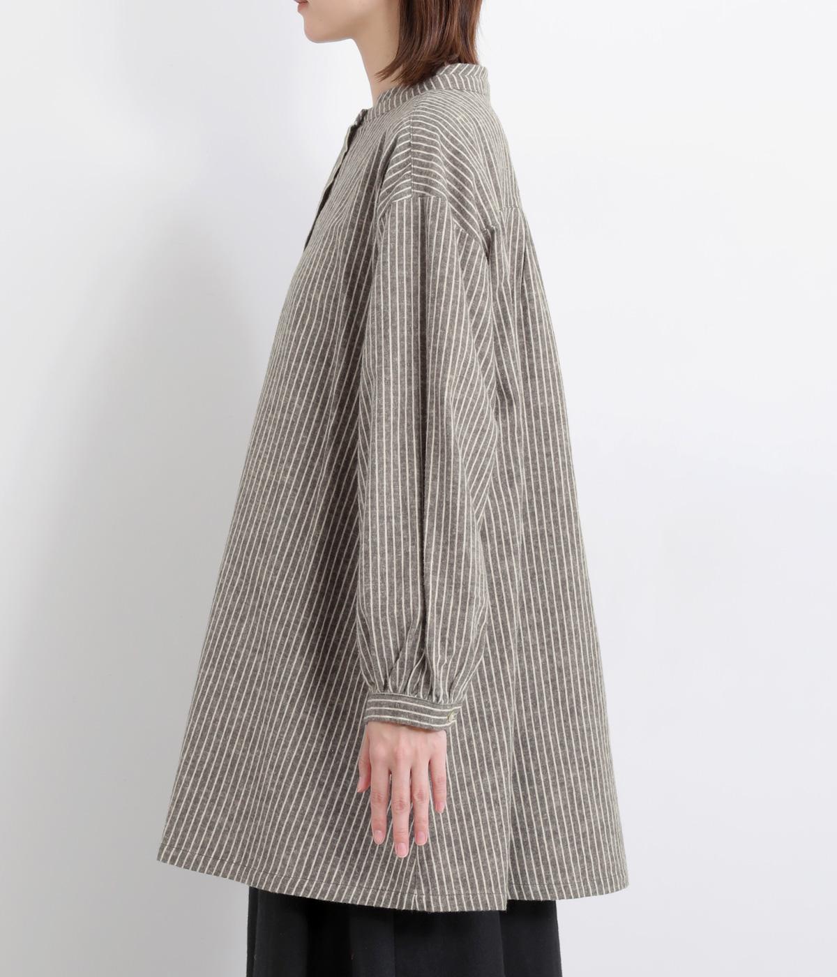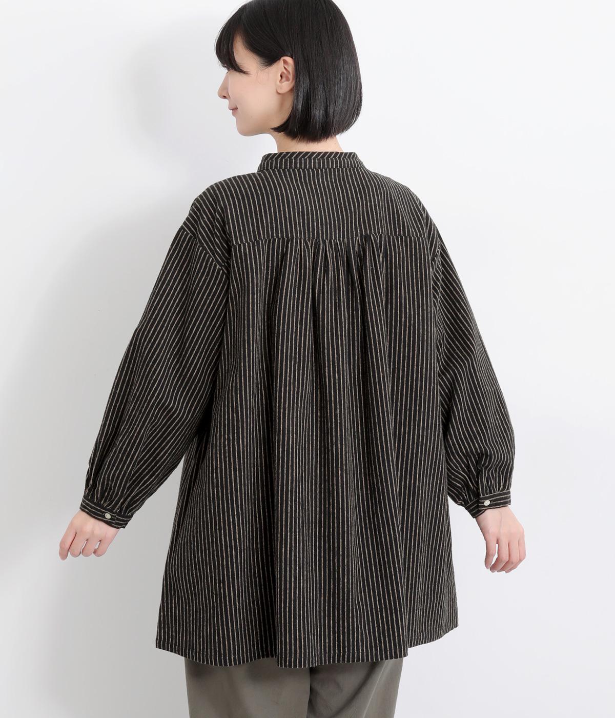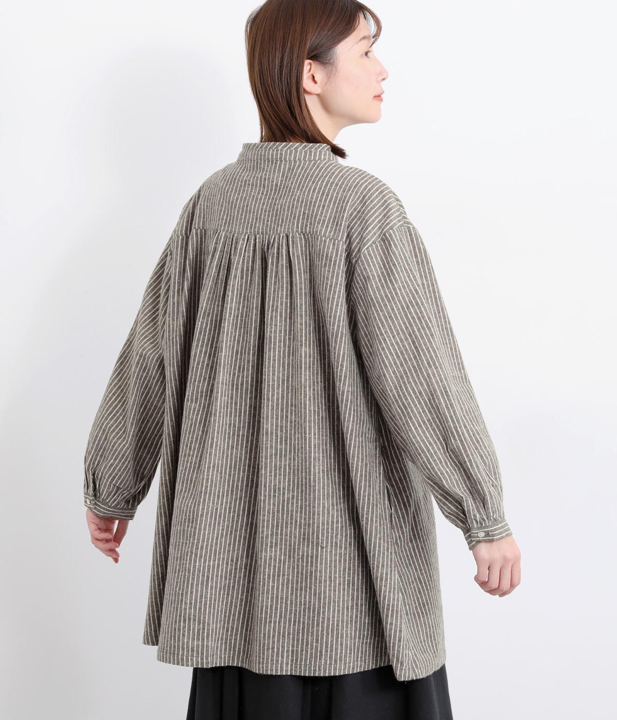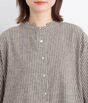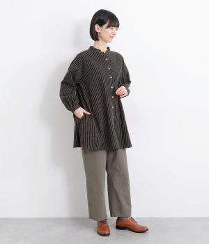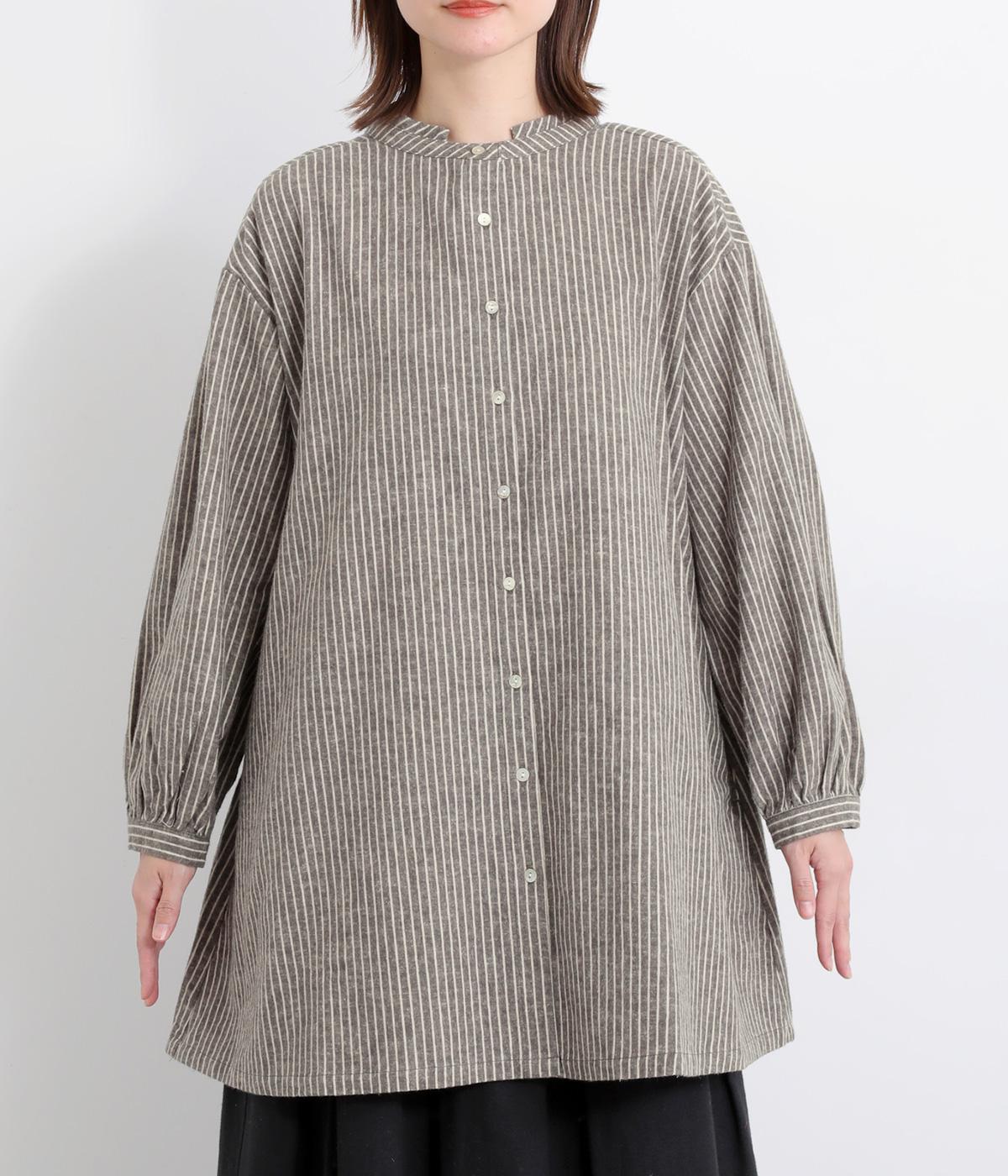 やわらかな綿麻生地の表面にほんのりと起毛をほどこして、秋冬ムードを高めました。落ち着いた色合いのストライプ柄がきちんと感も演出します。