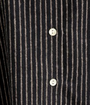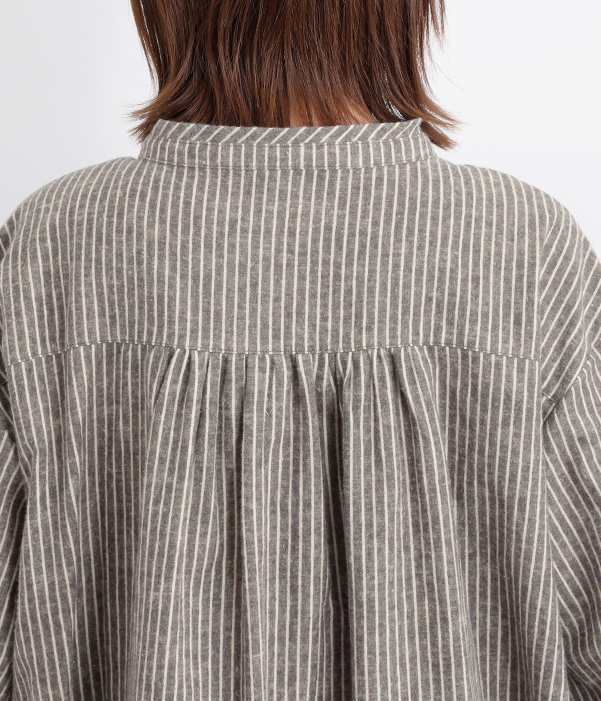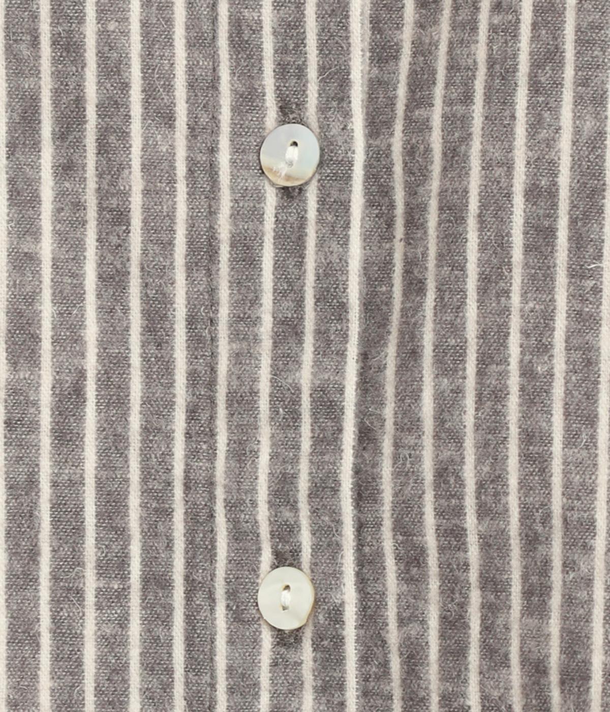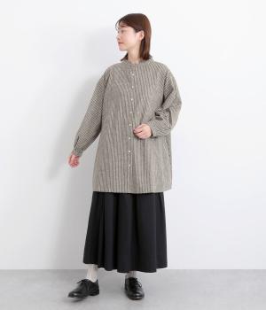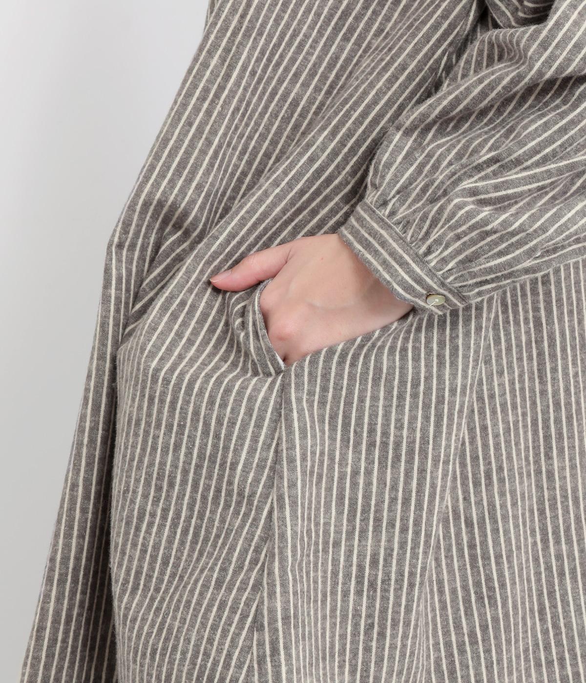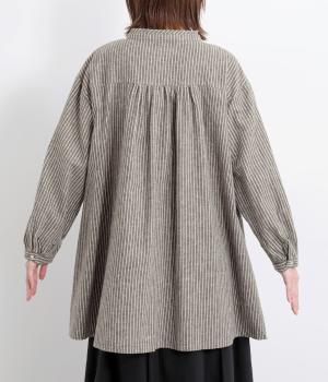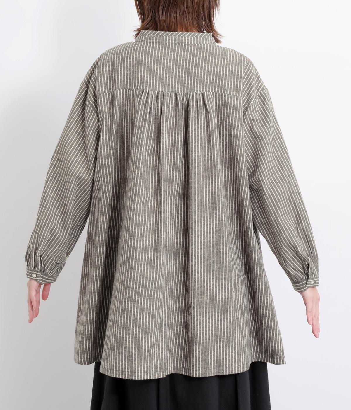 やわらかな綿麻生地の表面にほんのりと起毛をほどこして、秋冬ムードを高めました。落ち着いた色合いのストライプ柄がきちんと感も演出します。
