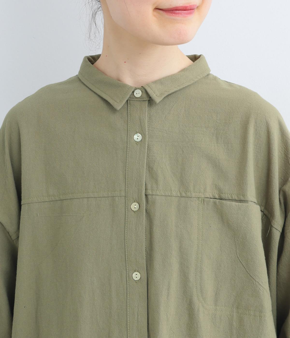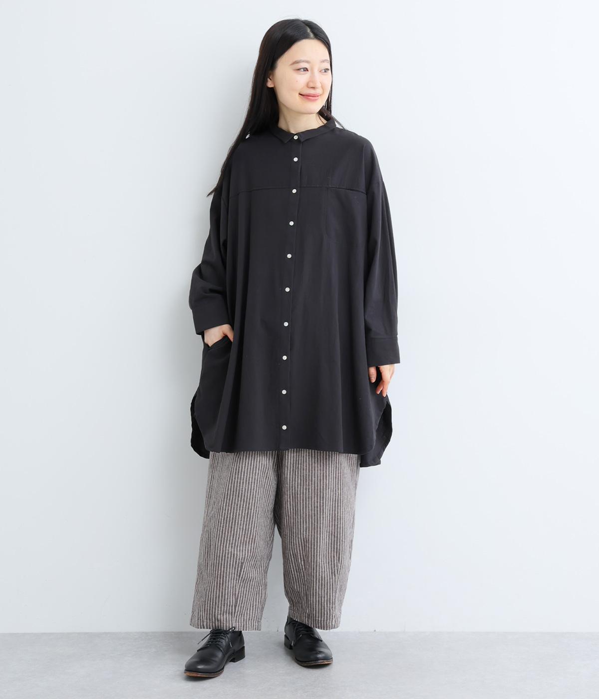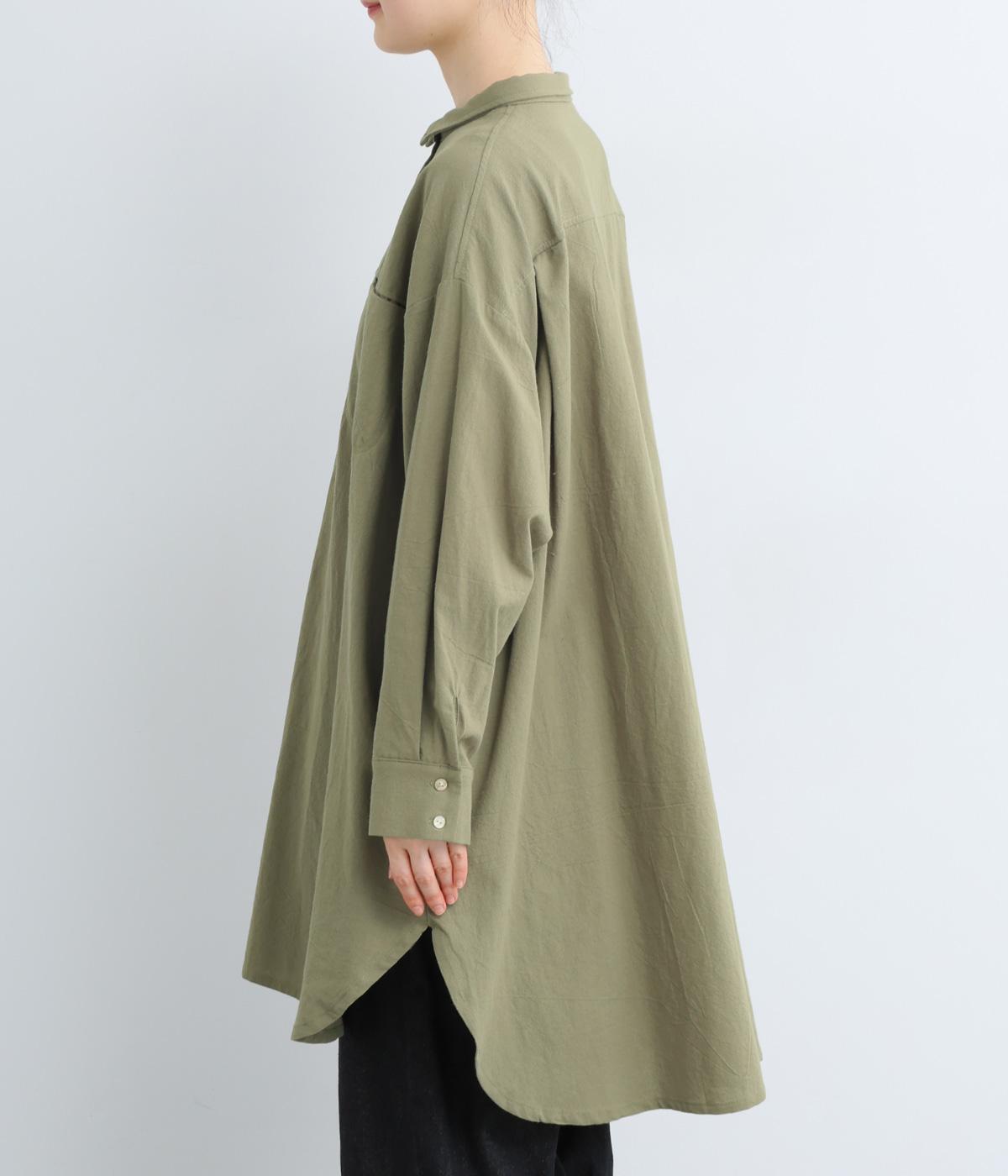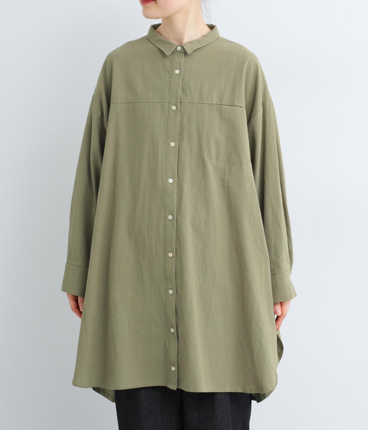 生地の持つナチュラルな風合いを活かしてシンプルに仕立てたシャツチュニック。ゆとりのある身幅にラウンドしたヘムラインで、着用すると自然な動きが生まれます。光沢感のあるシェルボタンを採用してさり気なくコントラストを。