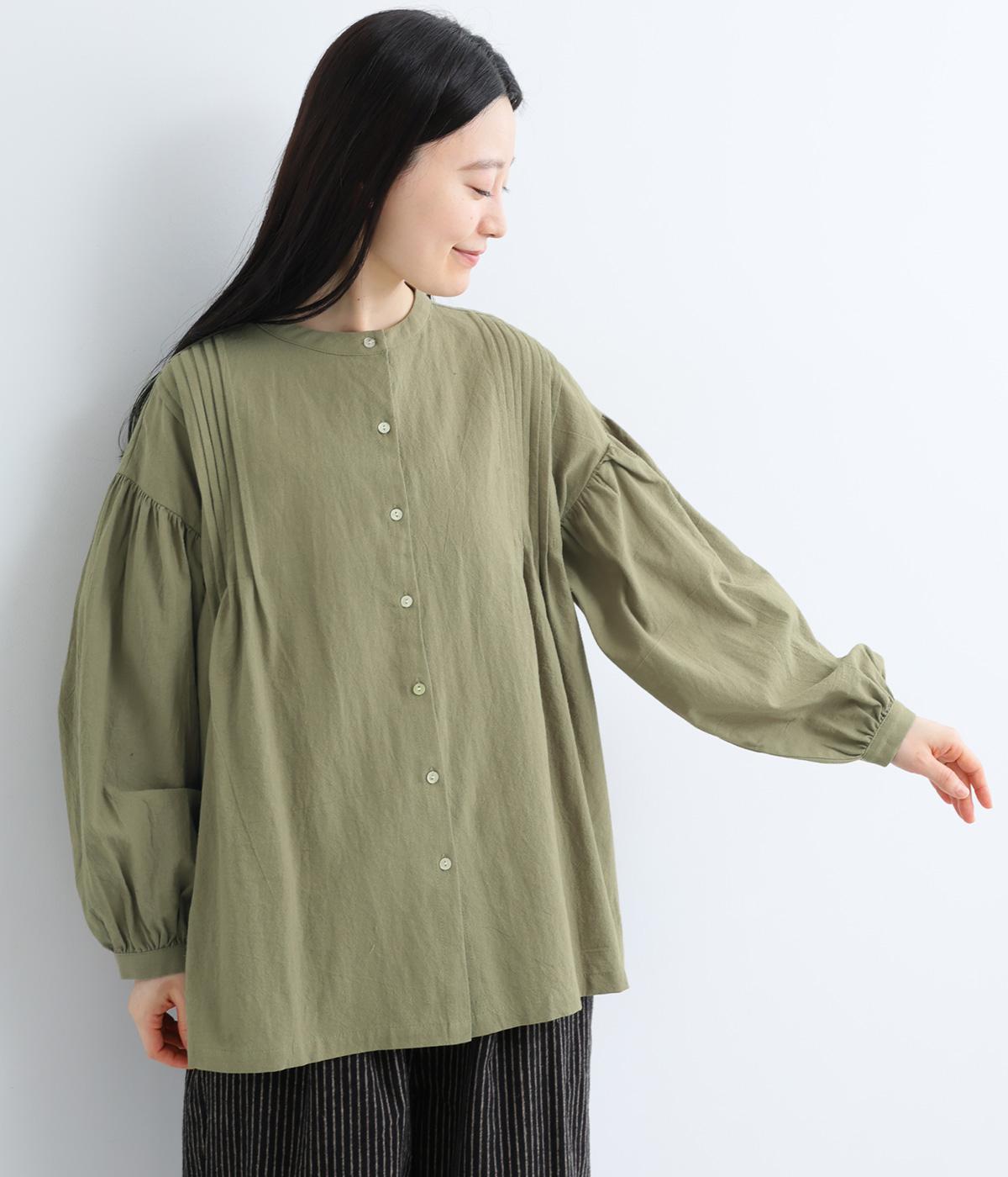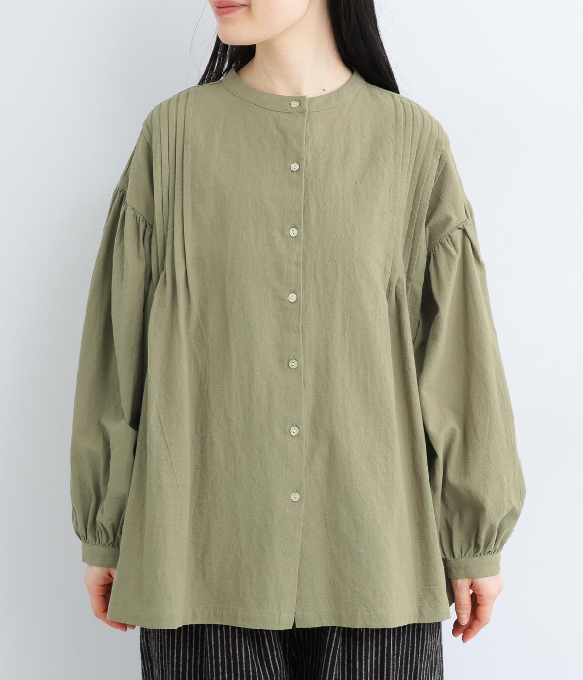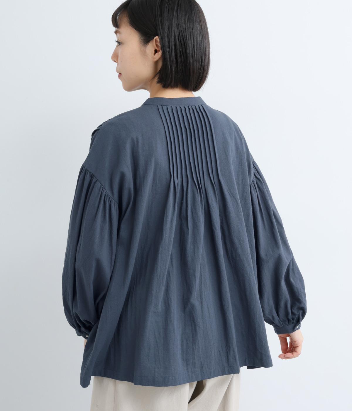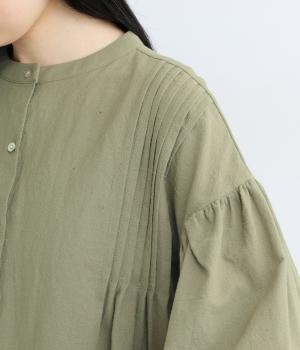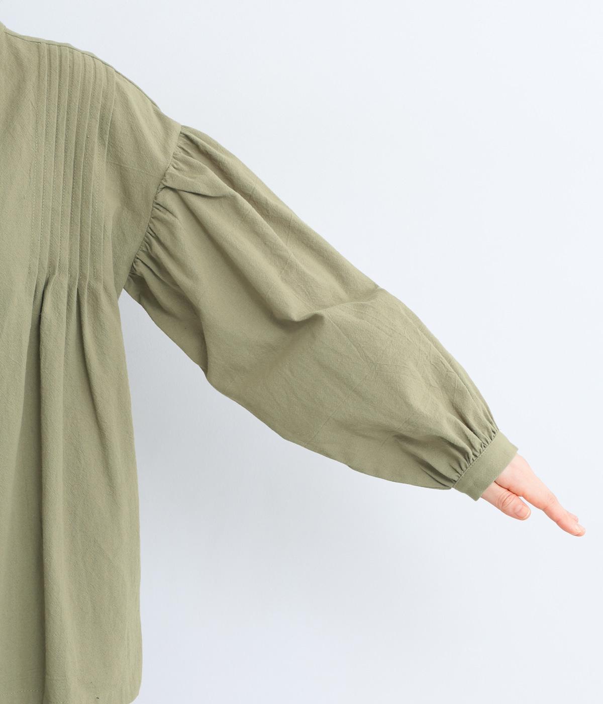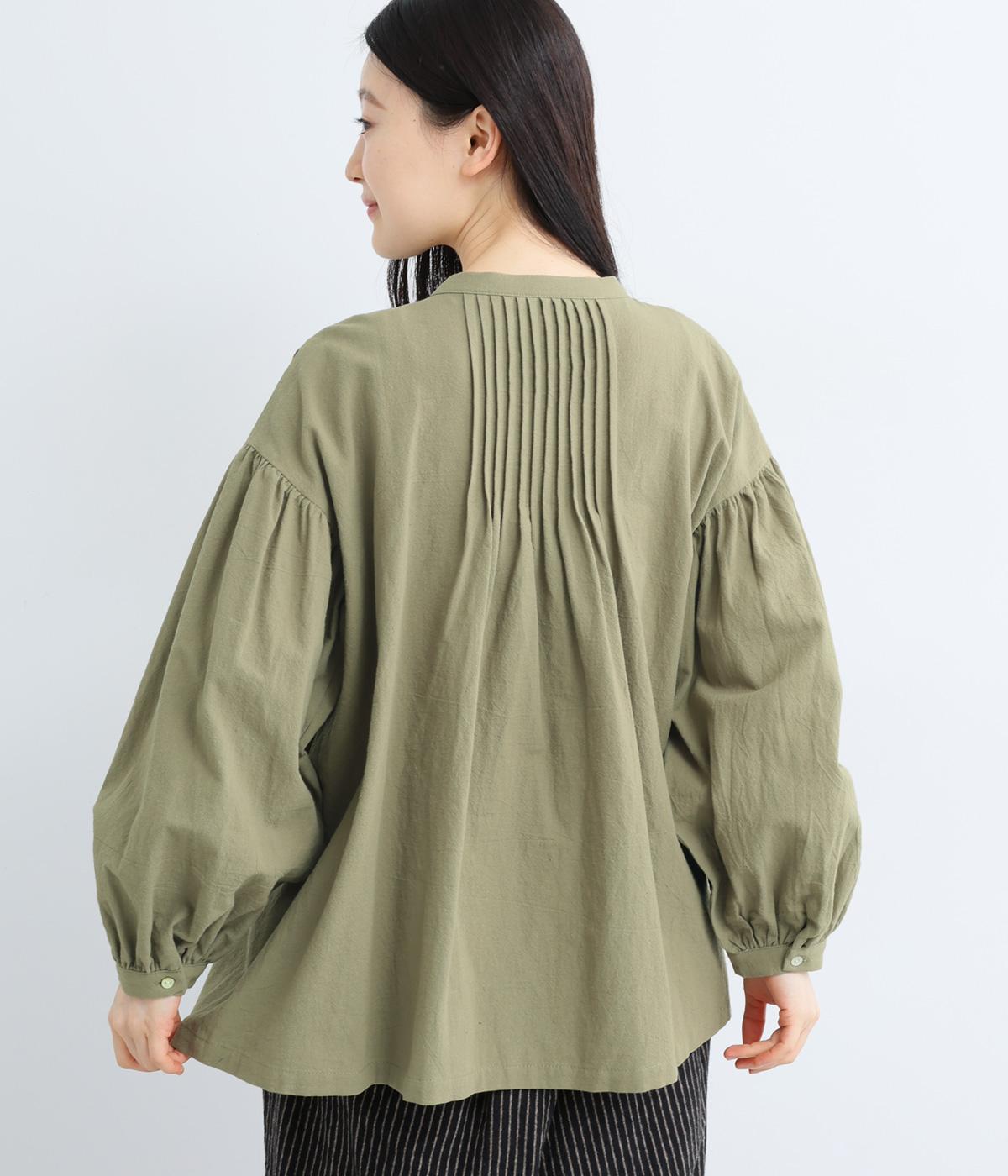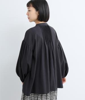 ピンタックとたっぷりギャザーを寄せたボリューム袖で着映え力を高めた一枚。甘めのディテールもナチュラル素材で適度にカジュアルダウンし、デイリーに着こなしやすく仕上がっています。前あきの羽織り使いもおすすめです。