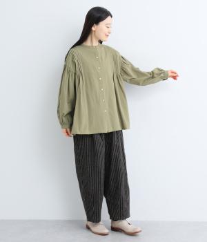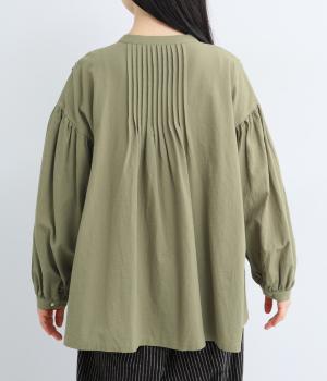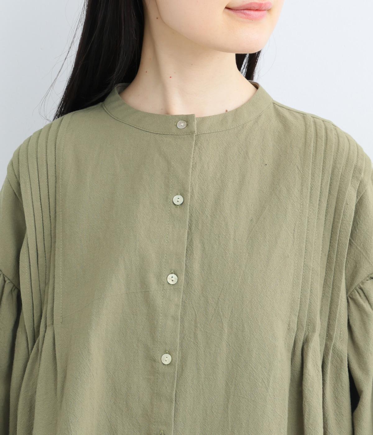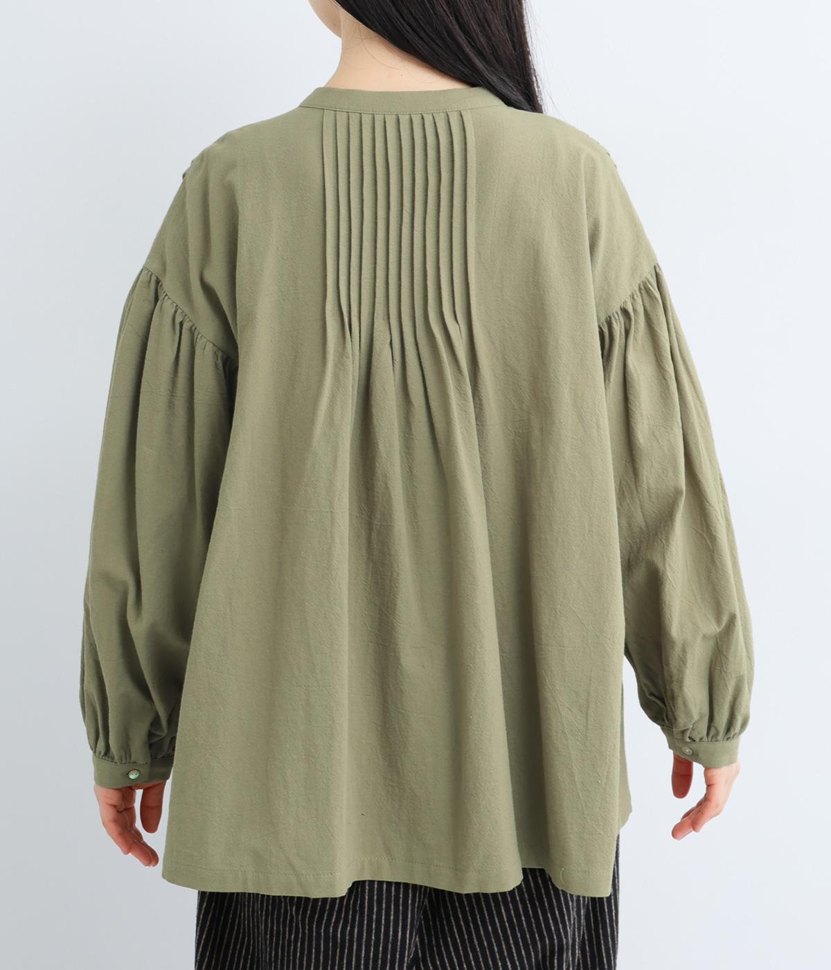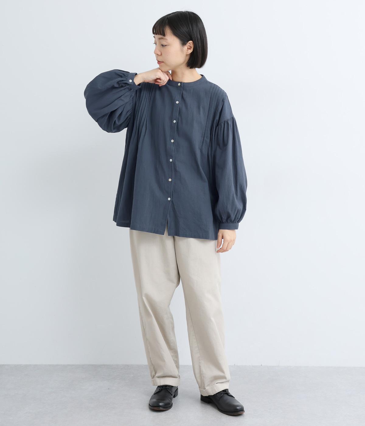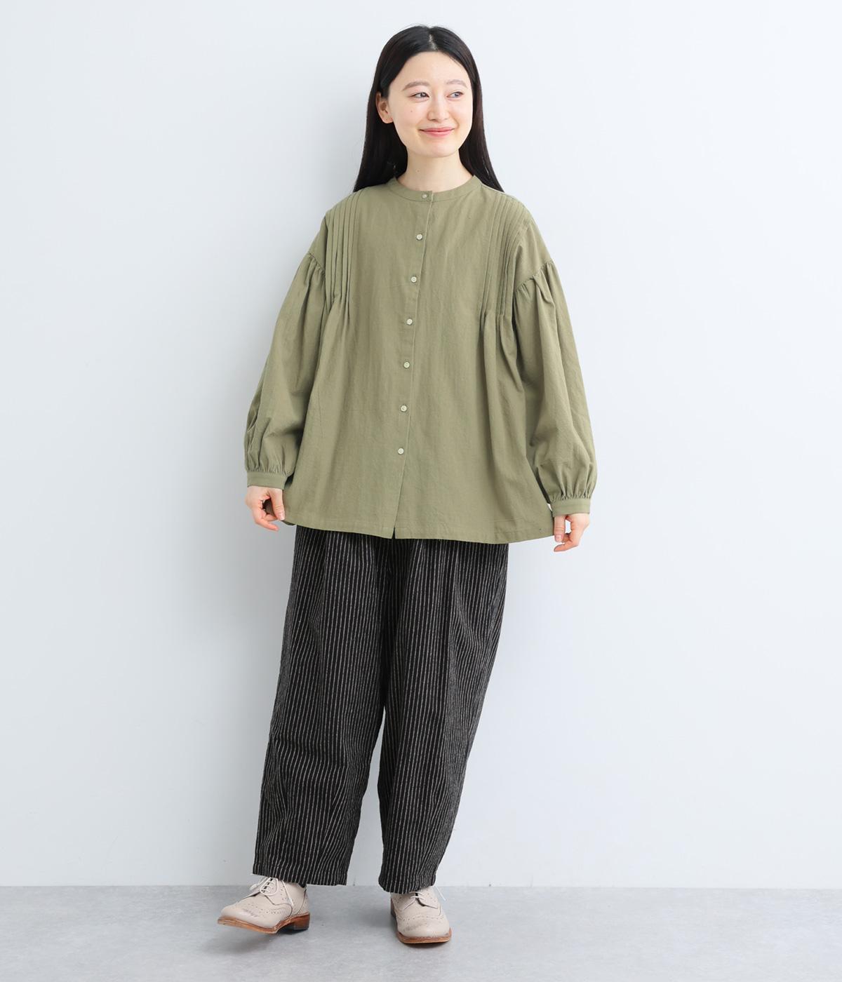 ピンタックとたっぷりギャザーを寄せたボリューム袖で着映え力を高めた一枚。甘めのディテールもナチュラル素材で適度にカジュアルダウンし、デイリーに着こなしやすく仕上がっています。前あきの羽織り使いもおすすめです。