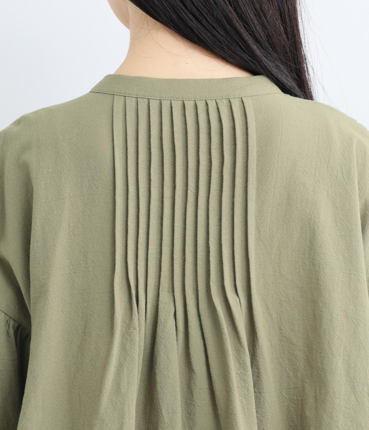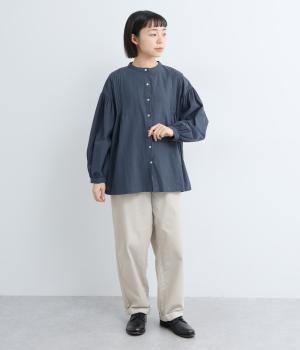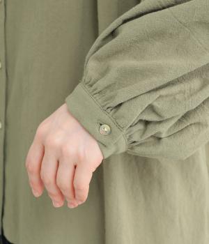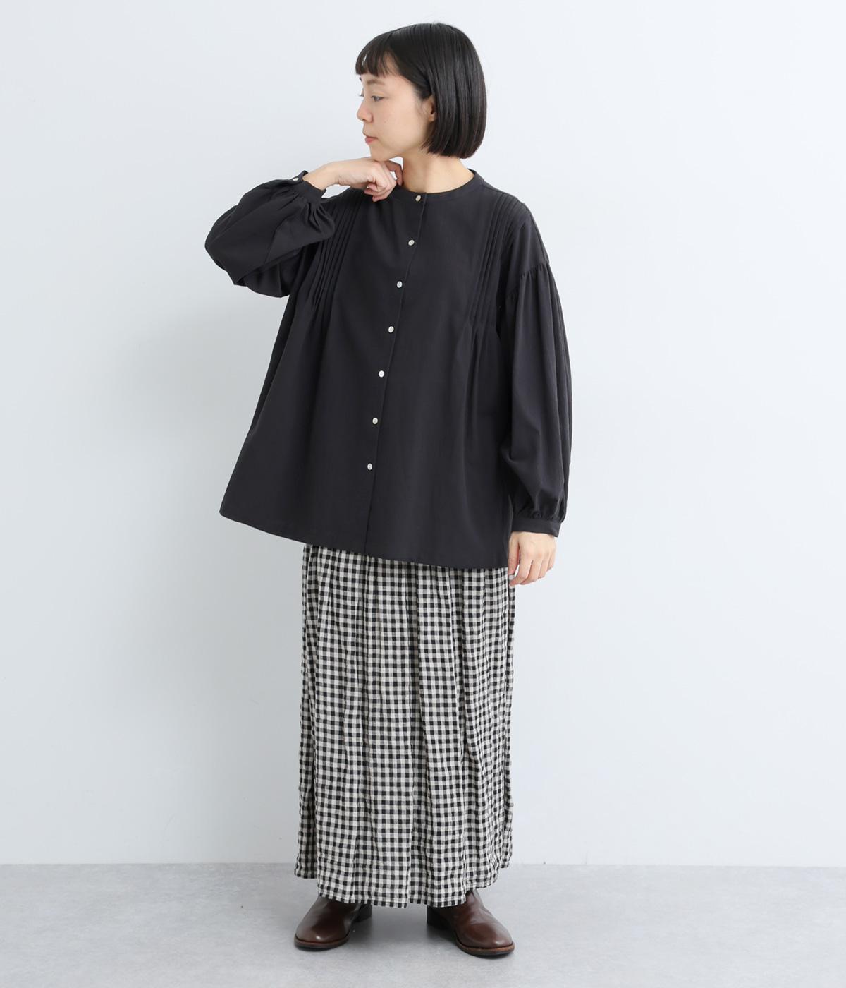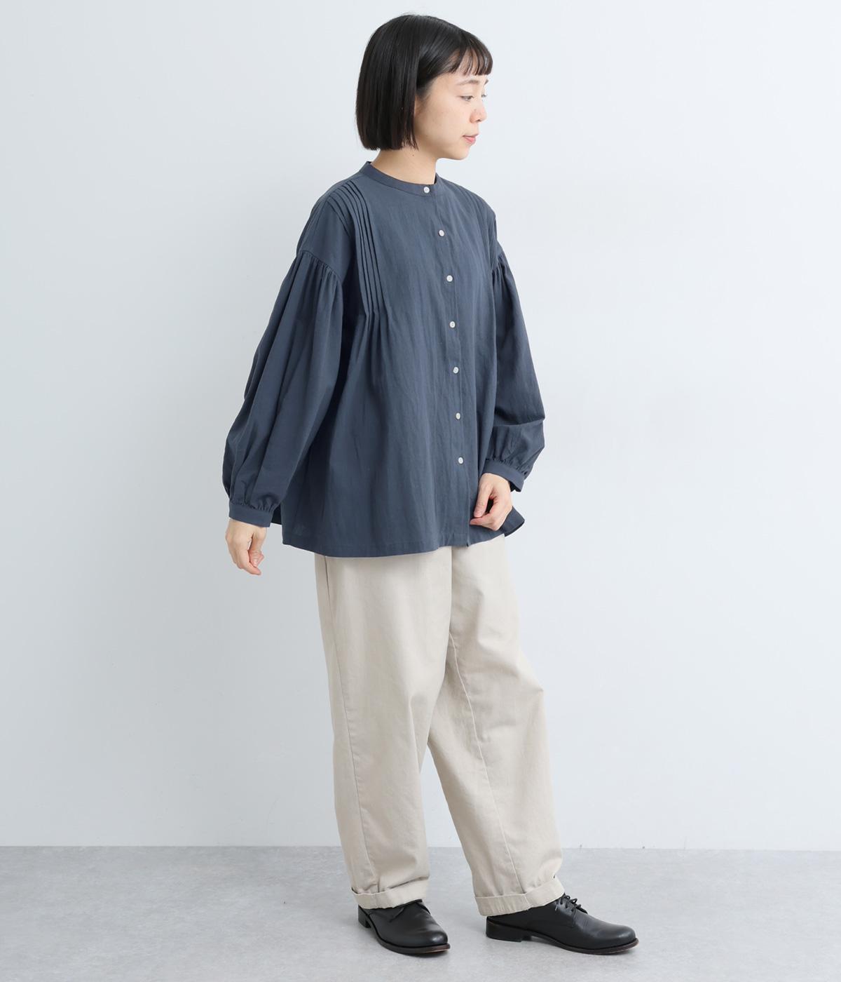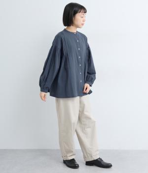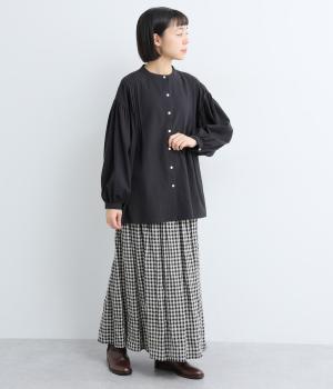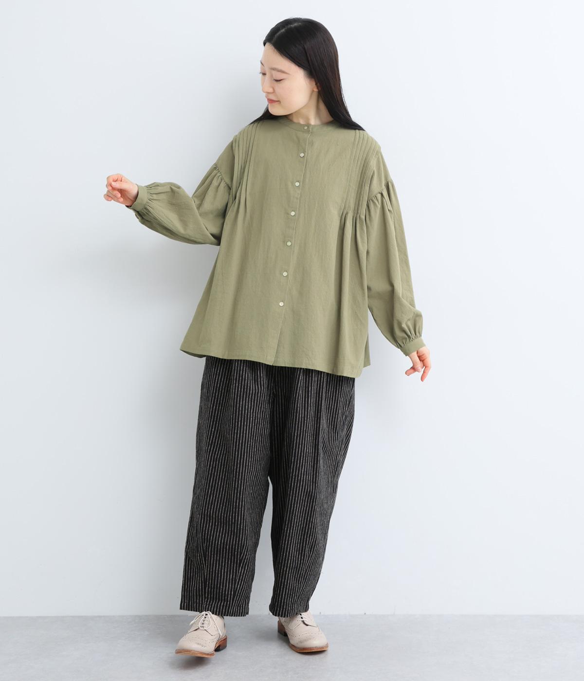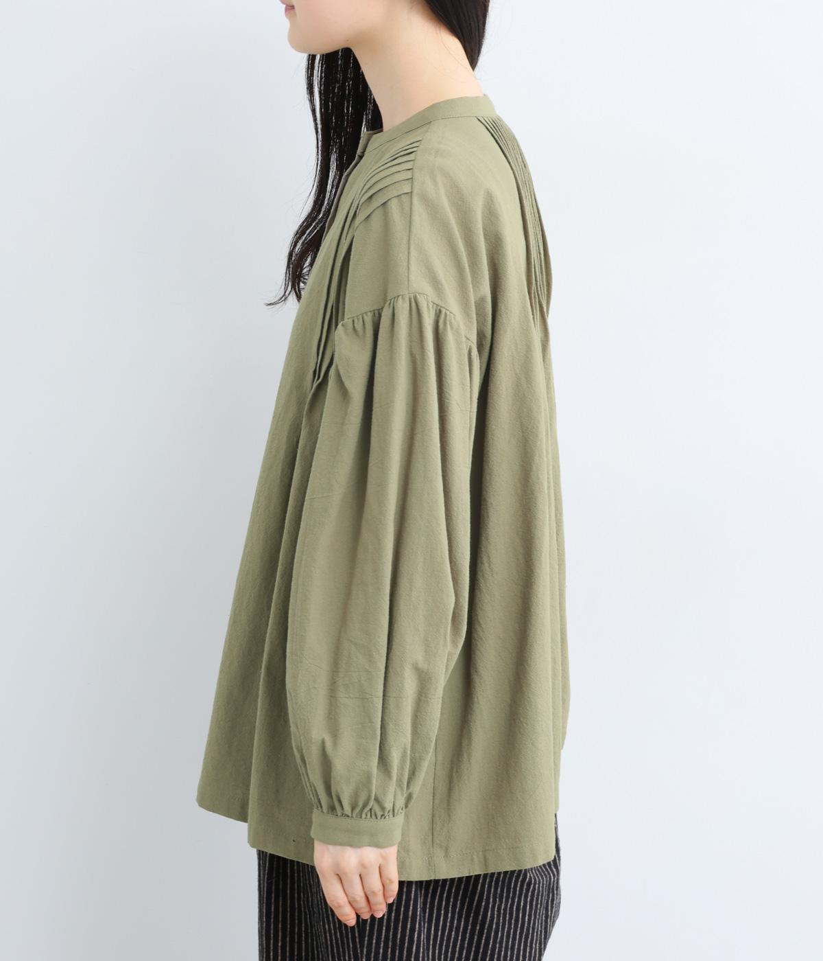 ピンタックとたっぷりギャザーを寄せたボリューム袖で着映え力を高めた一枚。甘めのディテールもナチュラル素材で適度にカジュアルダウンし、デイリーに着こなしやすく仕上がっています。前あきの羽織り使いもおすすめです。