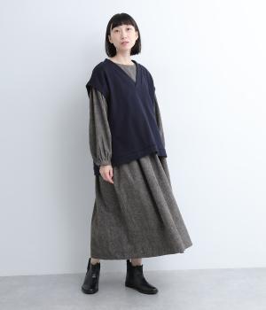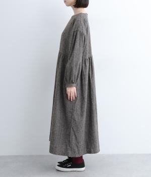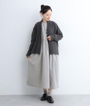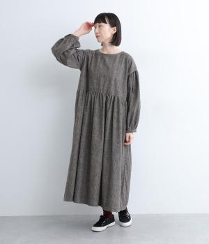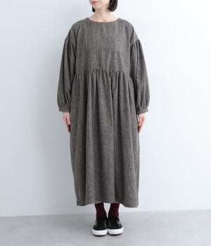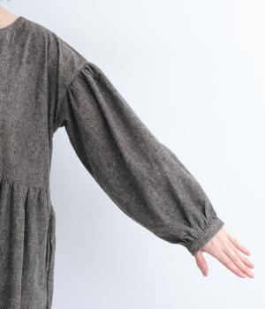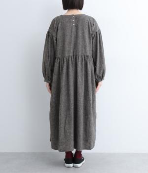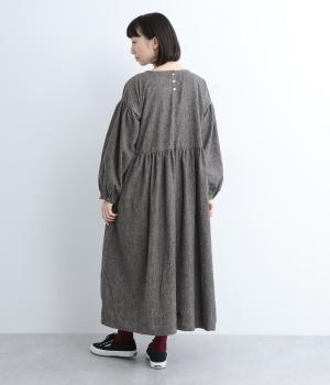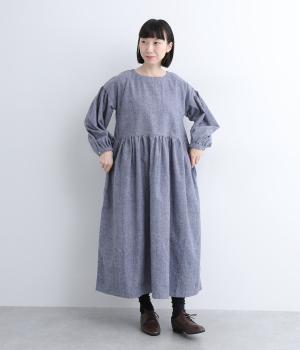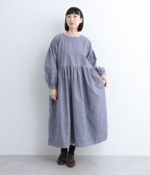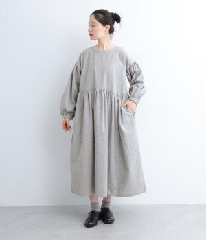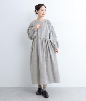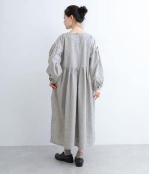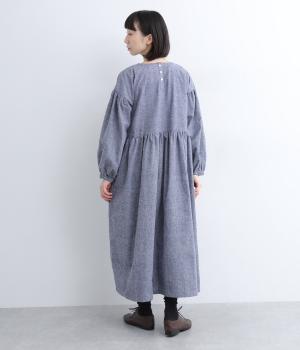 袖やウエスト切り替えにギャザーを入れてボリューム感を出したワンピースは、素材感とマッチしたガーリーでやさしい雰囲気に。長すぎず足元をのぞかせた丈感でシューズ合わせもたのしめます。後ろボタンが脱ぎ着をアシスト。