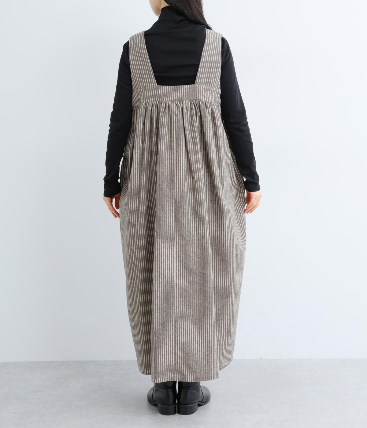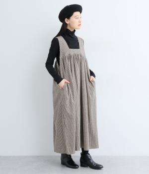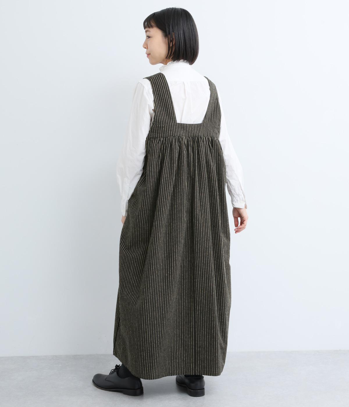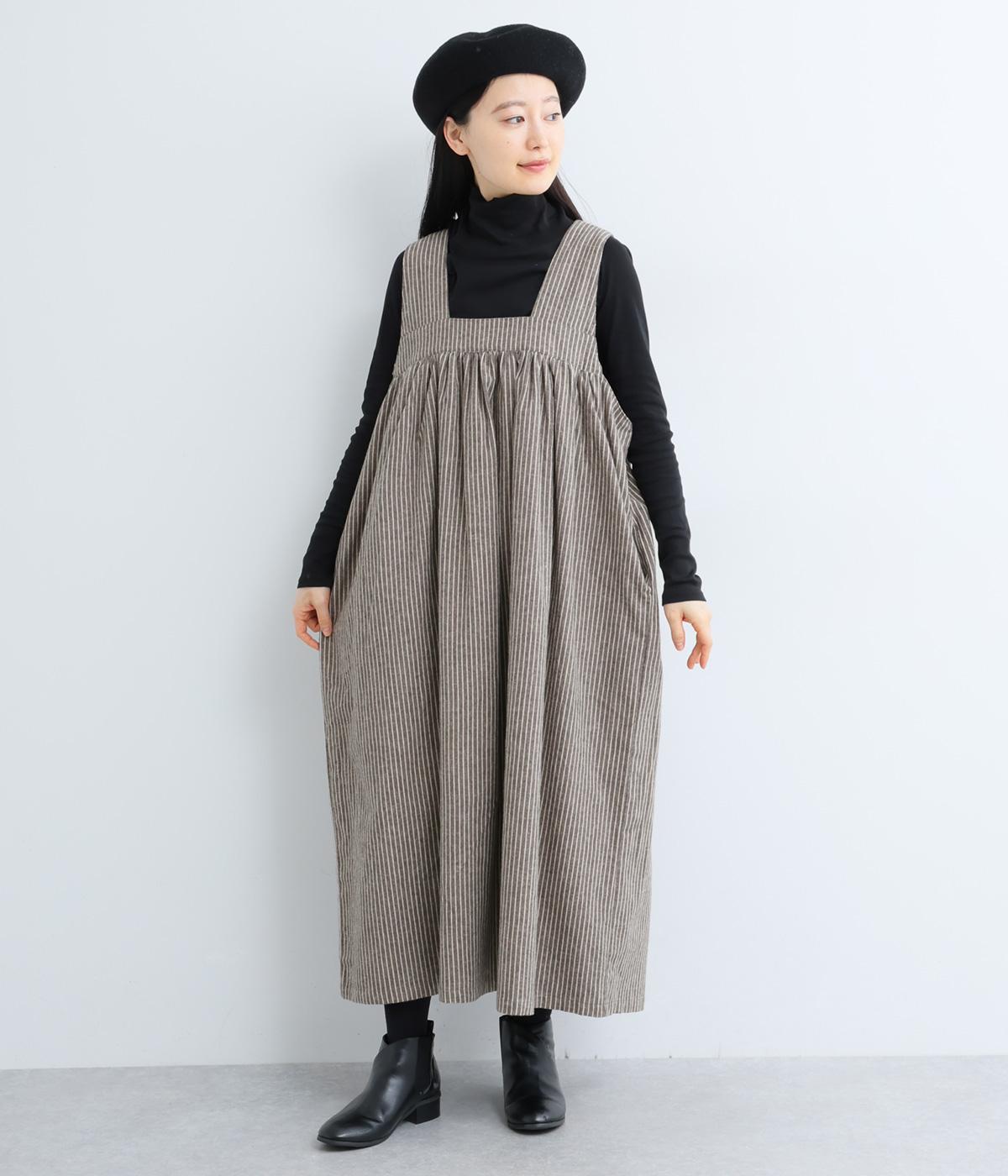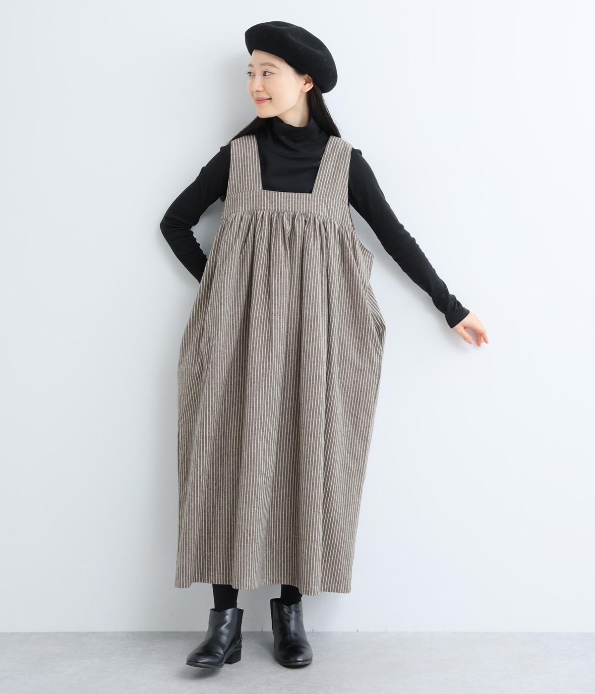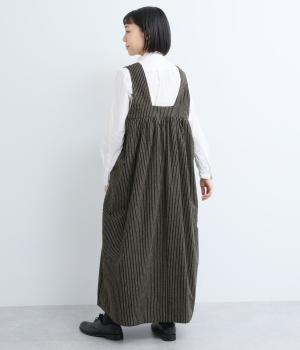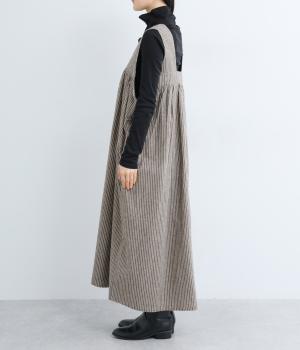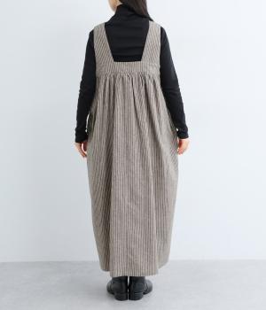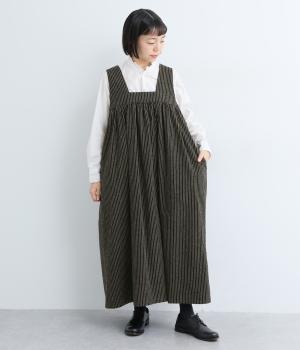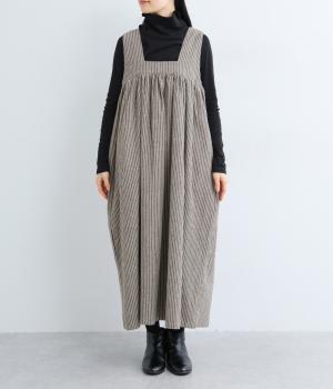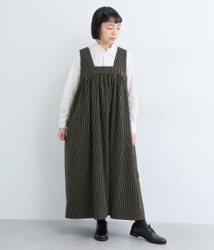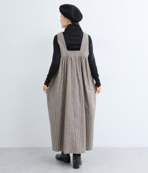 独特のやさしい印象を醸す生地感や、ギャザーを寄せたボリューム感がアイキャッチになるジャンパースカート。丸みのあるシルエットや太めの肩ストラップでカジュアルライクに仕上げました。あきも広くトップス合わせもイージー。