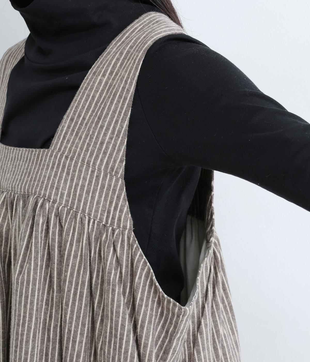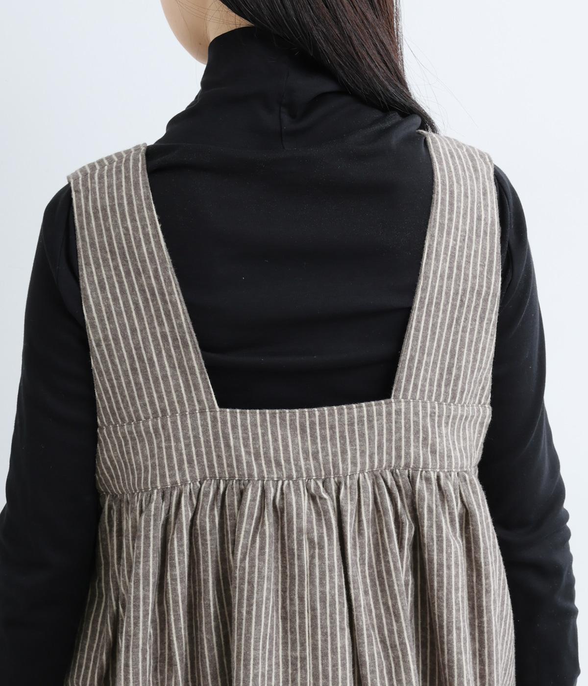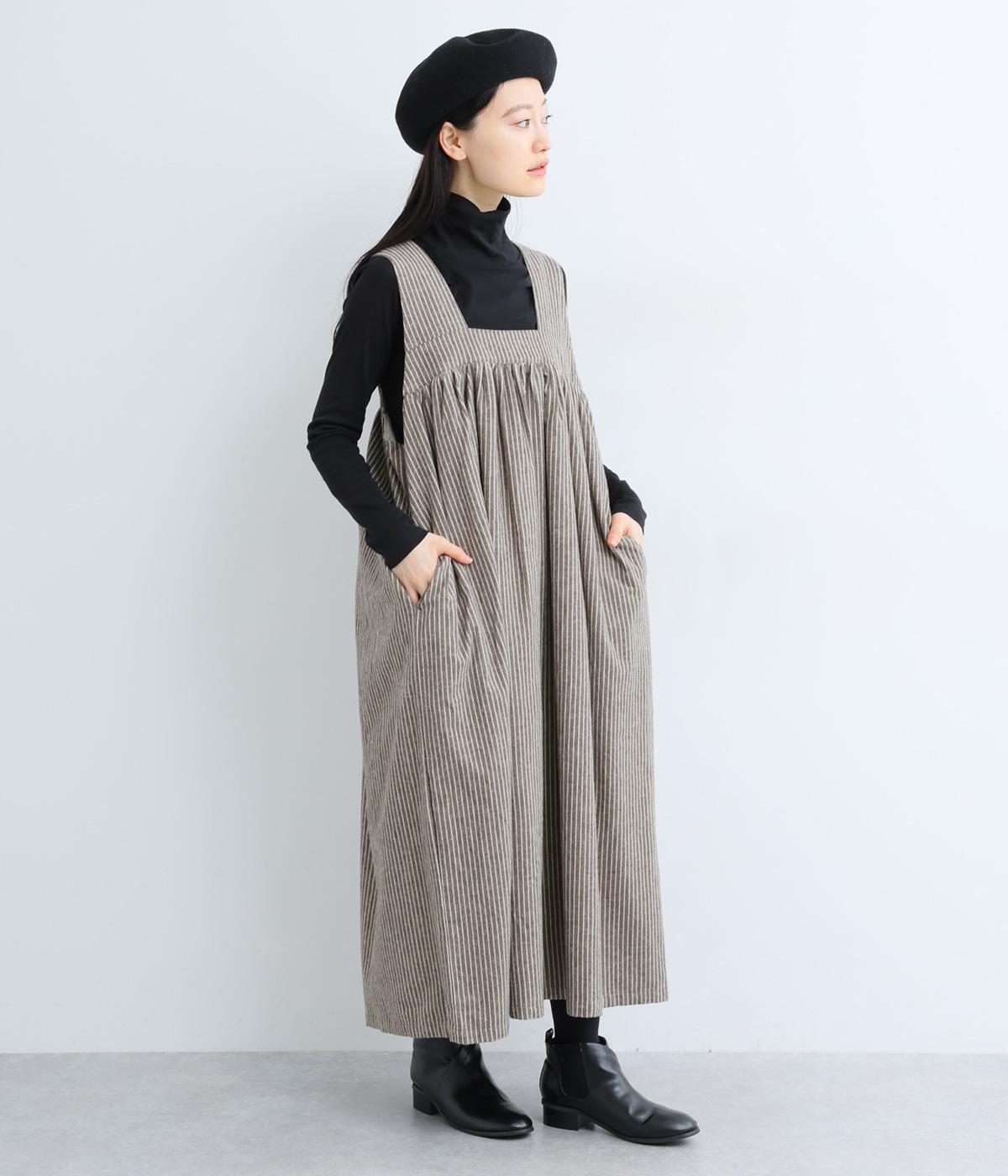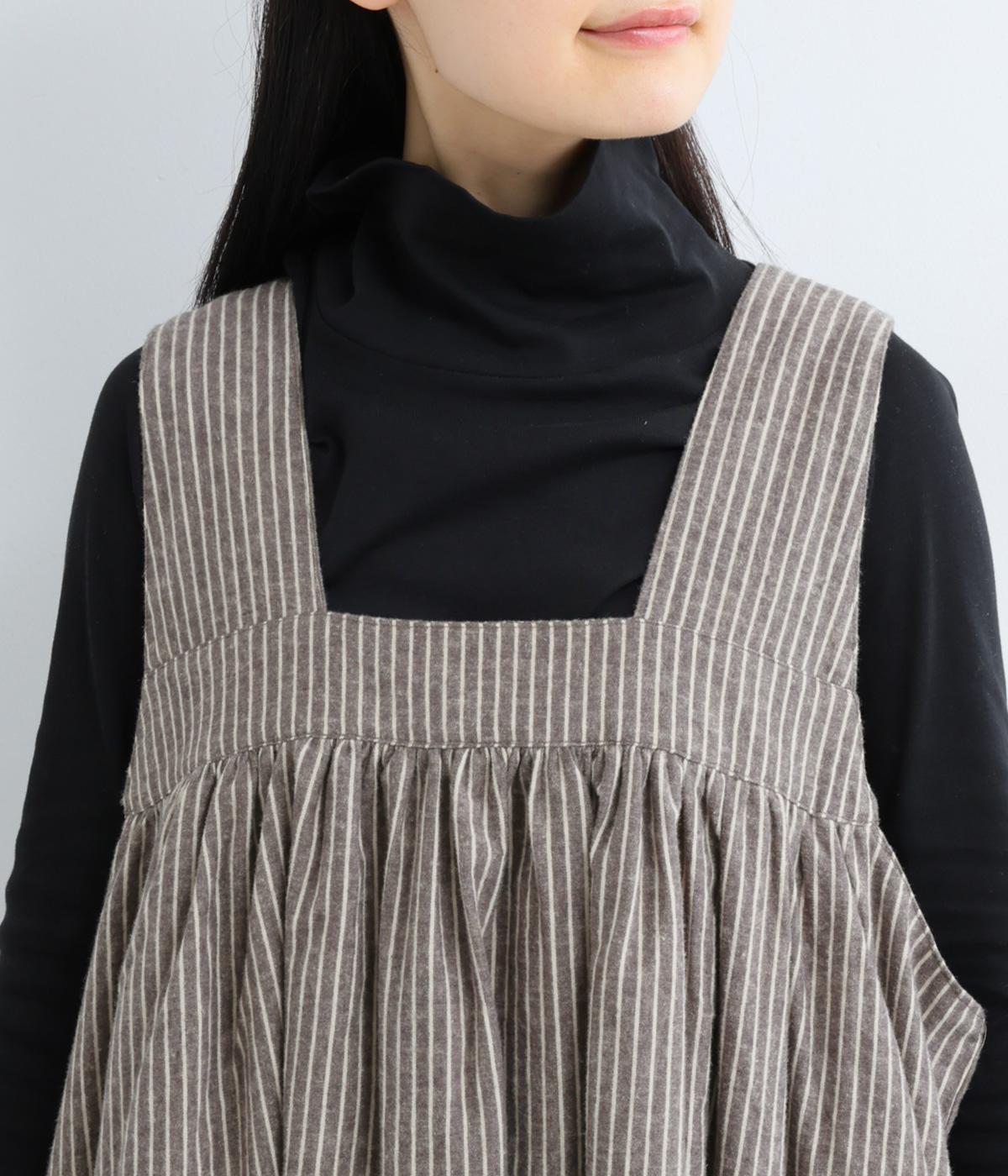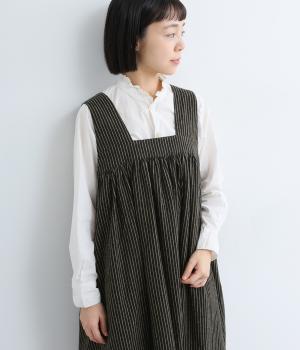 独特のやさしい印象を醸す生地感や、ギャザーを寄せたボリューム感がアイキャッチになるジャンパースカート。丸みのあるシルエットや太めの肩ストラップでカジュアルライクに仕上げました。あきも広くトップス合わせもイージー。
