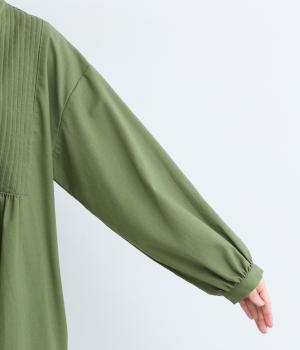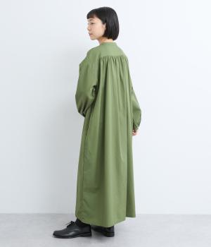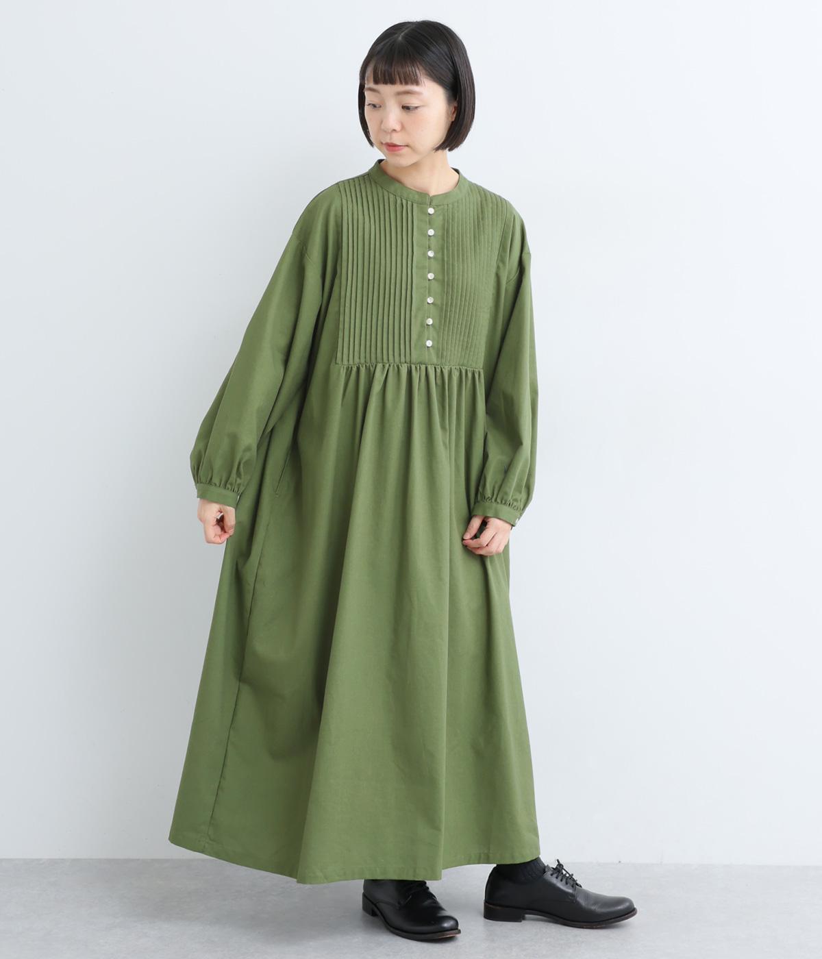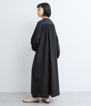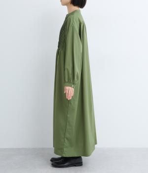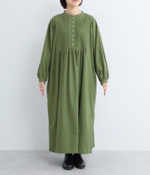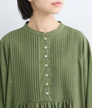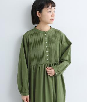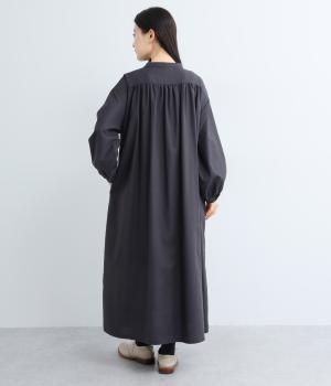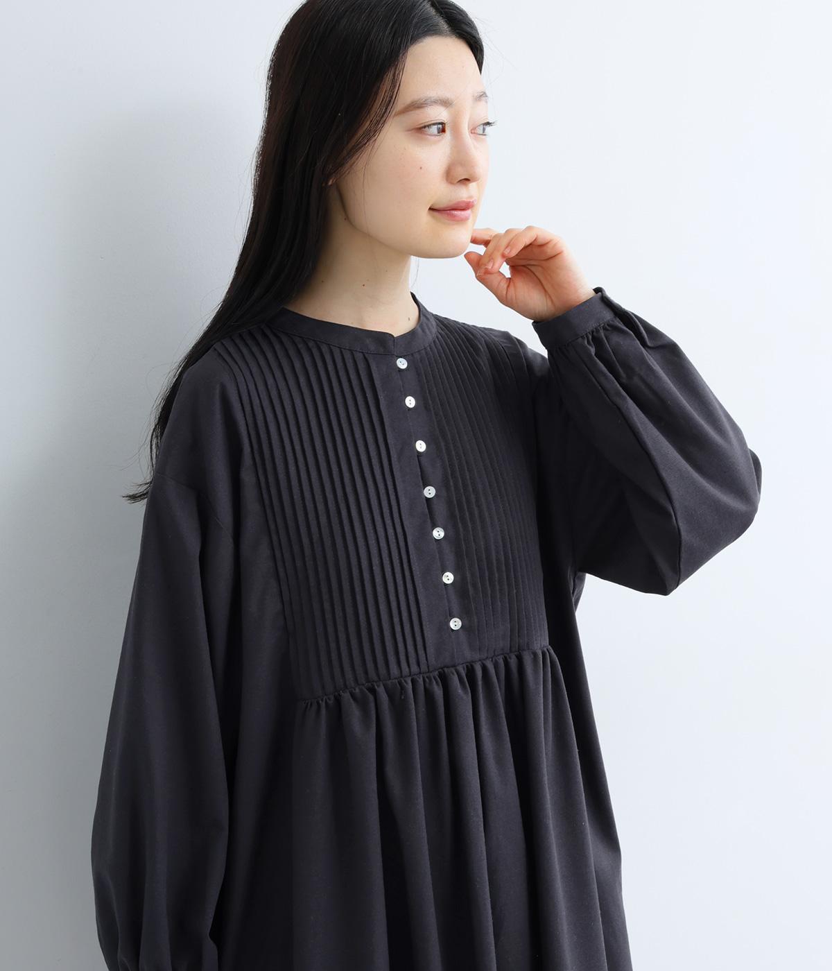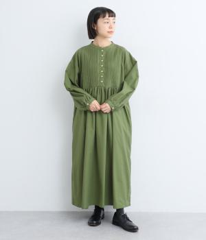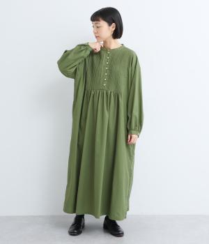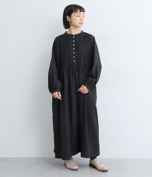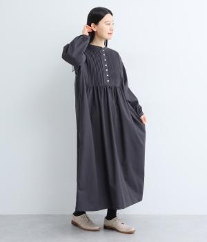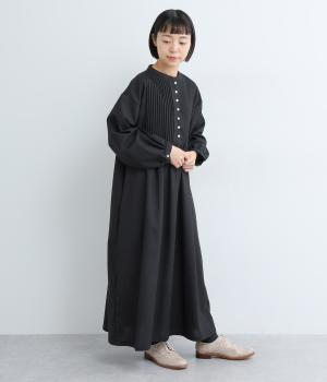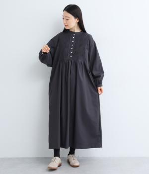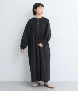 ヘンリーあきのワンピースは身頃のピンタックや切り替えギャザーでガーリーテイストにまとめました。ゆったりとしたボリュームのあるロング丈で着映え力も高く、一枚でコーディネートが決まります。ふっくらした袖も◎。