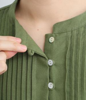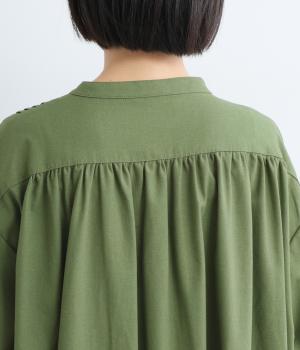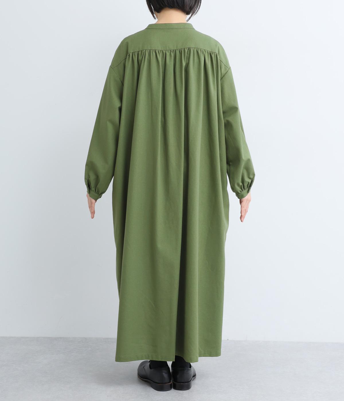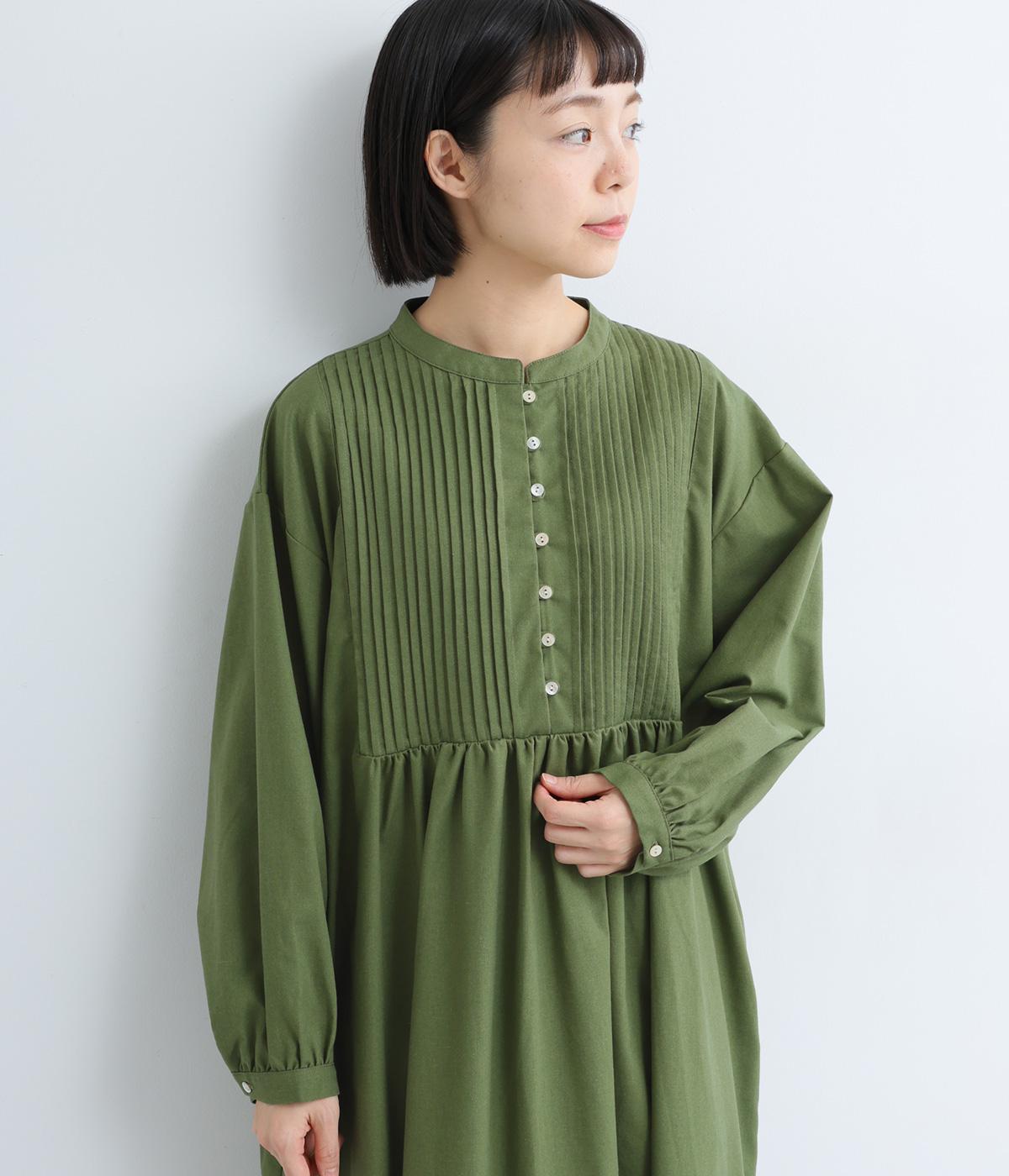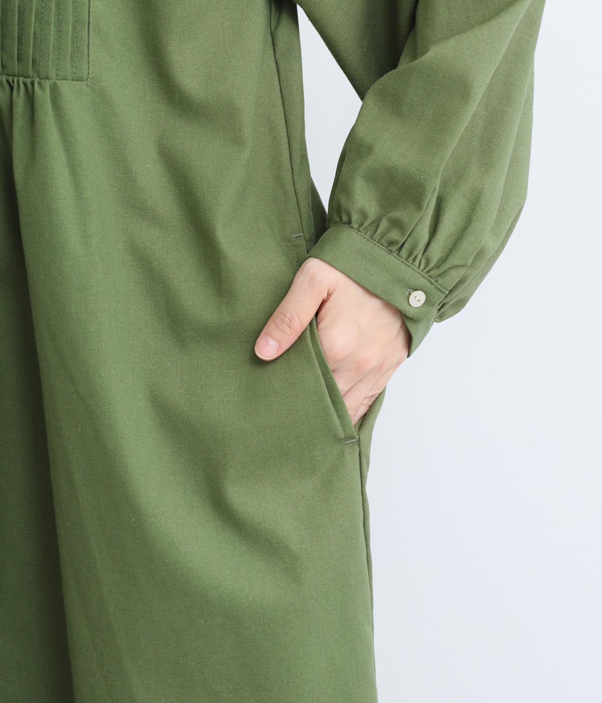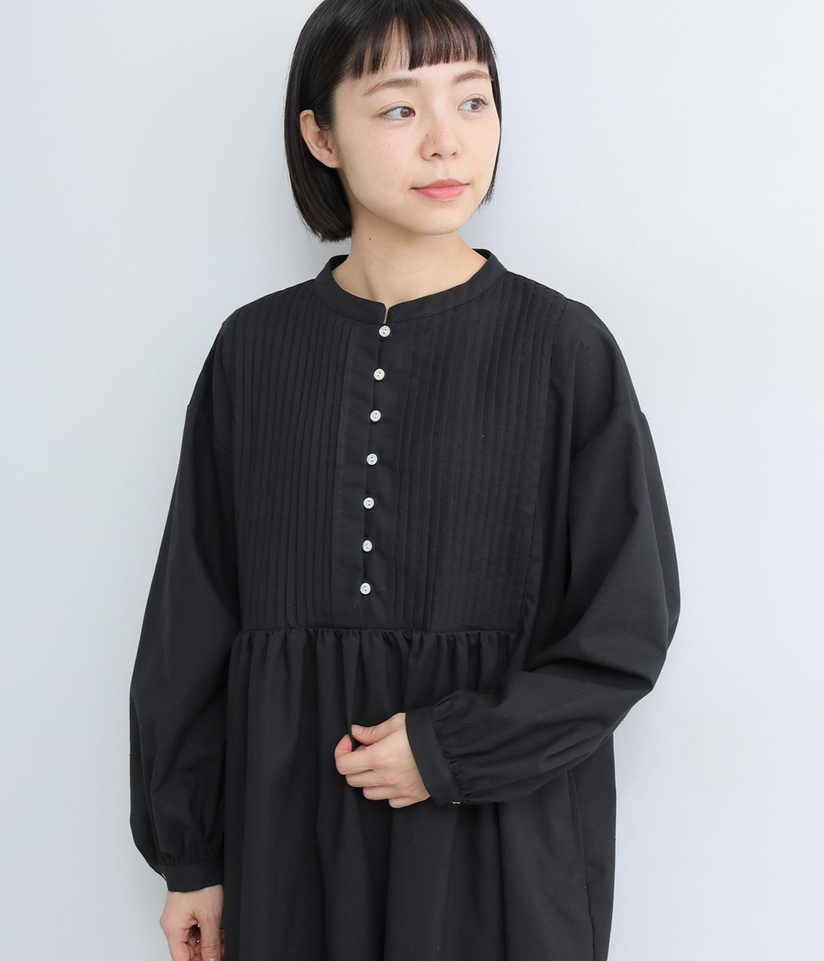 ヘンリーあきのワンピースは身頃のピンタックや切り替えギャザーでガーリーテイストにまとめました。ゆったりとしたボリュームのあるロング丈で着映え力も高く、一枚でコーディネートが決まります。ふっくらした袖も◎。