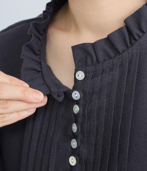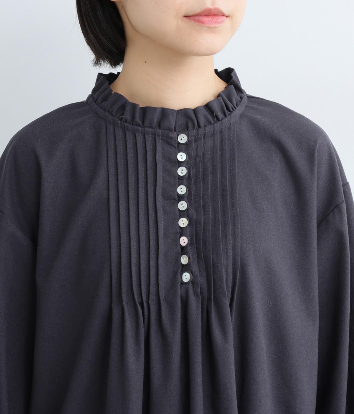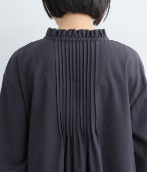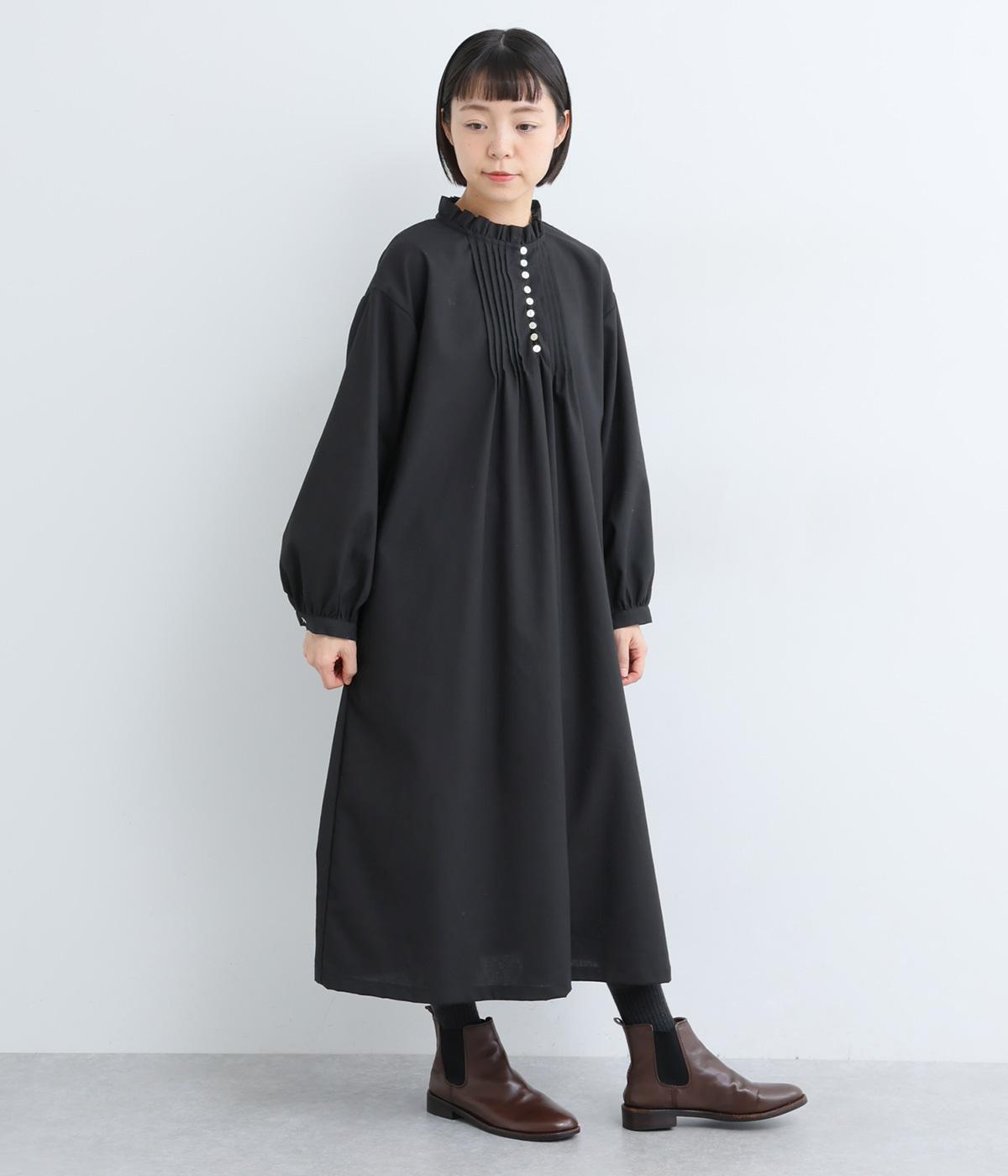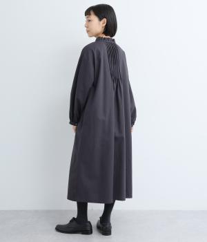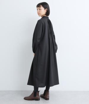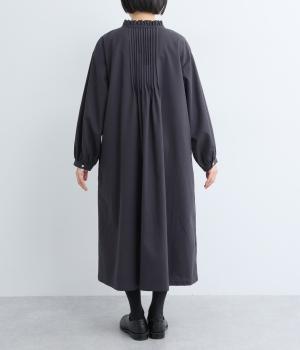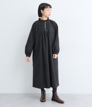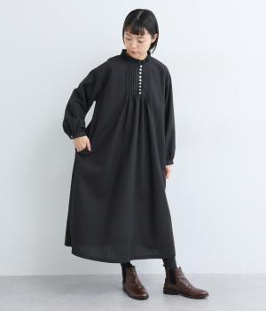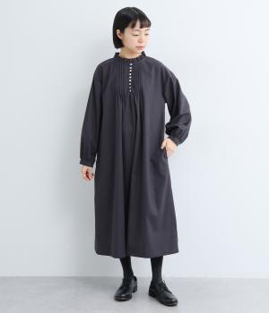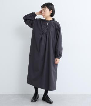ピンタックやフリルカラーで上部分にポイントを持たせたワンピース。ゆったりとしていて着心地よく、袖もギャザーを寄せてボリューム感を出しました。光沢のあるシェルの多ボタンがちょうどいいアクセントに。