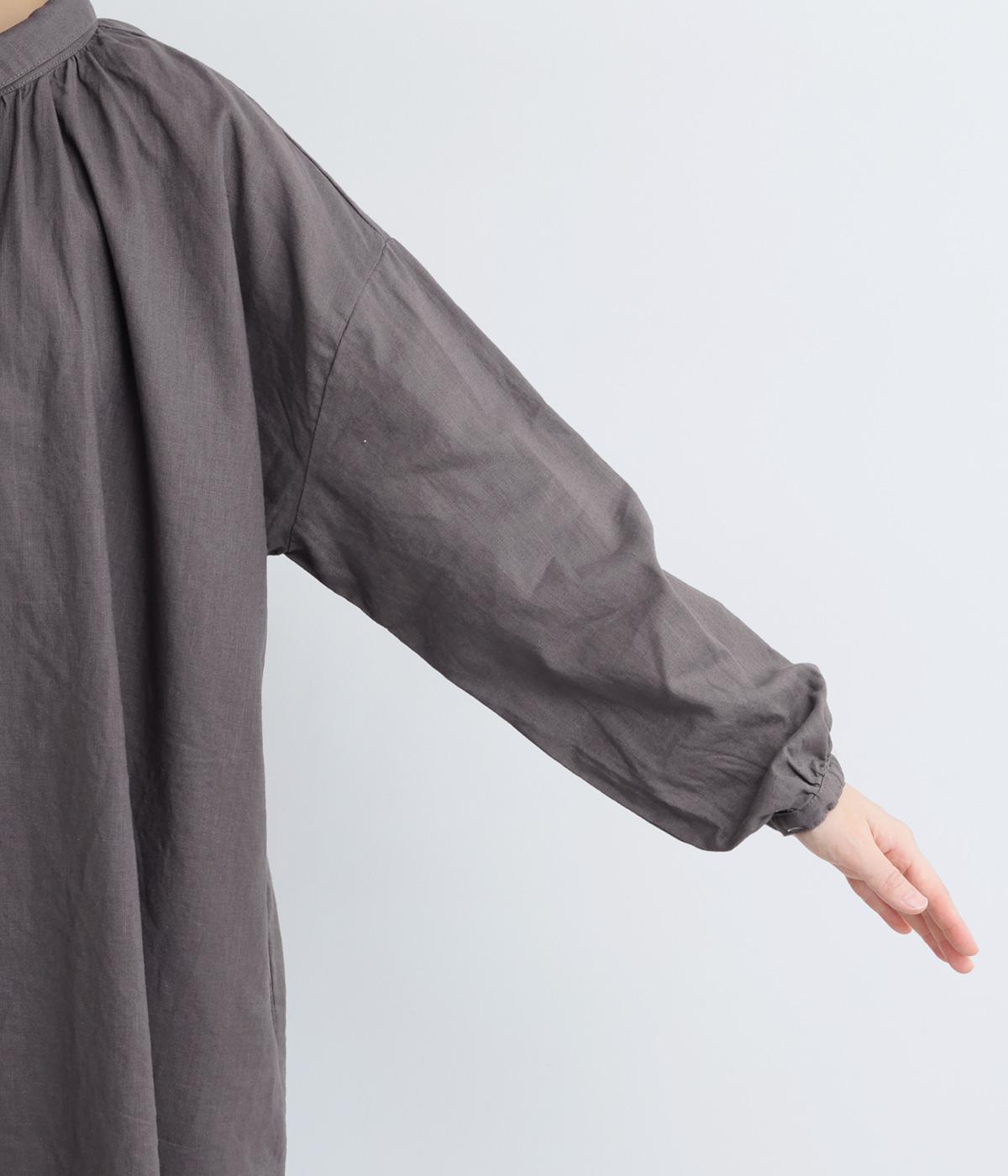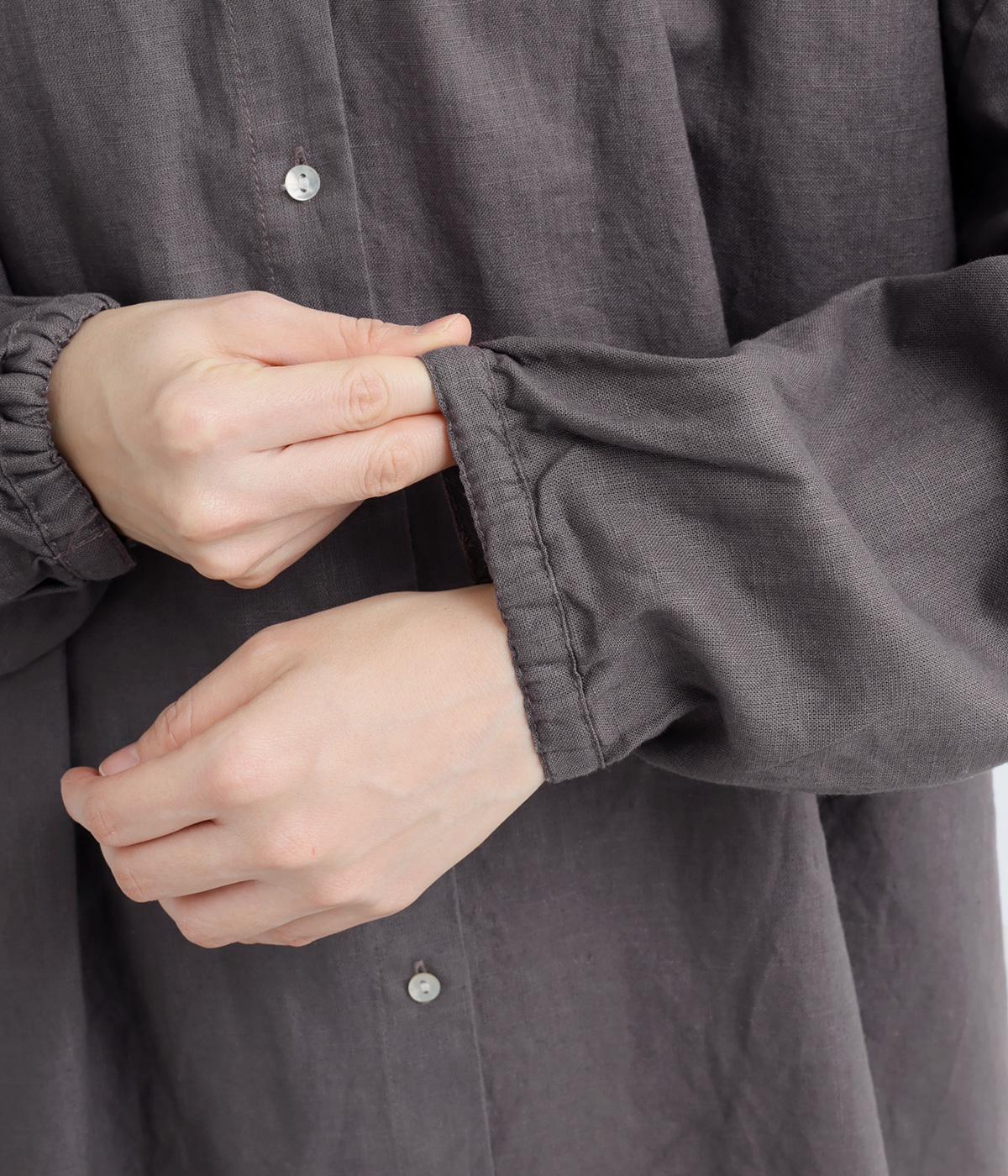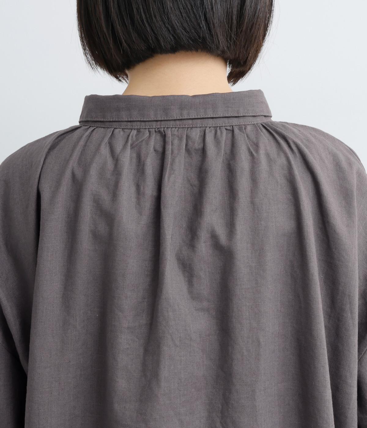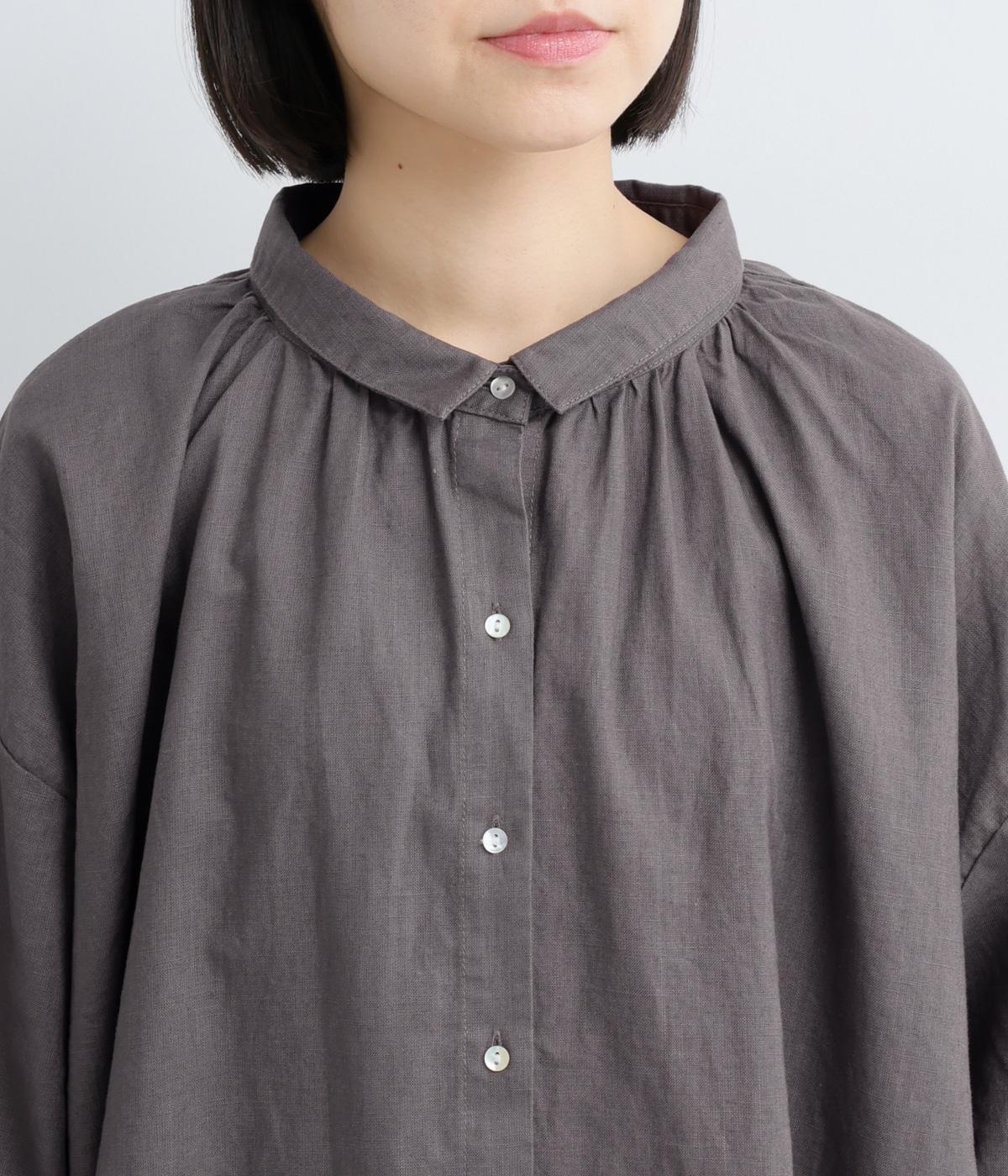 小さな襟が顔まわりをすっきりと見せ、襟ぐりにたっぷり寄せたギャザーが立体感を演出。ゆったりとした着心地ながら、縦に並ぶボタンが全体を引き締め、バランスよくまとまります。袖口はゴム仕様で、動きのある着こなしをたのしめるのも◎。前をあければ羽織り風にも使え、コーディネートの幅が広がります。