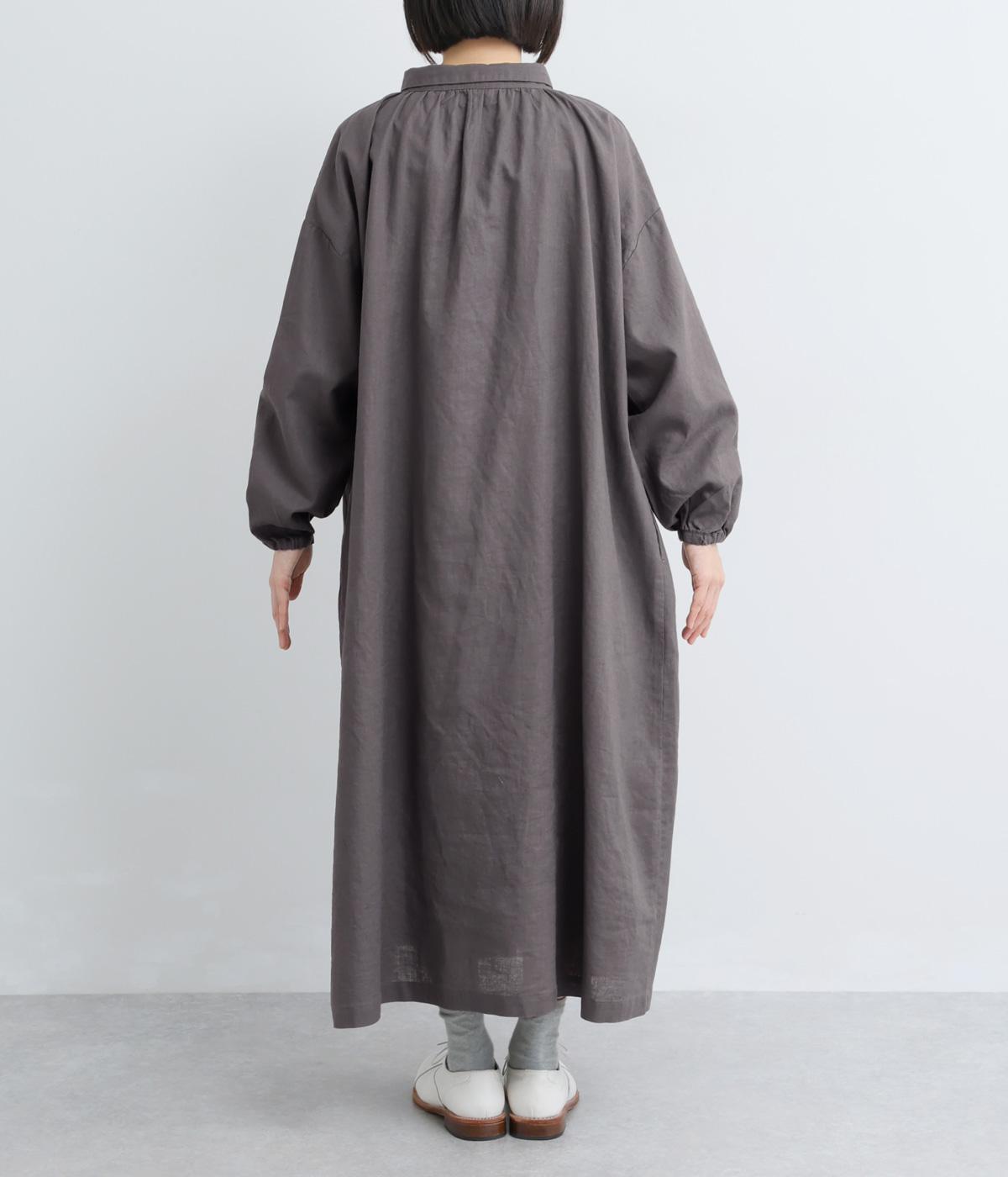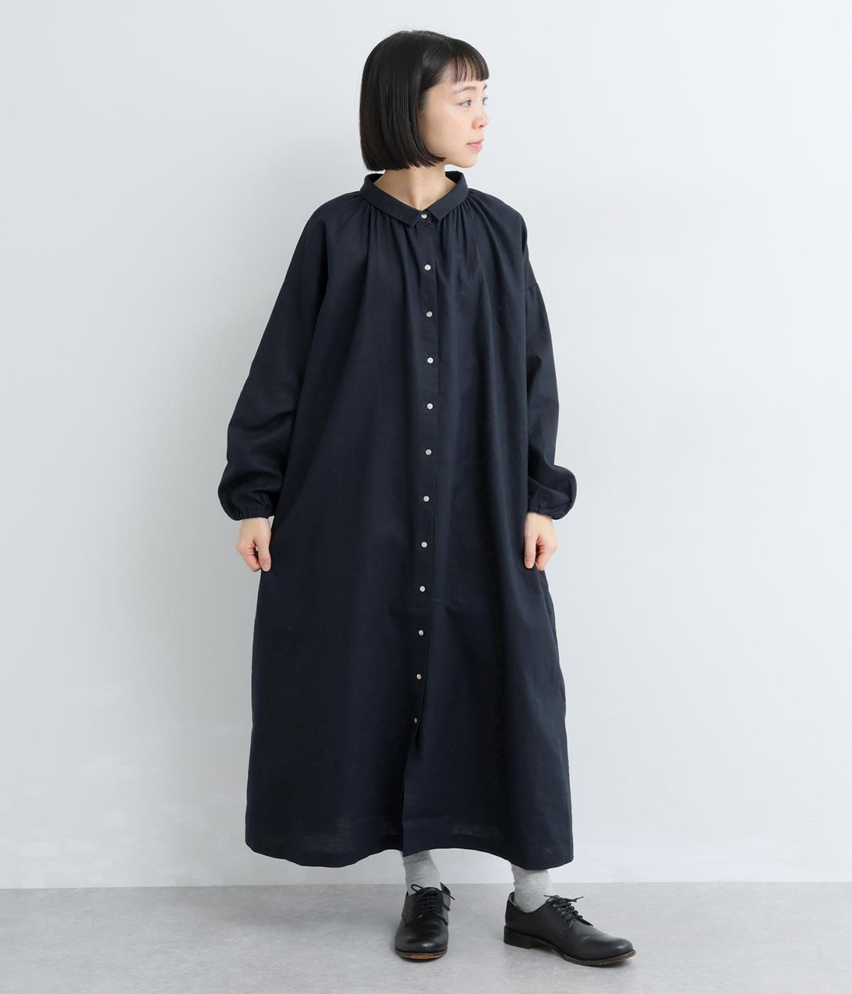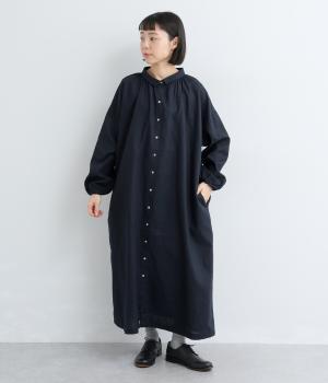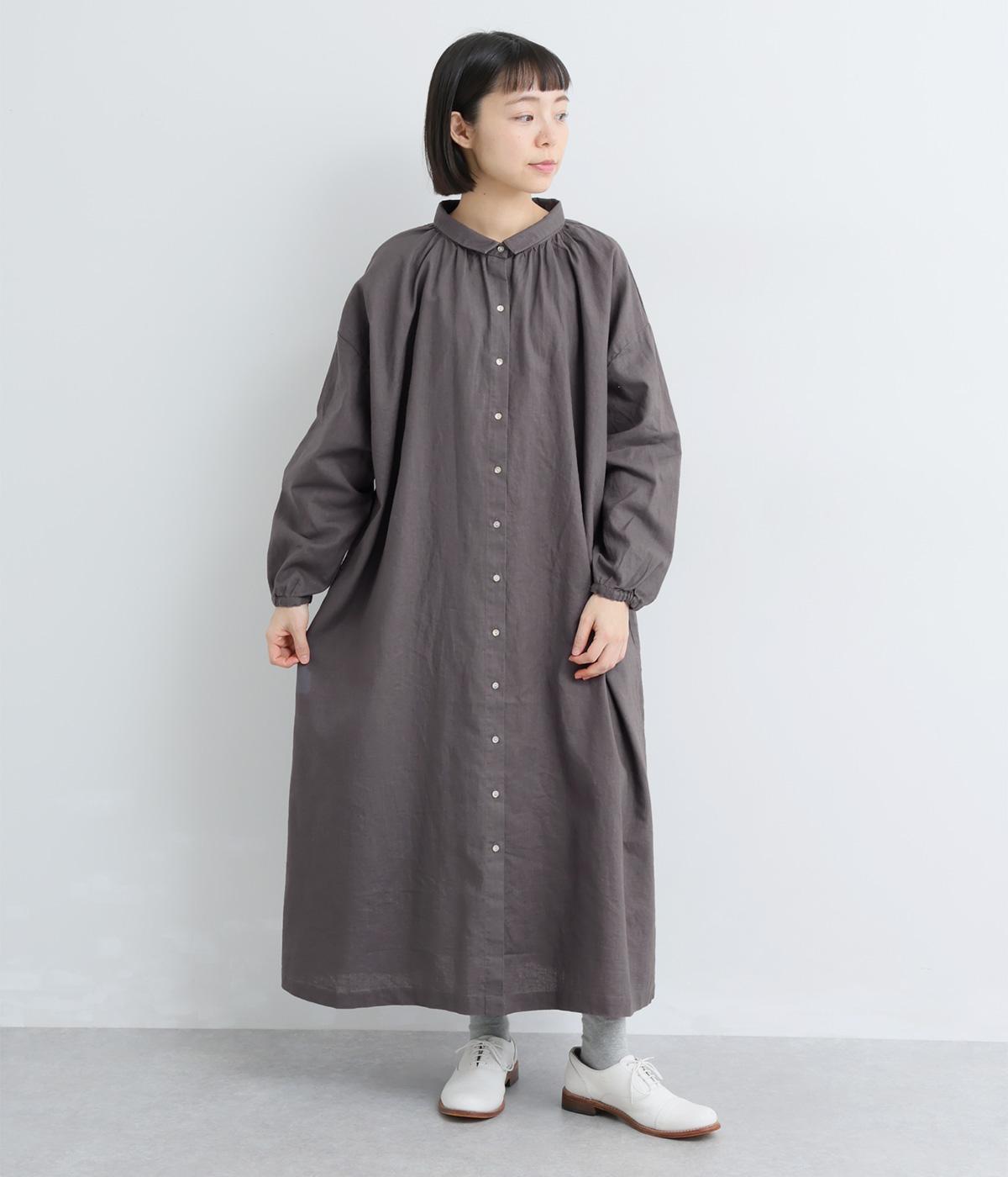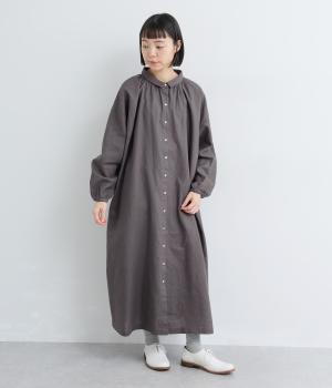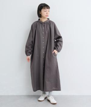 小さな襟が顔まわりをすっきりと見せ、襟ぐりにたっぷり寄せたギャザーが立体感を演出。ゆったりとした着心地ながら、縦に並ぶボタンが全体を引き締め、バランスよくまとまります。袖口はゴム仕様で、動きのある着こなしをたのしめるのも◎。前をあければ羽織り風にも使え、コーディネートの幅が広がります。