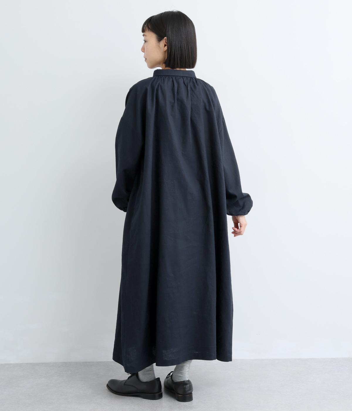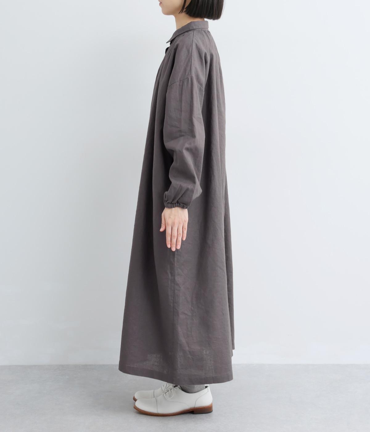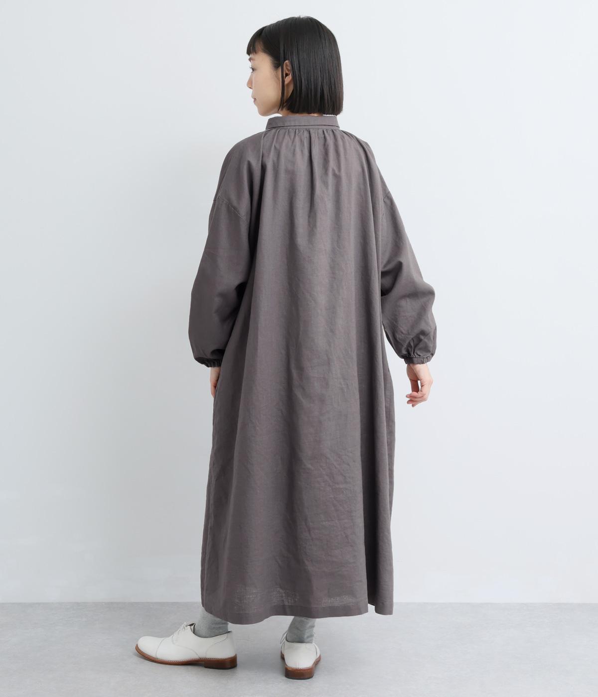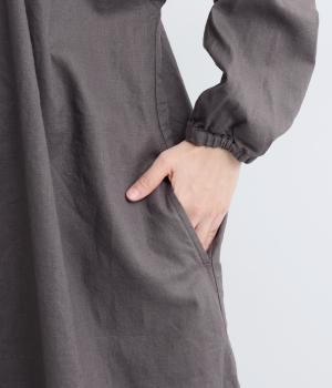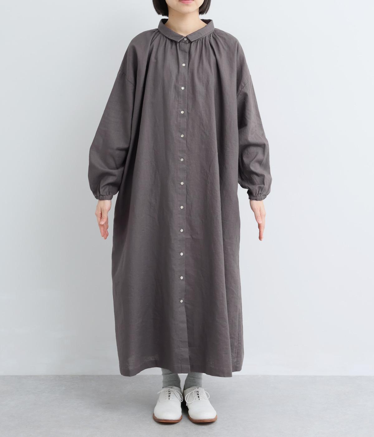 小さな襟が顔まわりをすっきりと見せ、襟ぐりにたっぷり寄せたギャザーが立体感を演出。ゆったりとした着心地ながら、縦に並ぶボタンが全体を引き締め、バランスよくまとまります。袖口はゴム仕様で、動きのある着こなしをたのしめるのも◎。前をあければ羽織り風にも使え、コーディネートの幅が広がります。